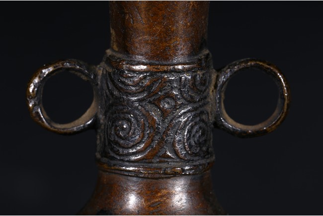 Each of bulbous form,neck flanked by circular handles,decorated with scrolled pattern. Qing Dynasty period.