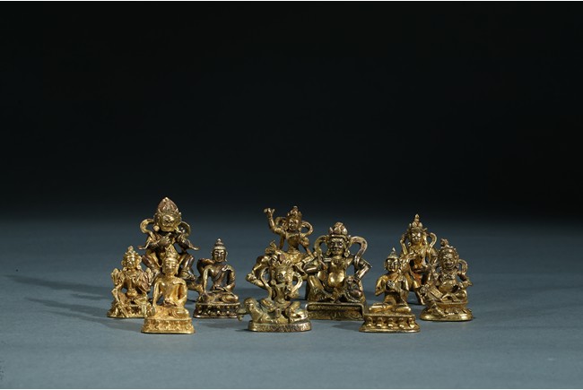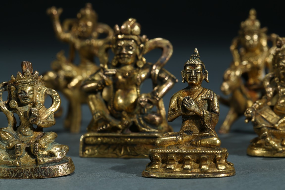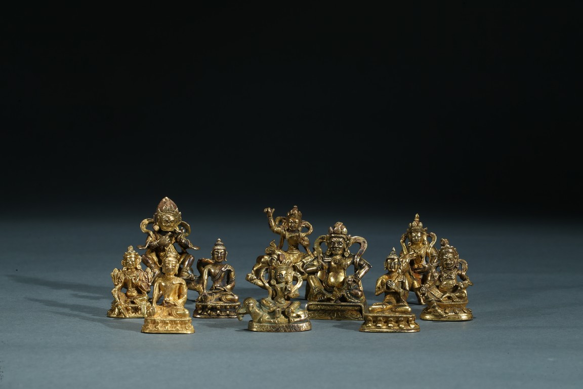 The group consists of ten small gilt bronze bodhisattva figures, including jambhala, manjusri, shakyamuni, and others. Ming/Qing Dynasty period.