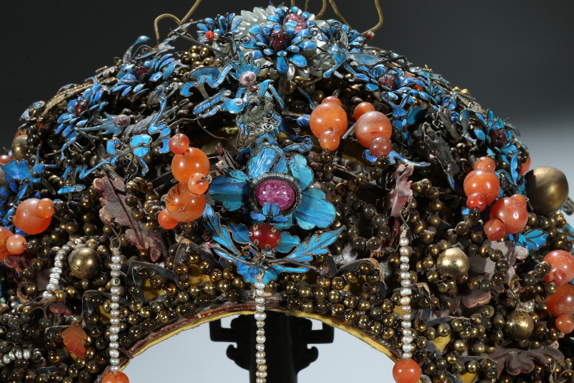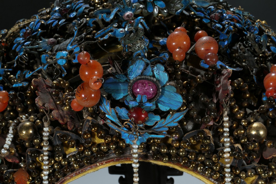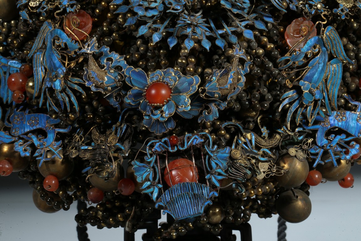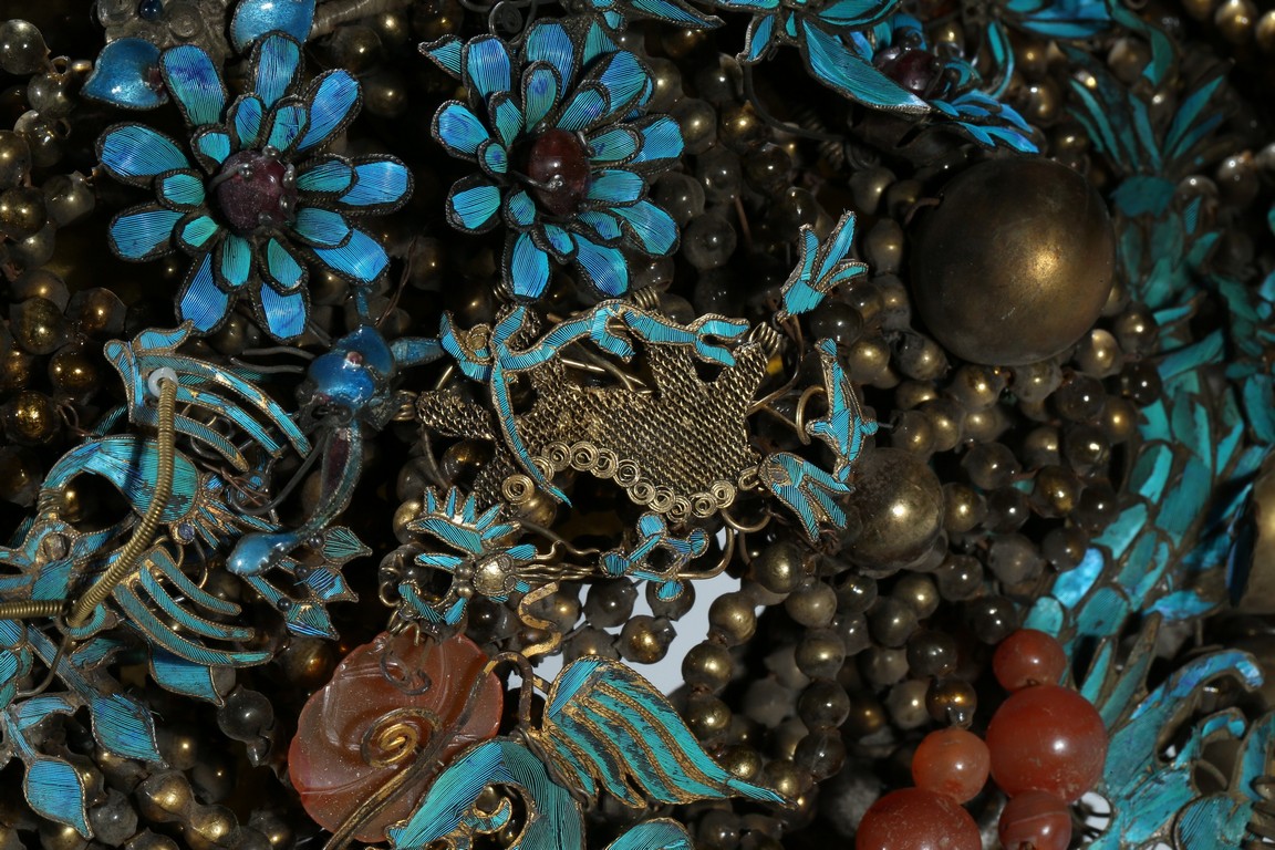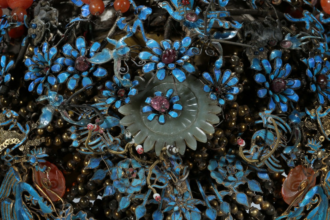 Possibly from Qing Imperial court, the headdress is exquisitely ornate with gilt bronze filigree covered with kingfisher blue worked into various shapes, including dragon,qilin,phoenix, flowers, further inlaid with tourmaline, pearl bead, agate, and other semi-precious stones. Qing Dynasty period.