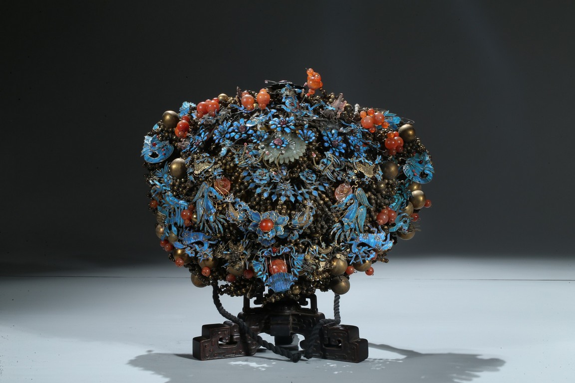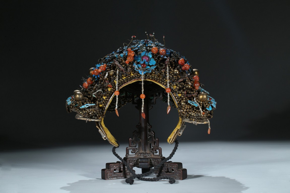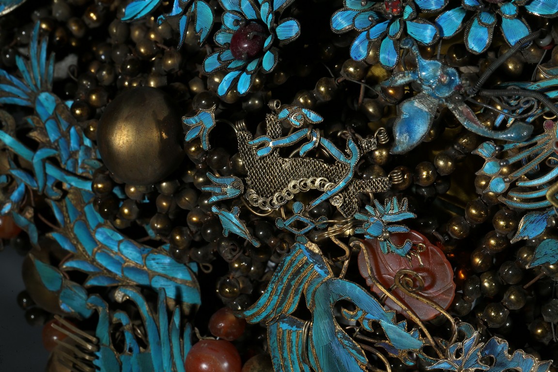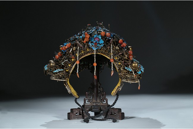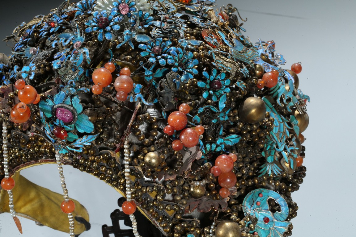 Possibly from Qing Imperial court, the headdress is exquisitely ornate with gilt bronze filigree covered with kingfisher blue worked into various shapes, including dragon,qilin,phoenix, flowers, further inlaid with tourmaline, pearl bead, agate, and other semi-precious stones. Qing Dynasty period.