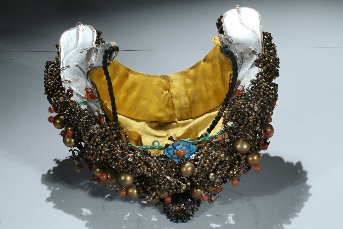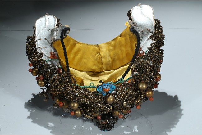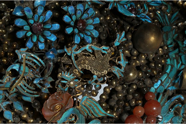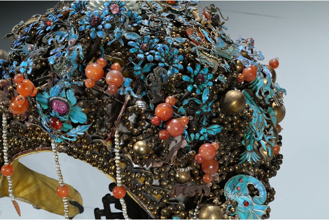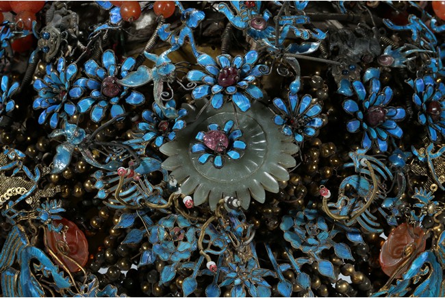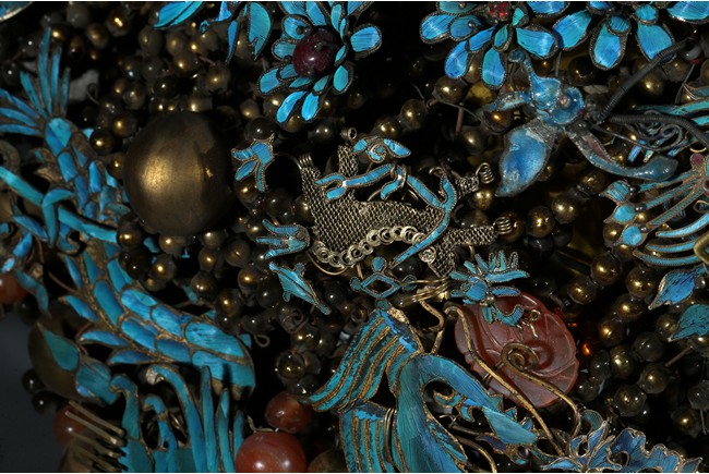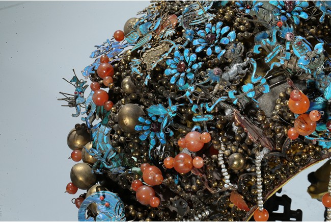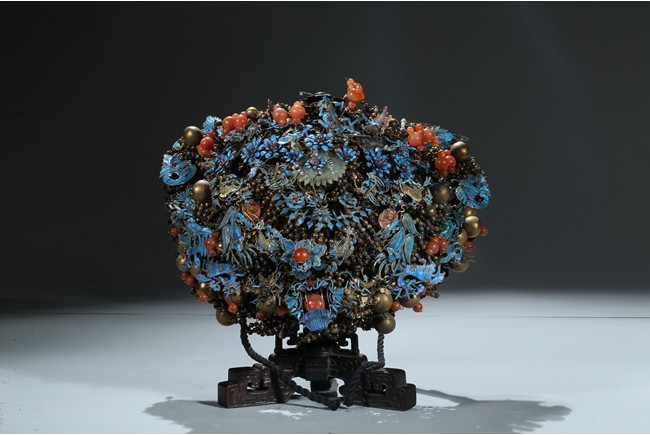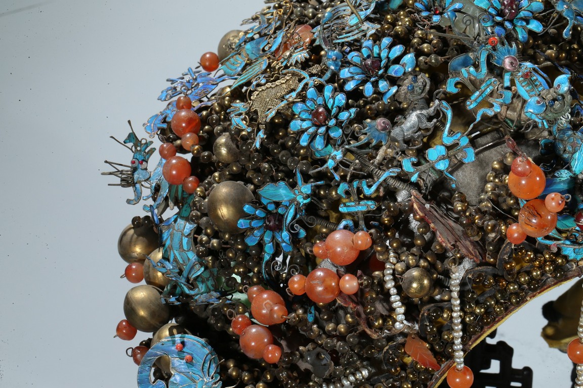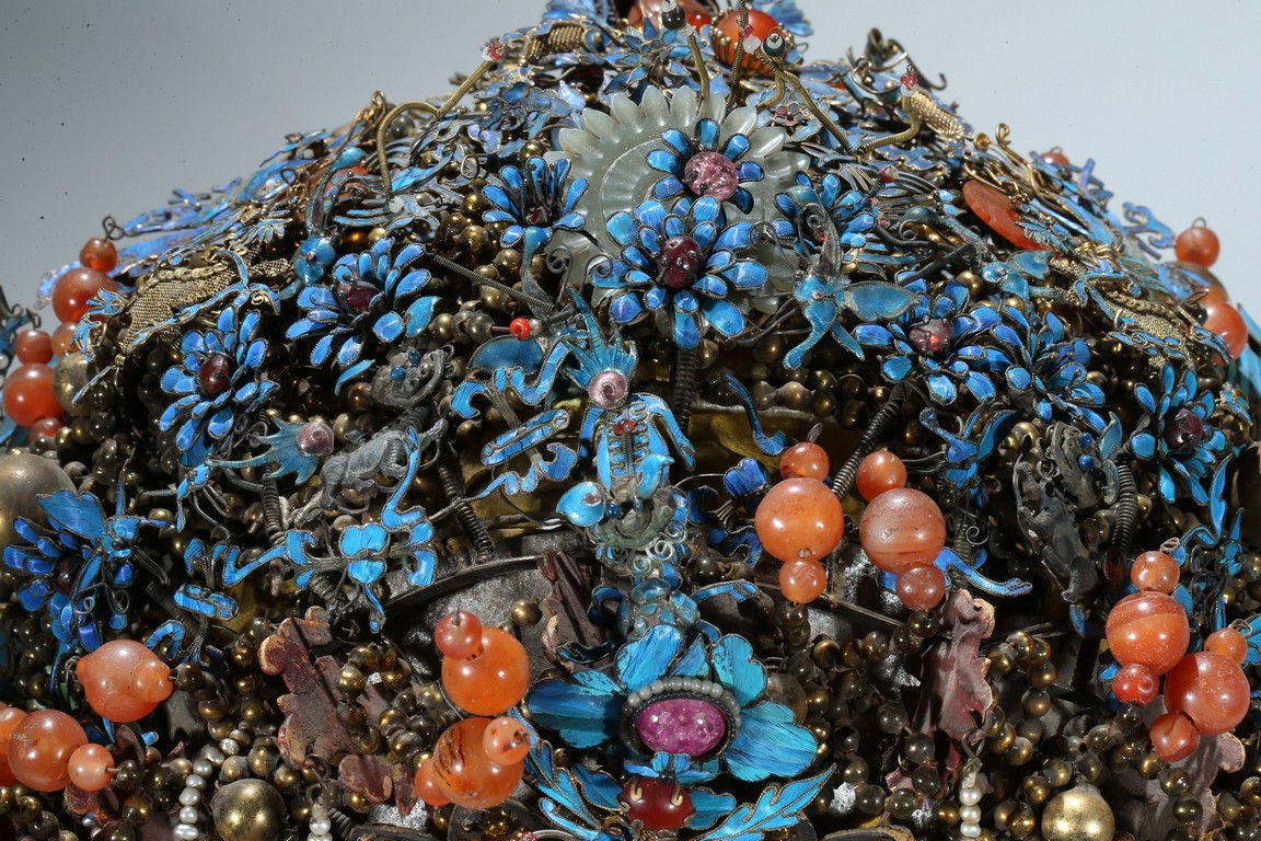 Possibly from Qing Imperial court, the headdress is exquisitely ornate with gilt bronze filigree covered with kingfisher blue worked into various shapes, including dragon,qilin,phoenix, flowers, further inlaid with tourmaline, pearl bead, agate, and other semi-precious stones. Qing Dynasty period.