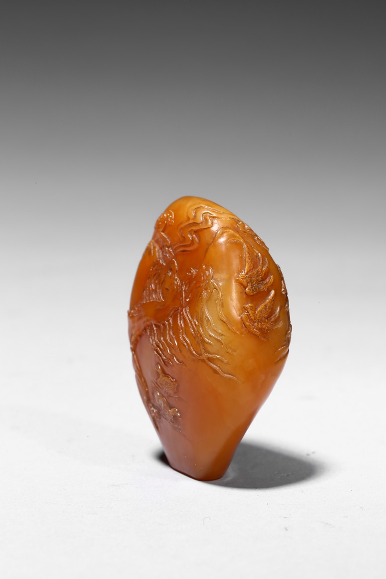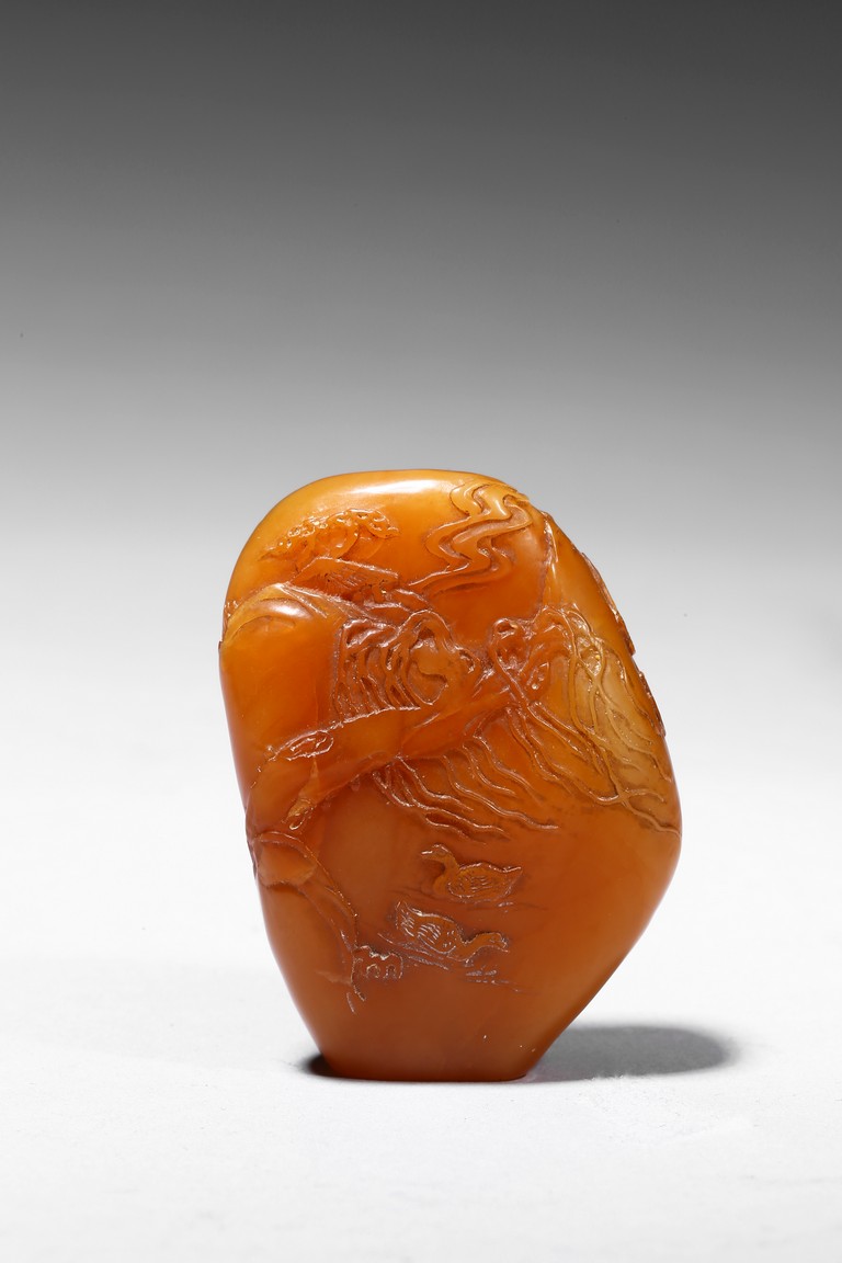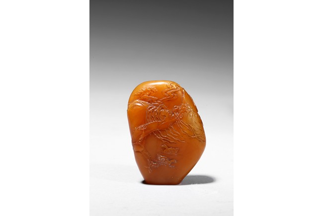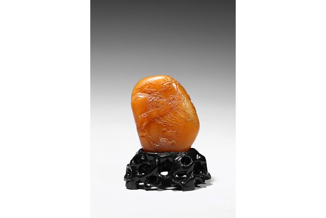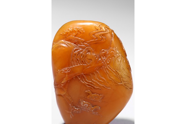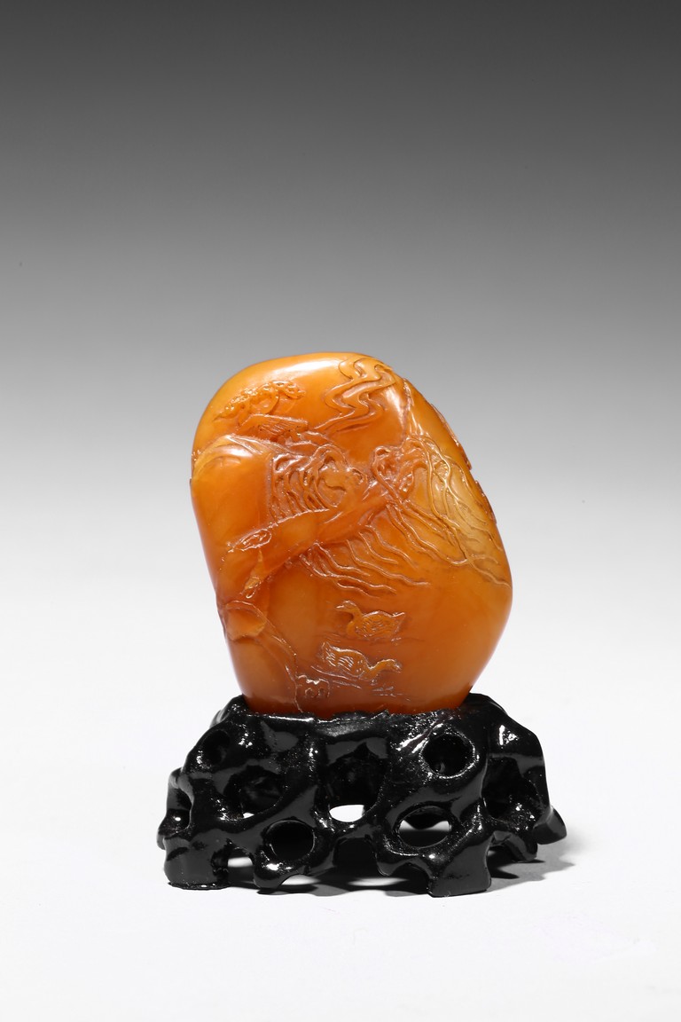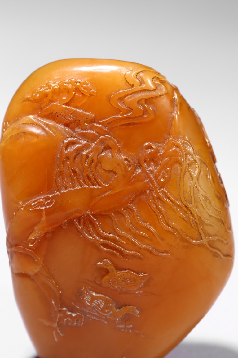 The boulder carved in shallow relief depicting a riverscape scene with ducks swimming under trees by the riverbank, all supported on a wood stand.