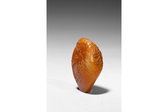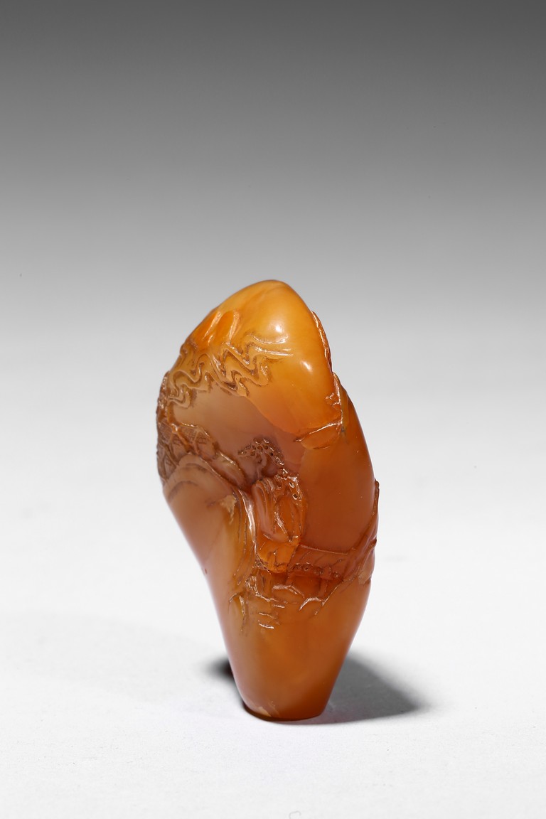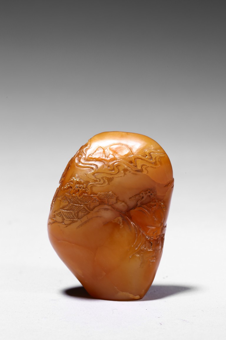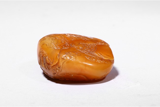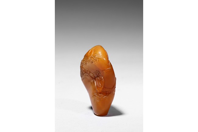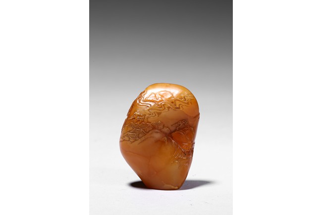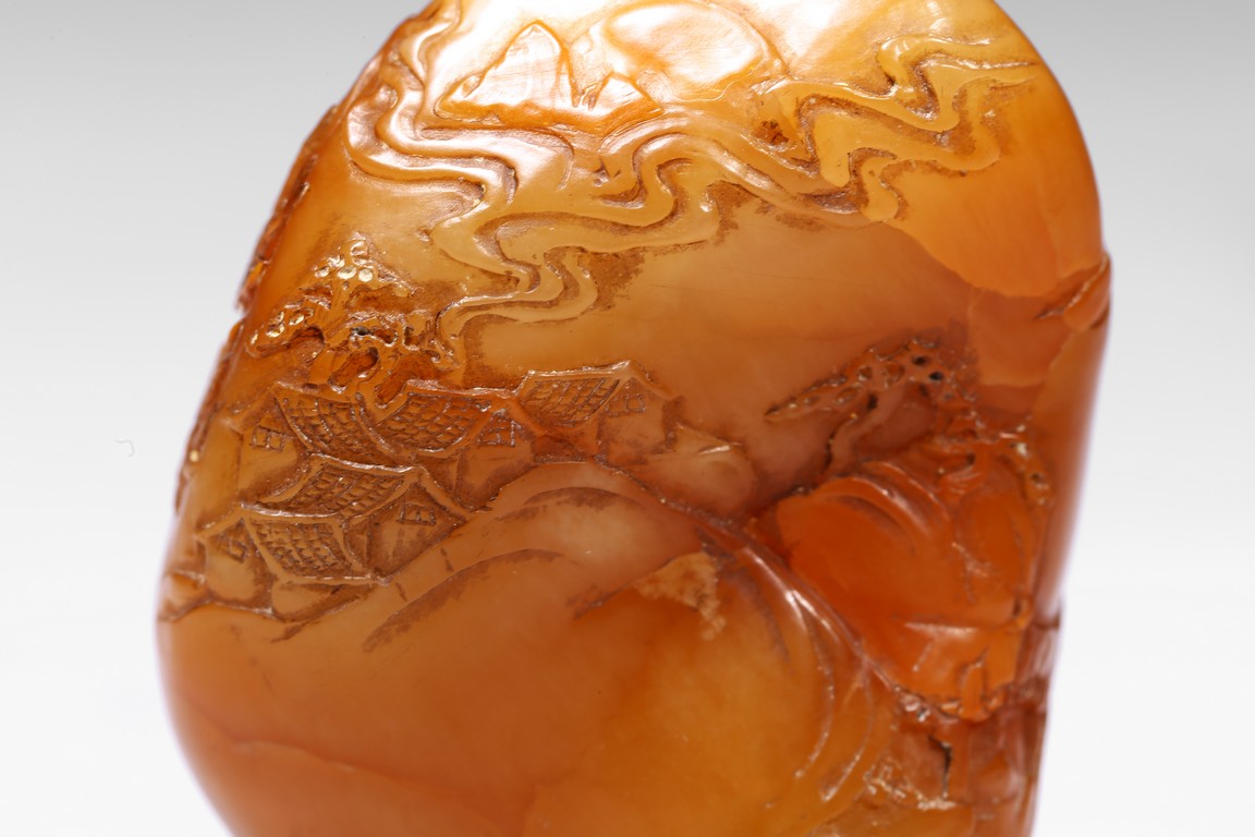 The boulder carved in shallow relief depicting a riverscape scene with ducks swimming under trees by the riverbank, all supported on a wood stand.