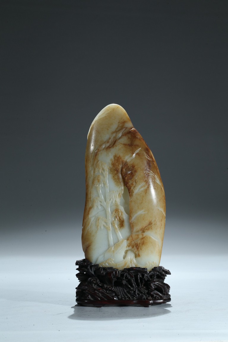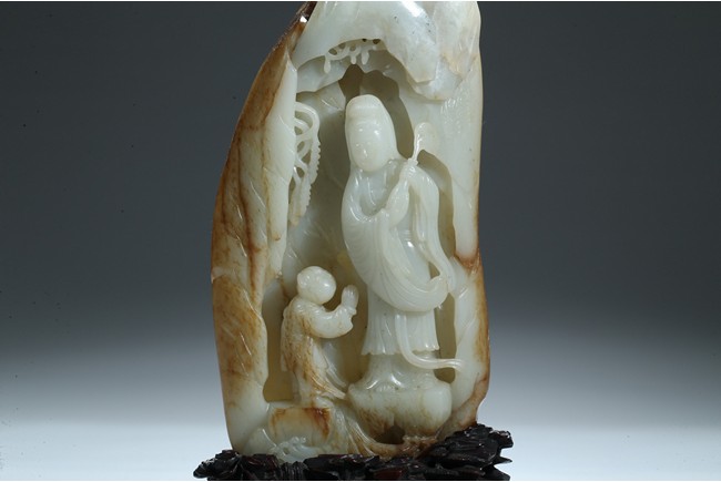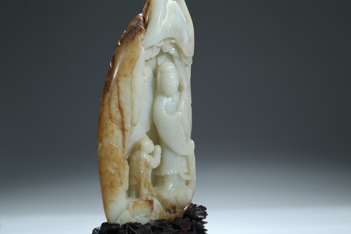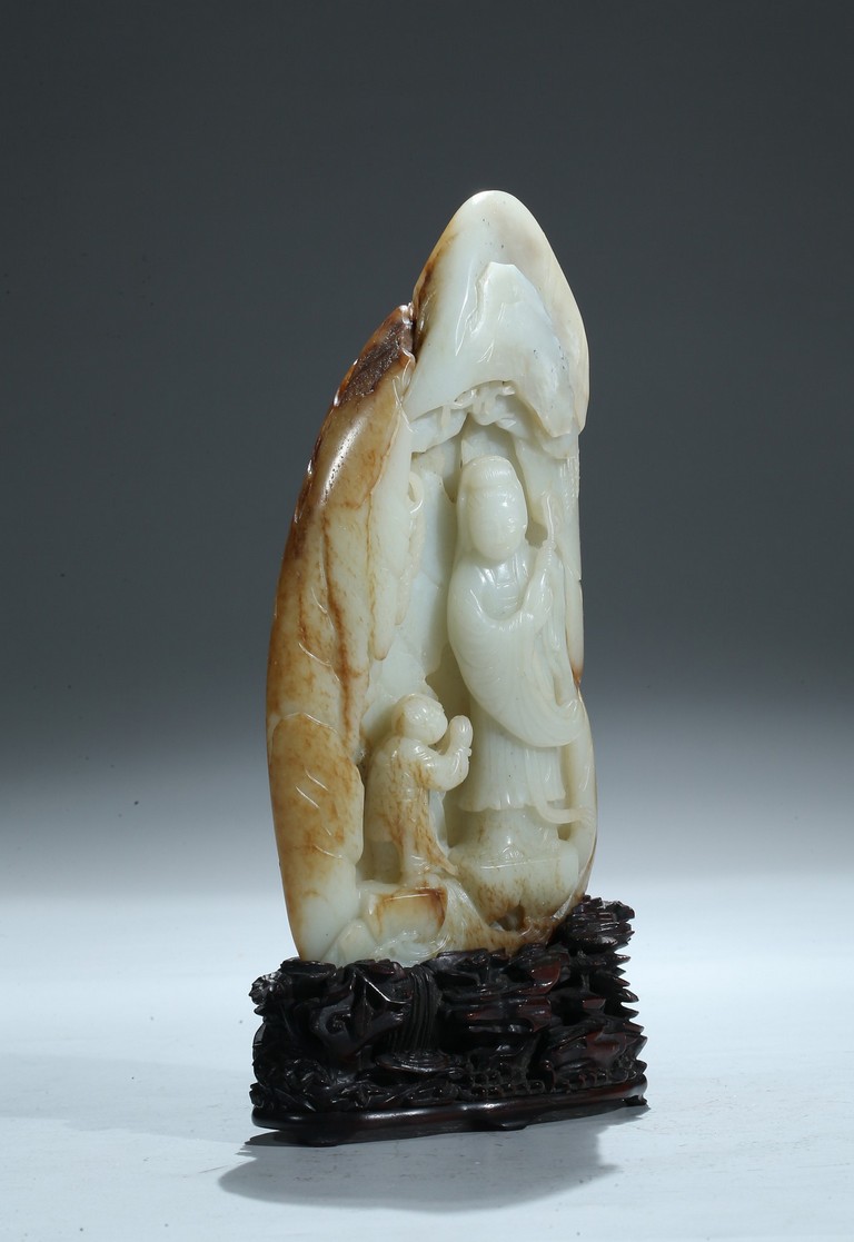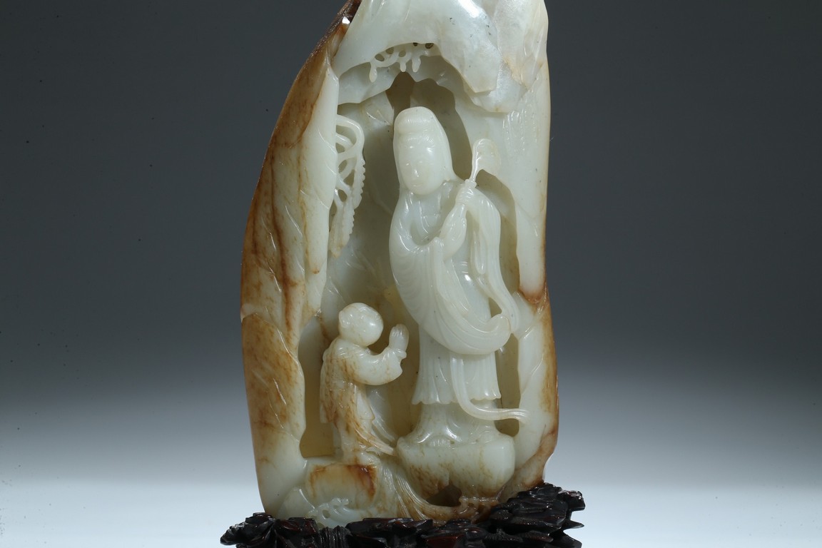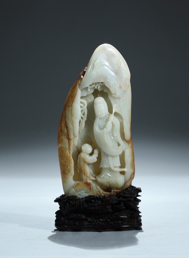 Of irregular boulder form, superbly worked to one side depicting the standing Guanyin bodhisattva wearing loosely draped robes, holding a tilted bottle on both hands containing a willow branch, with a boy bowing in a position of deference, with swelling waves crashing against the rocks below, the reverse carved with two bamboo trees issuing from the rockwork and streams of water flowing out from the rocks, the stone of smooth white color with russet skin skilfully incorporated into the design of the boulder, fitted with hardwood stand. Qing Dynasty Qianlong period.