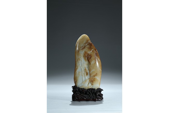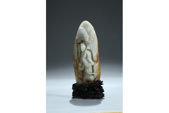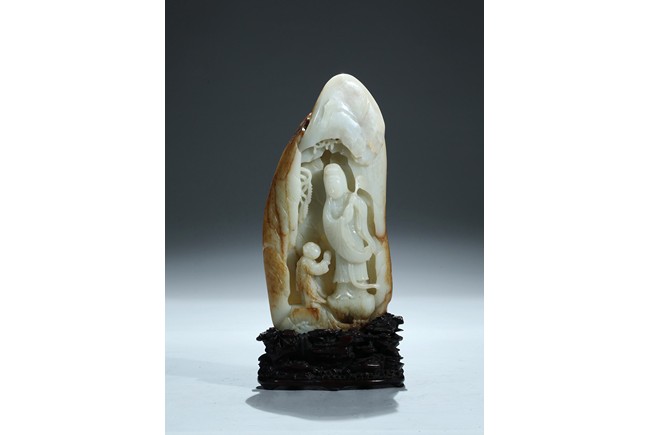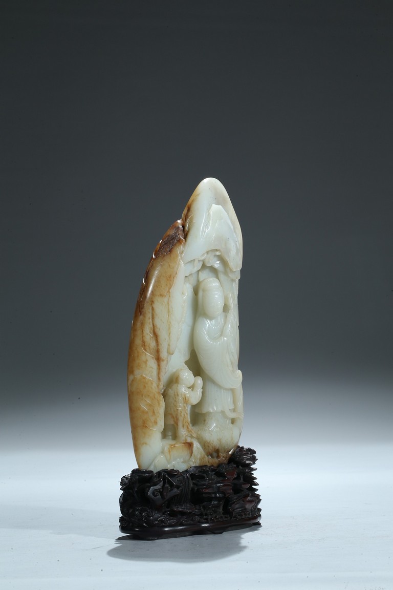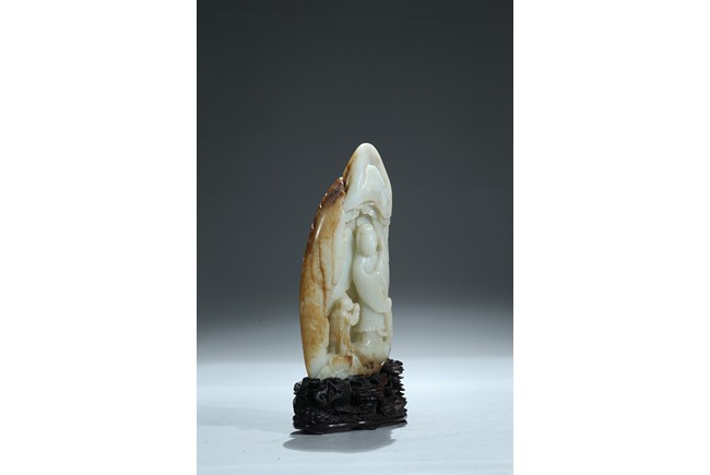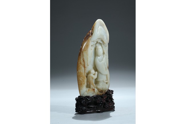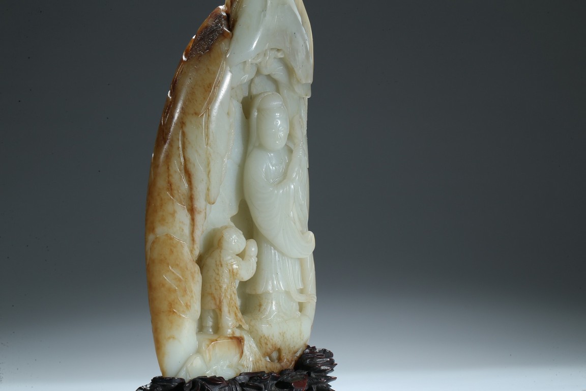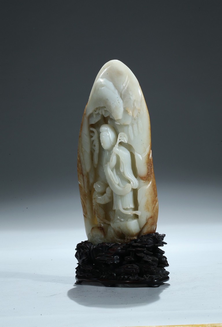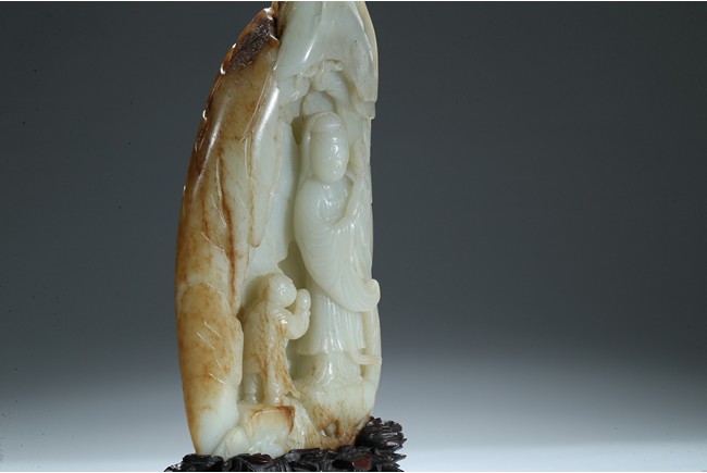 Of irregular boulder form, superbly worked to one side depicting the standing Guanyin bodhisattva wearing loosely draped robes, holding a tilted bottle on both hands containing a willow branch, with a boy bowing in a position of deference, with swelling waves crashing against the rocks below, the reverse carved with two bamboo trees issuing from the rockwork and streams of water flowing out from the rocks, the stone of smooth white color with russet skin skilfully incorporated into the design of the boulder, fitted with hardwood stand. Qing Dynasty Qianlong period.