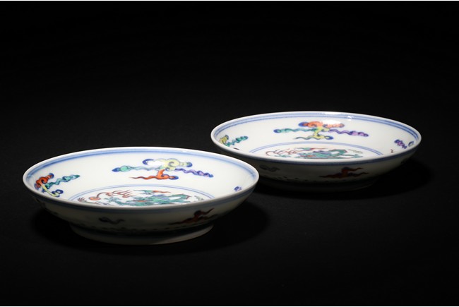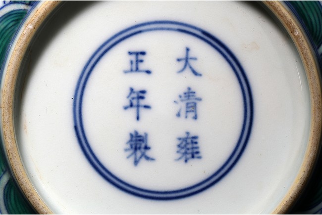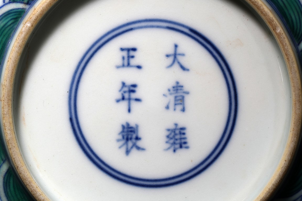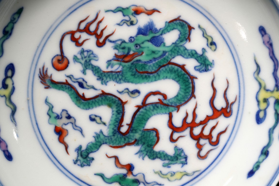 With shallow rounded sides rising from a tapered foot to a flared rim,the interior deftly painted in vivid tones of cobalt blue with a central medallion enclosing a green five-clawed dragon wirthing amongst wucai scrolling clouds,the rim bordered by a colorful classic-scroll band,the base with a six-character reign mark within a double circle. Qing Dynasty period.