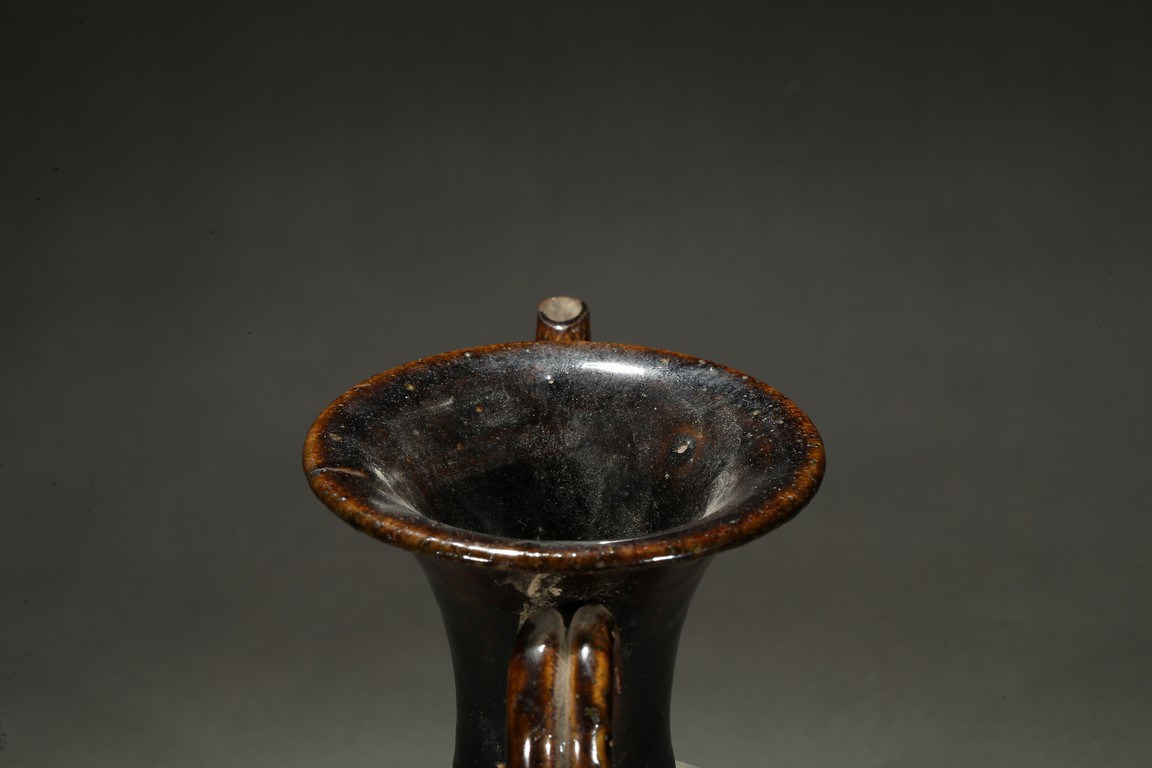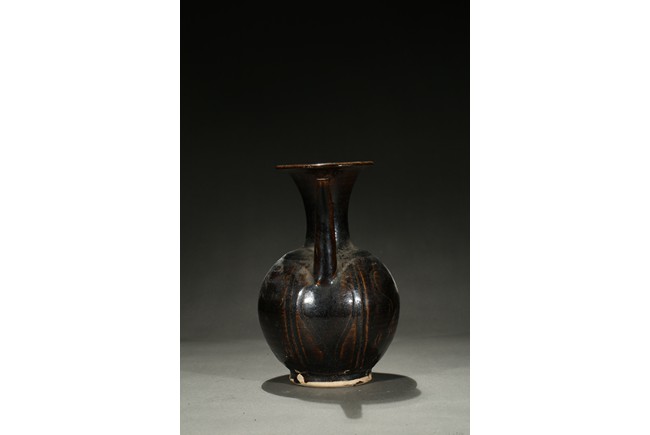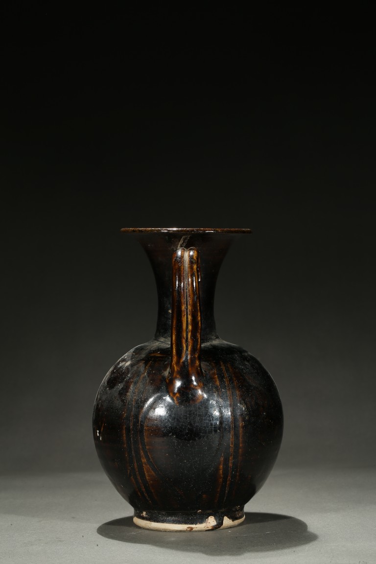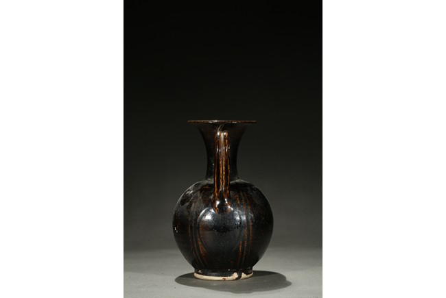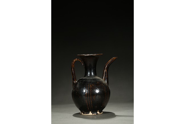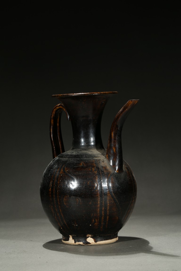 The globular-shaped body applied with a loop handle and serpentine spout,overall painted in dark brown glaze with pattern. Ming Dynasty period.