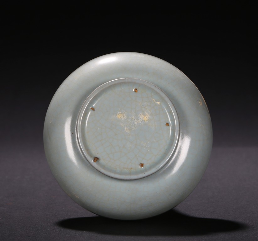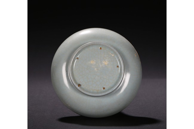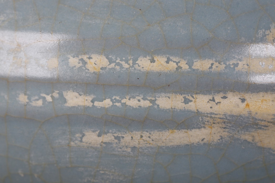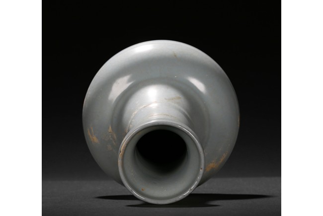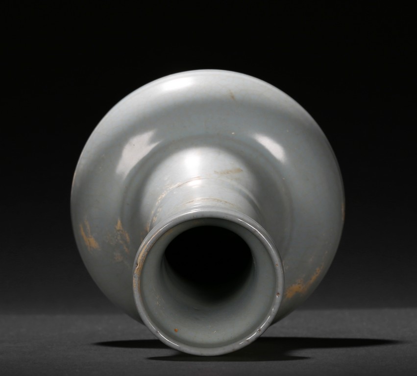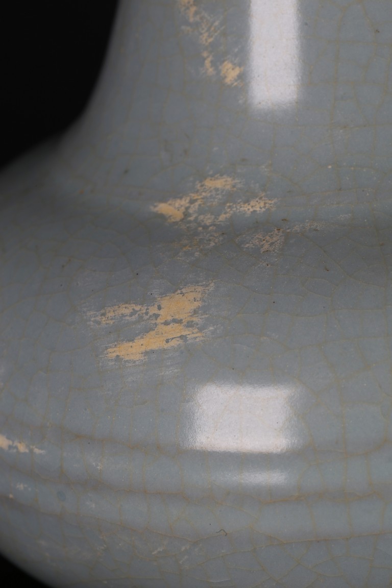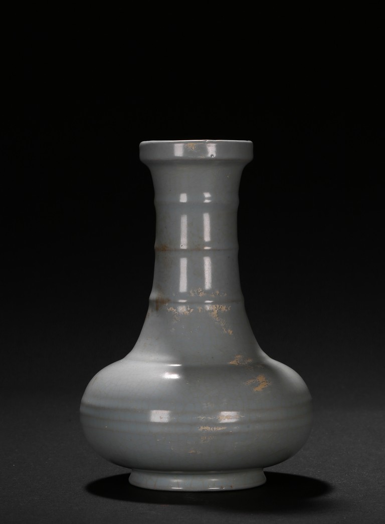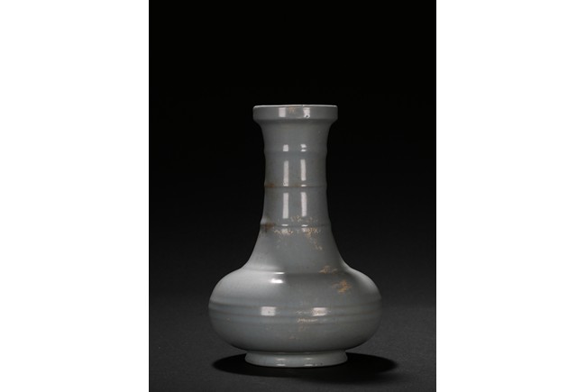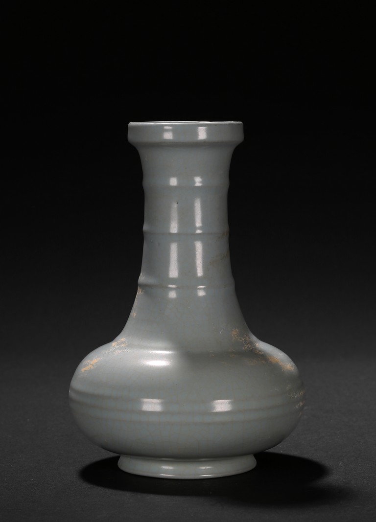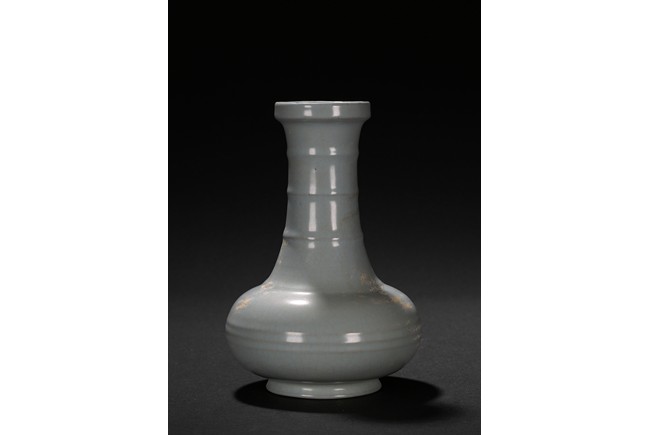 Of compressed globular form body and raised to long neck with protruding encircling ribs,overall glazed in pale celadon glazed. Ming Dynasty Period.