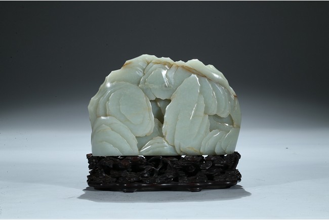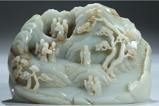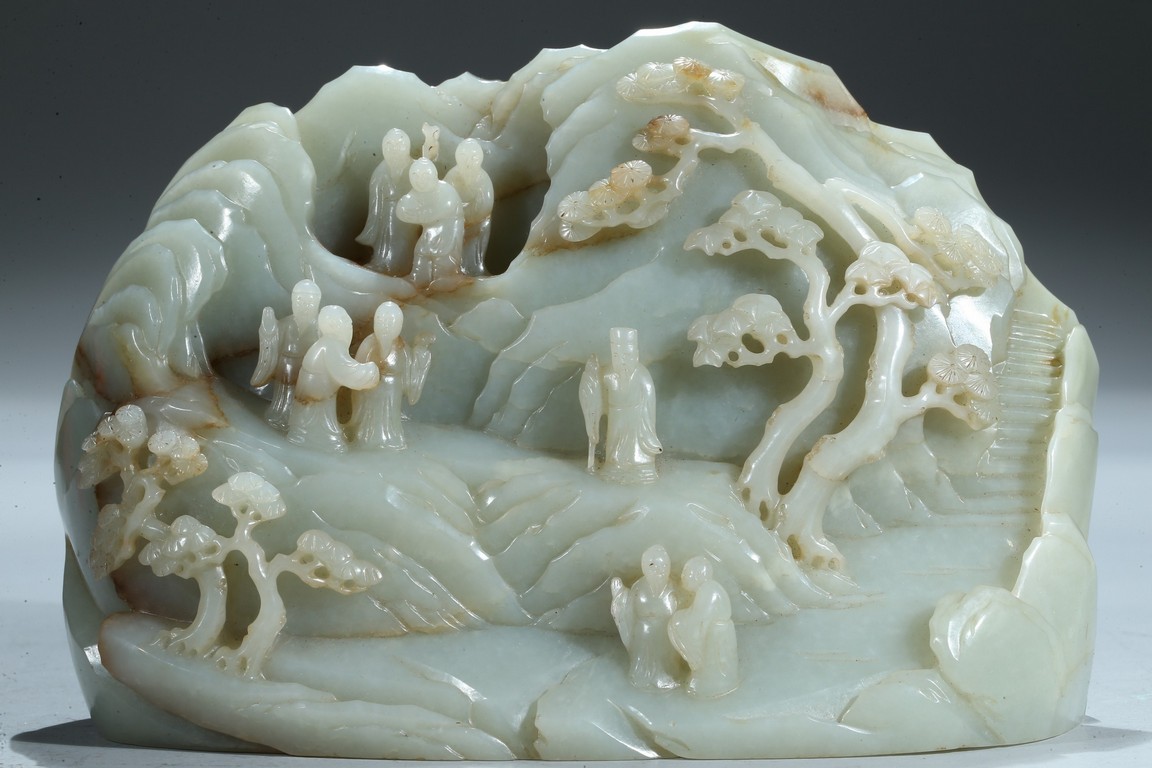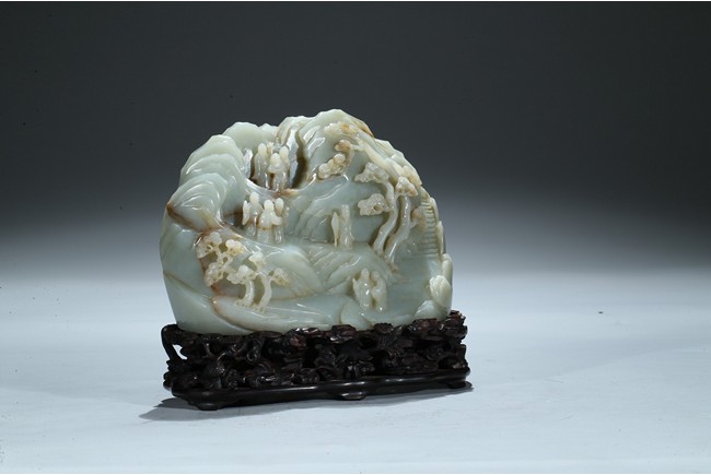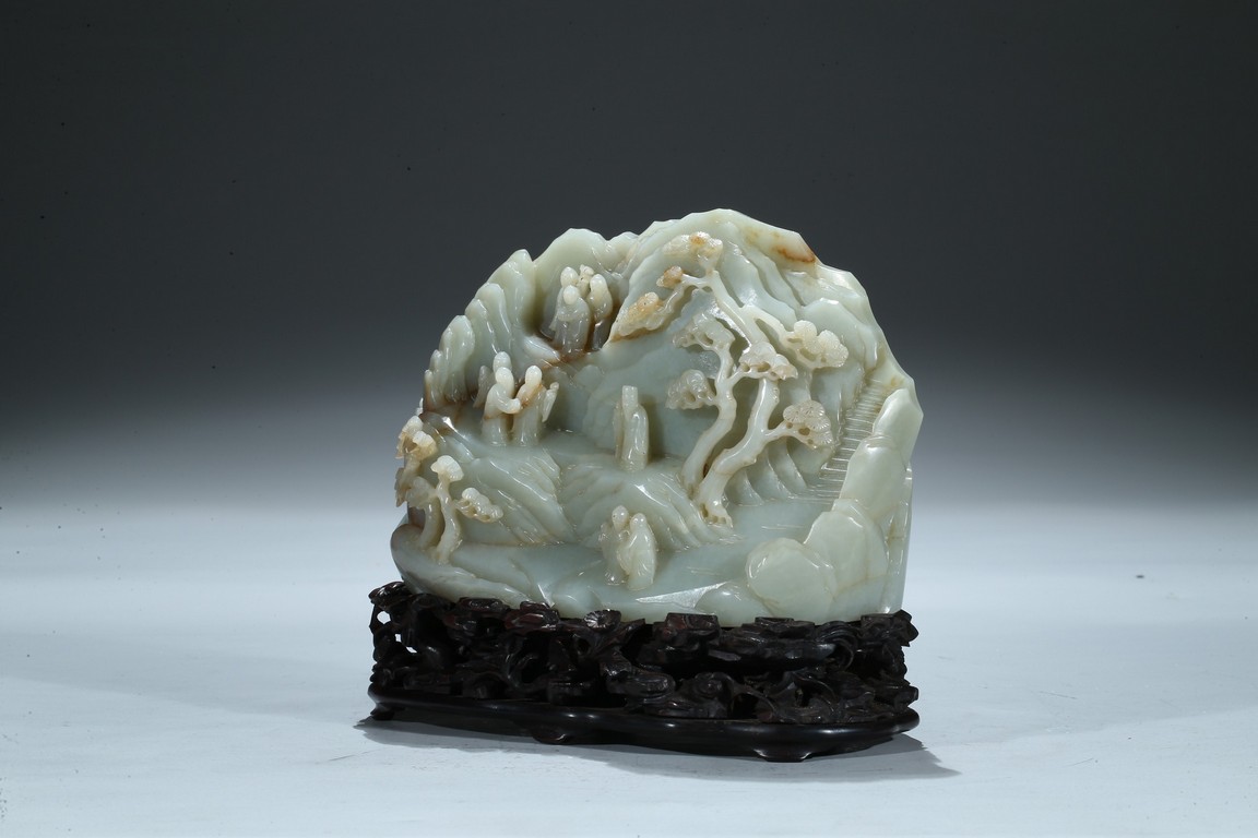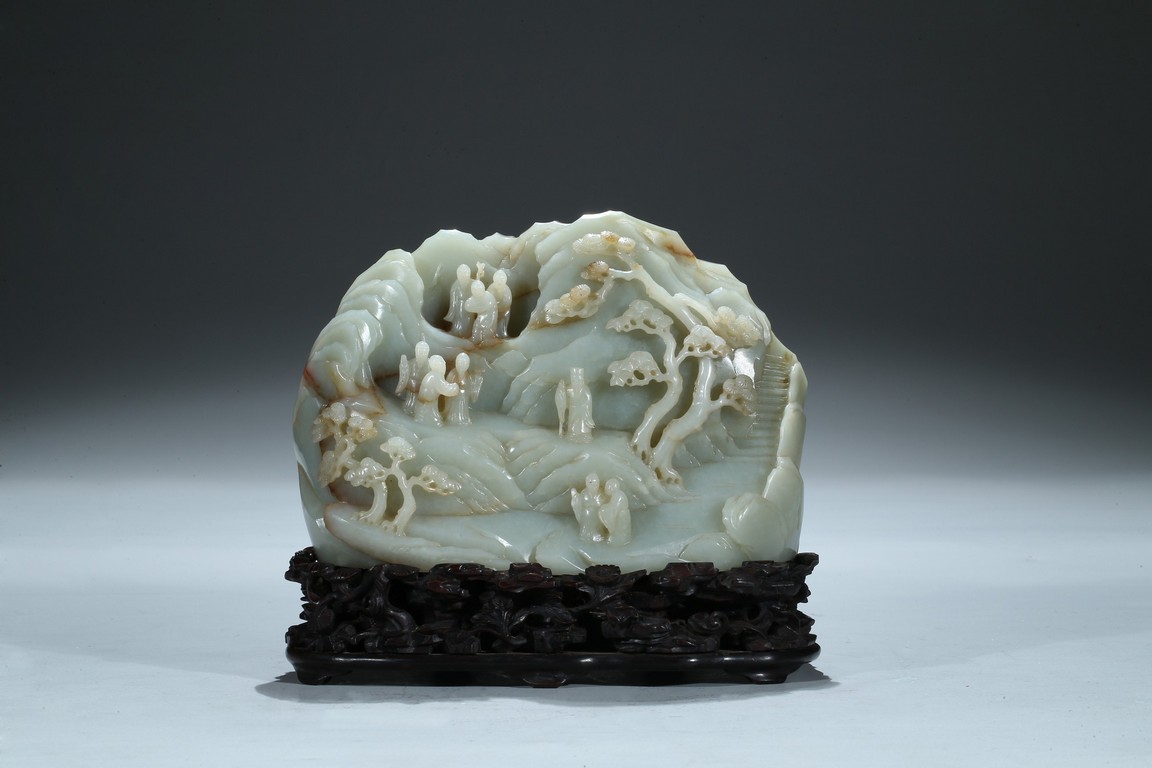 The boulder is finely carved in the form of a rocky mountain, depicting nine elderly figures conversing and appreciating the scenery in a deep mountain landscape setting. The stone is of greenish white tone with slight russet inclusions, accompanied with a zitan stand. Qing Dynasty period.