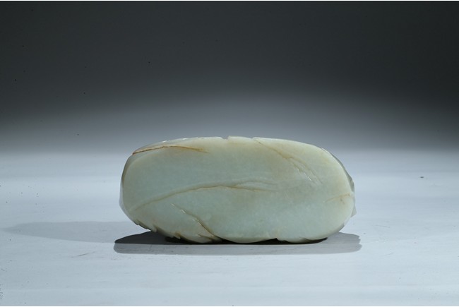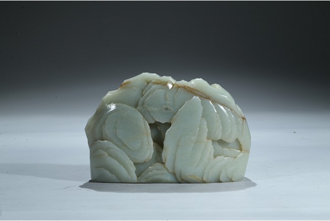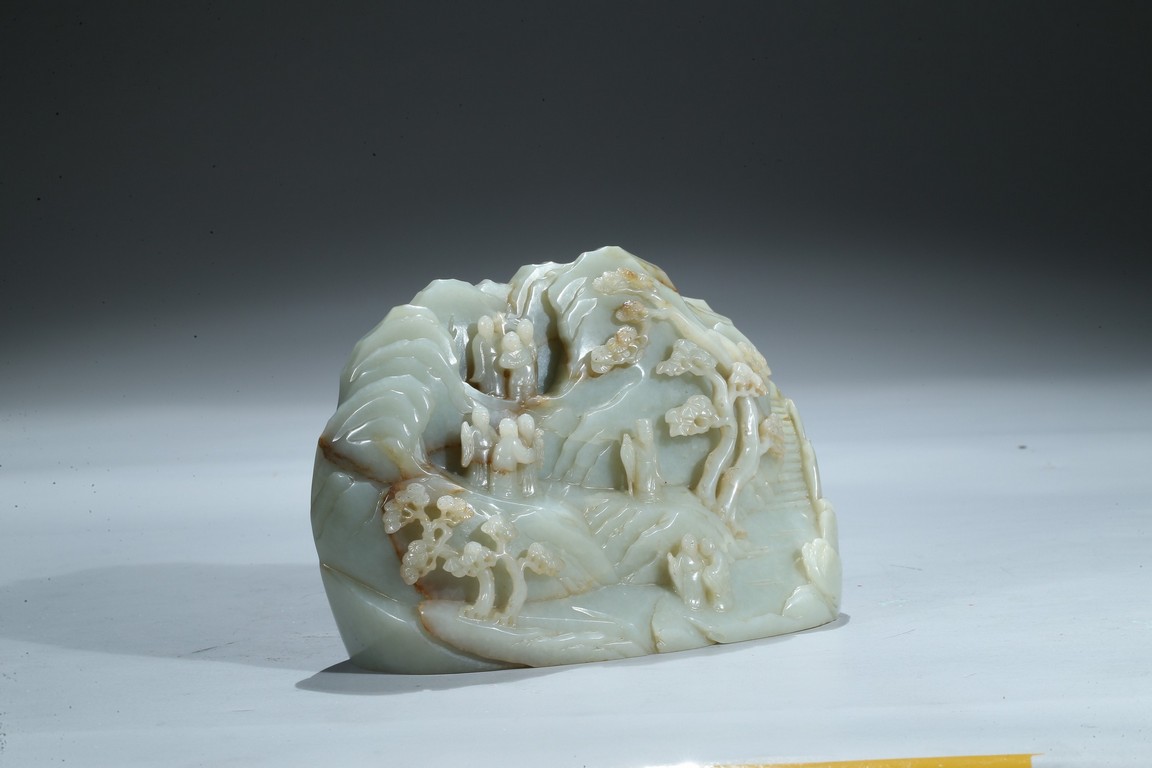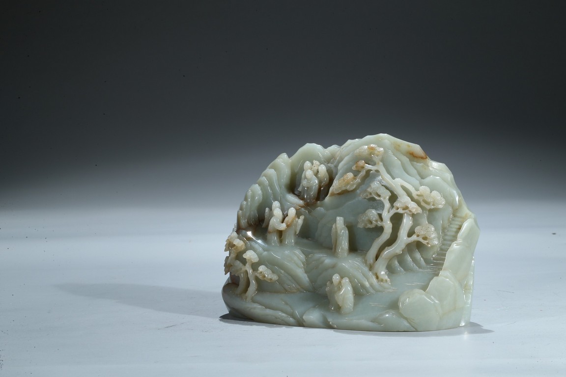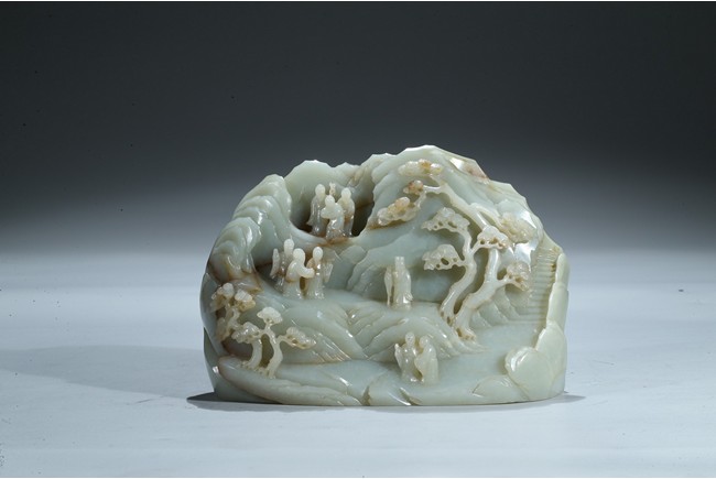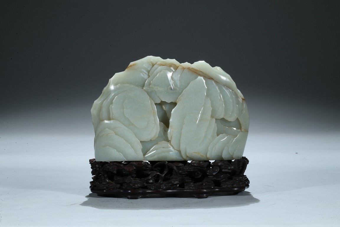 The boulder is finely carved in the form of a rocky mountain, depicting nine elderly figures conversing and appreciating the scenery in a deep mountain landscape setting. The stone is of greenish white tone with slight russet inclusions, accompanied with a zitan stand. Qing Dynasty period.