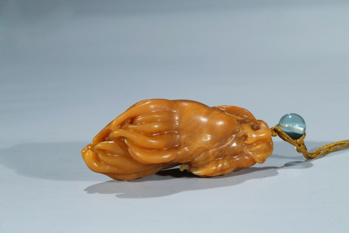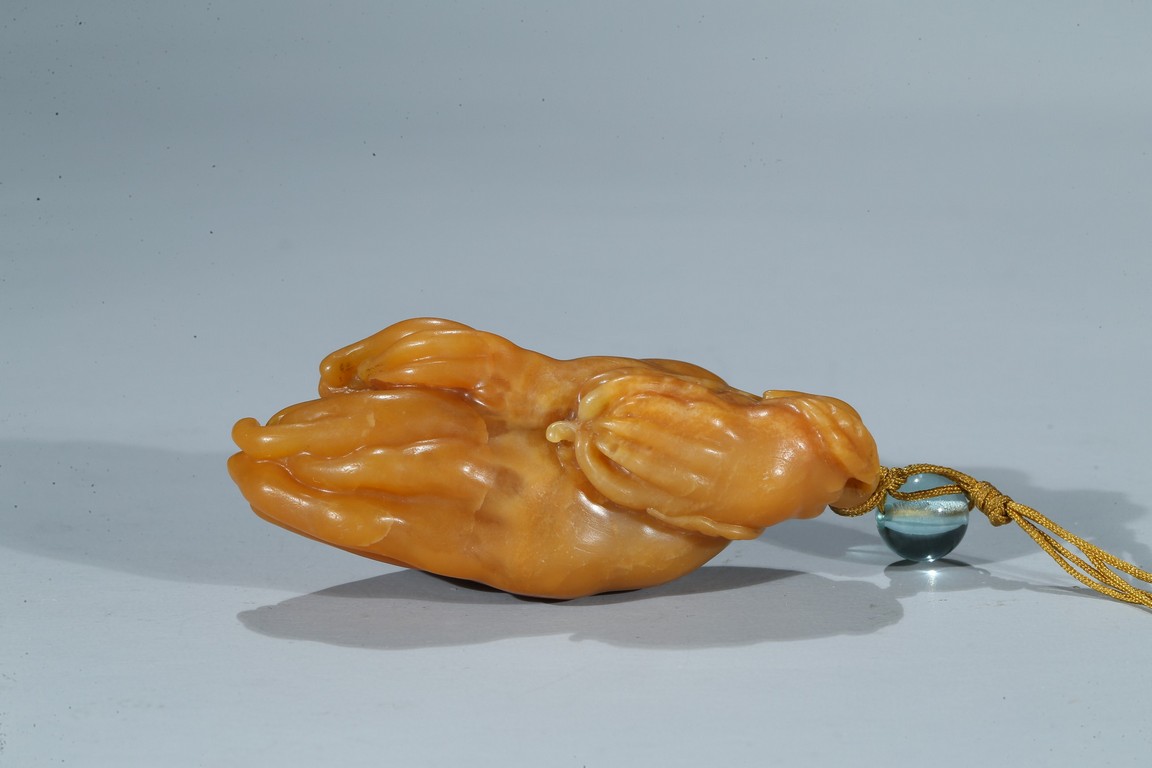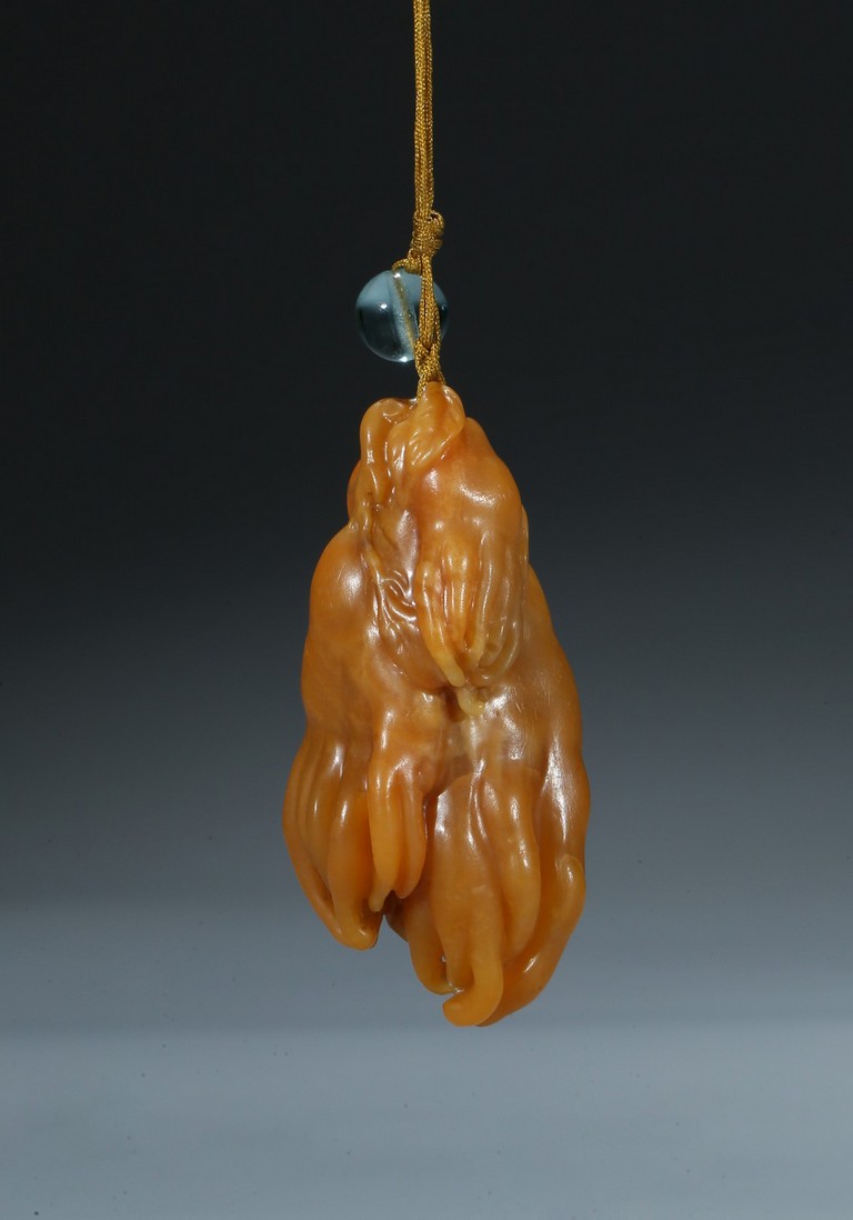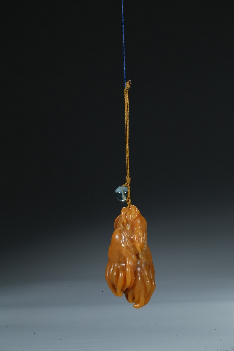 finely carved as finger citron-fruit with curling tips borne on a gnarled and leafy stem. Qing Dynasty period.