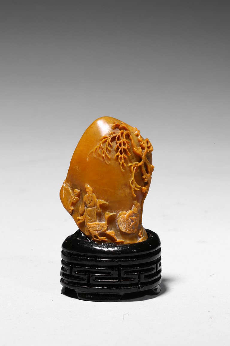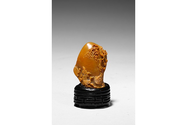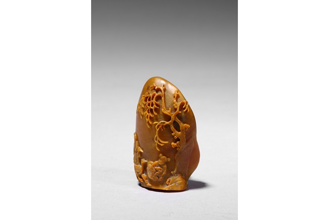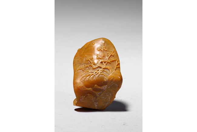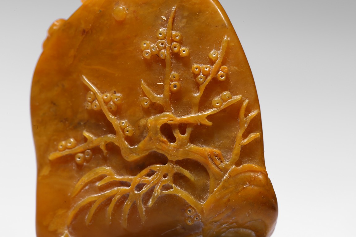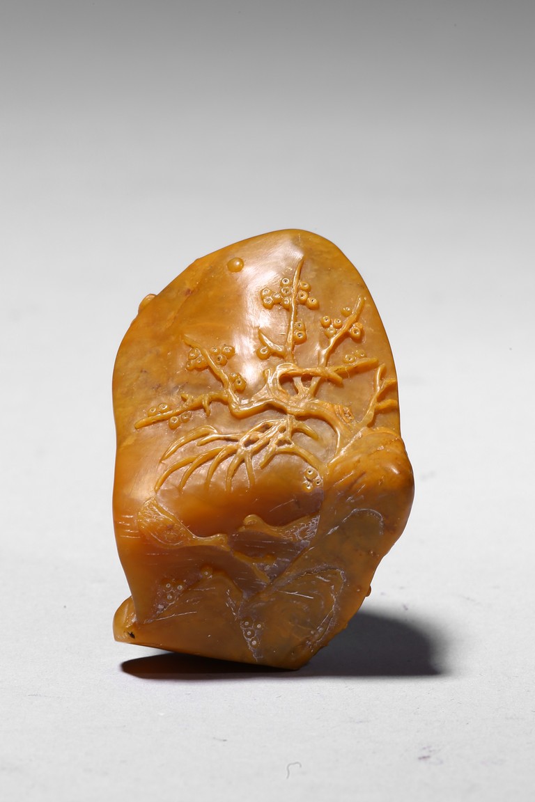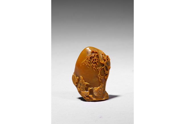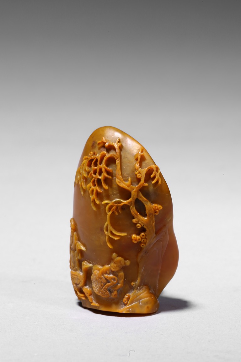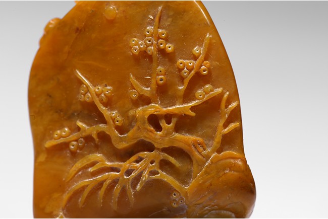 Carved through the yellow skin to the ochre stone to depict elders and boy under a large willow tree to the front, the reverse decorated with a large plum blossom and orchids issuing from rocky outcrop.