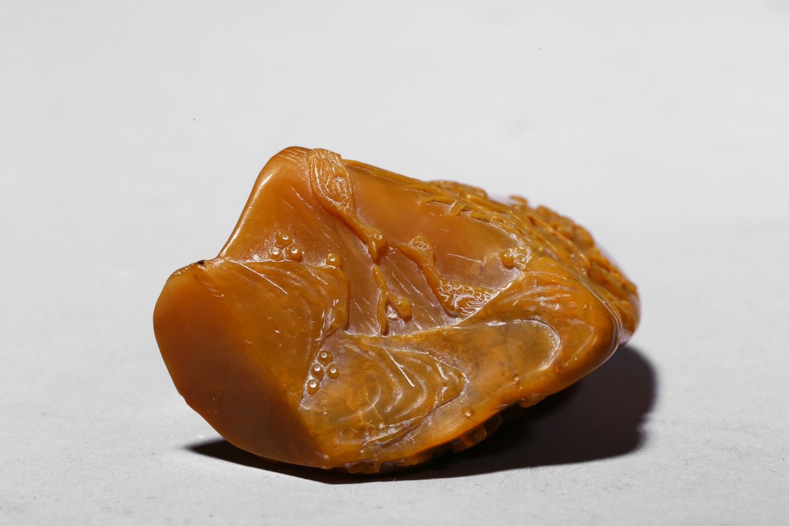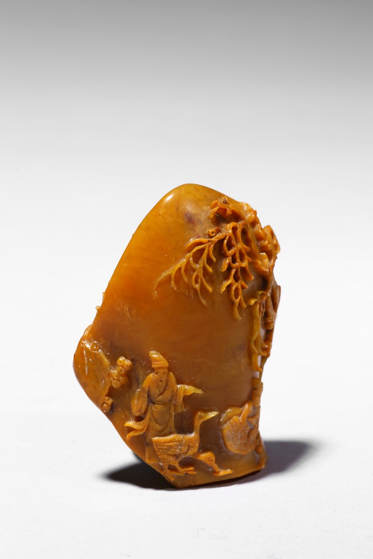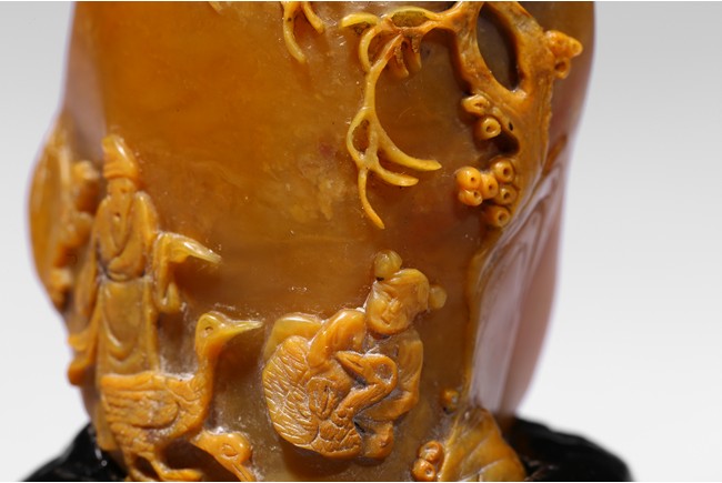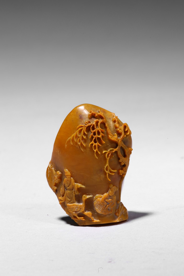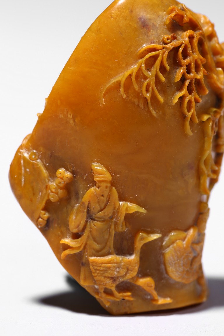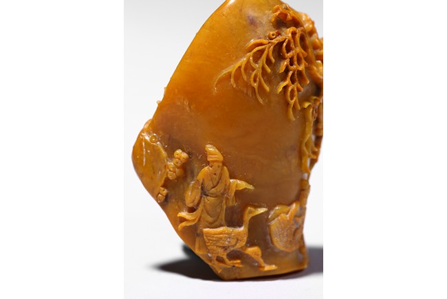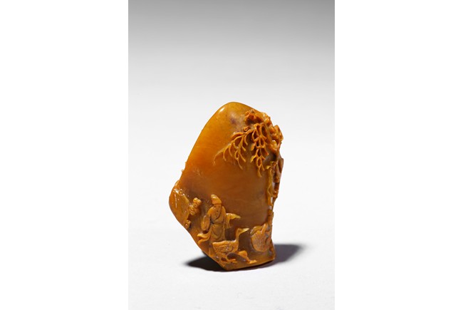 Carved through the yellow skin to the ochre stone to depict elders and boy under a large willow tree to the front, the reverse decorated with a large plum blossom and orchids issuing from rocky outcrop.