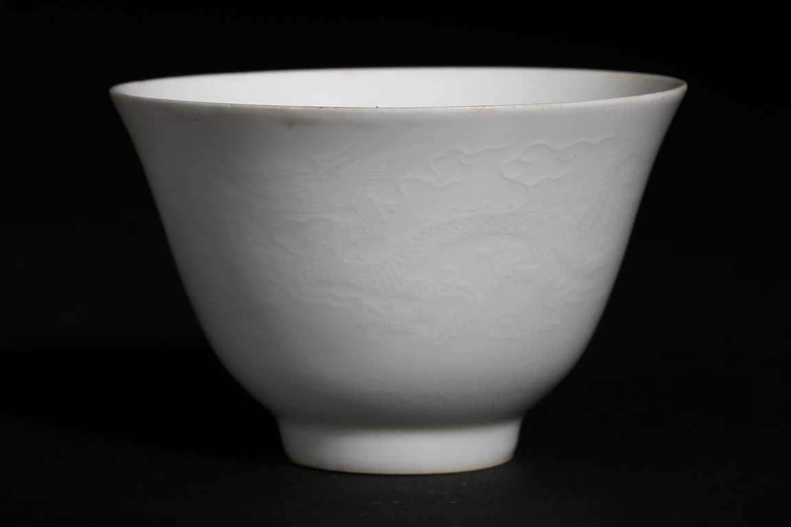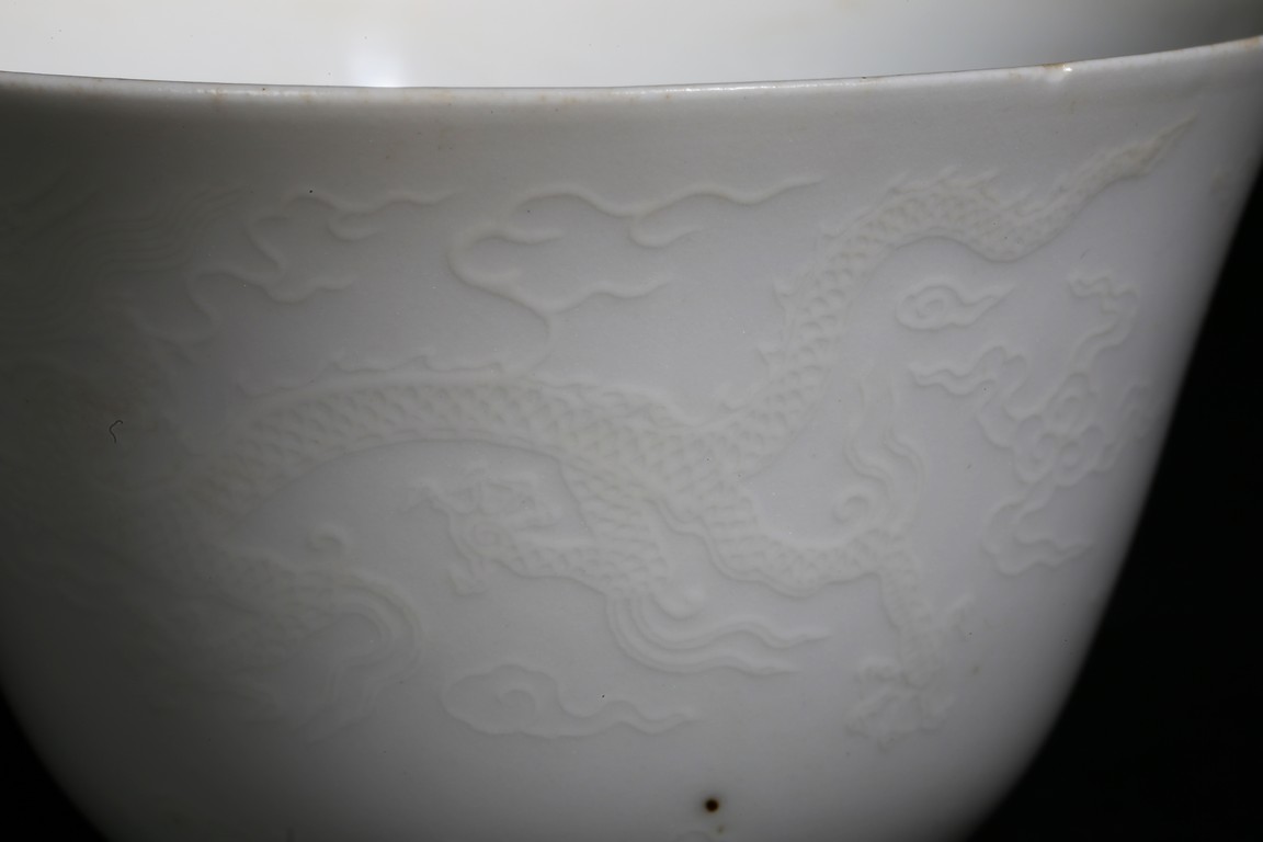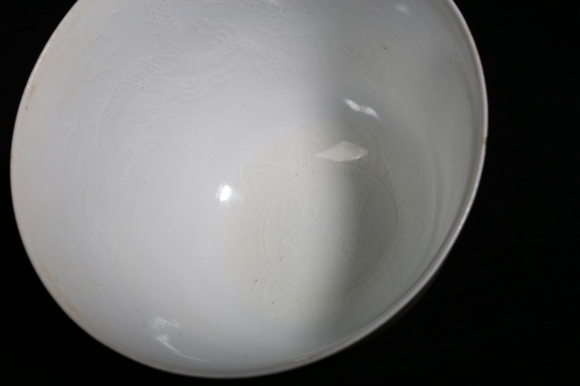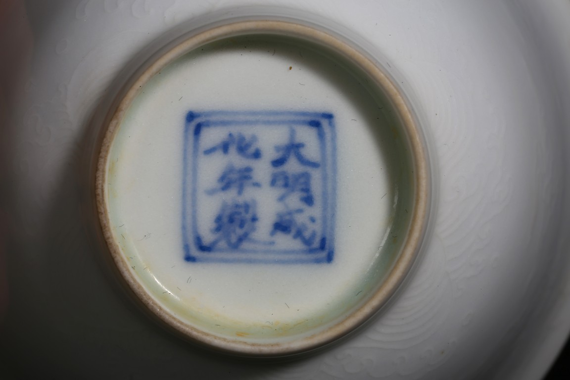Thinly potted, the bowl resting on a short circular feet,subtly moulded around the exterior walls in anhua with ferocious dragon flying through clouds,the interior similarly inscribed with dragon motif and clouds within a medallion of petal panels,the base painted with six character Chenghua mark. Ming Dynasty period.