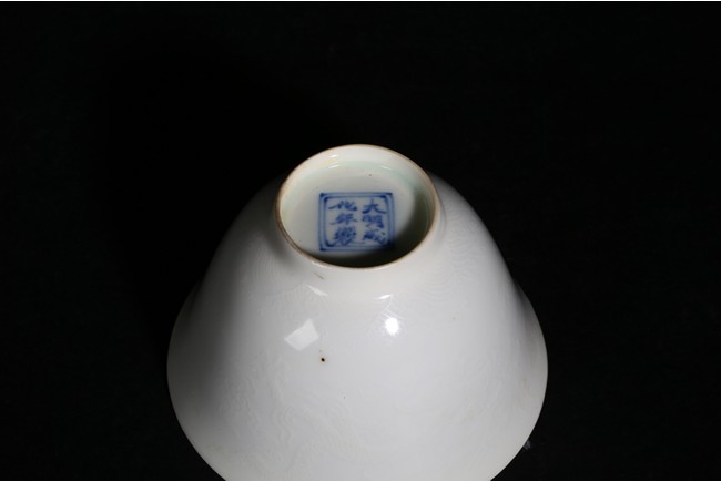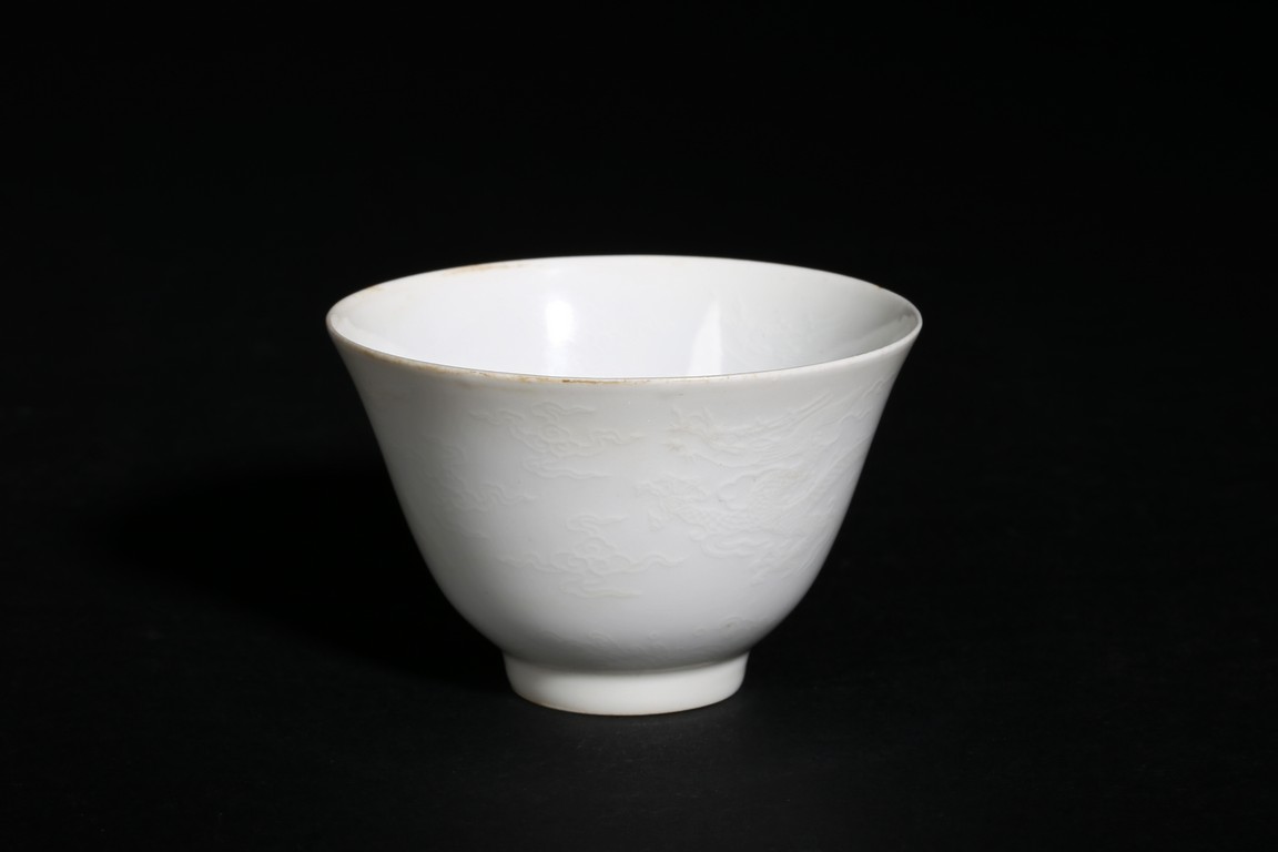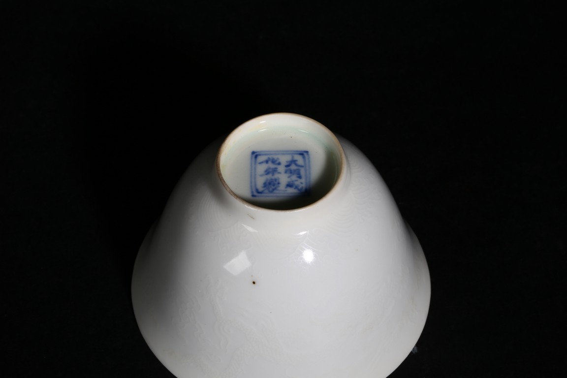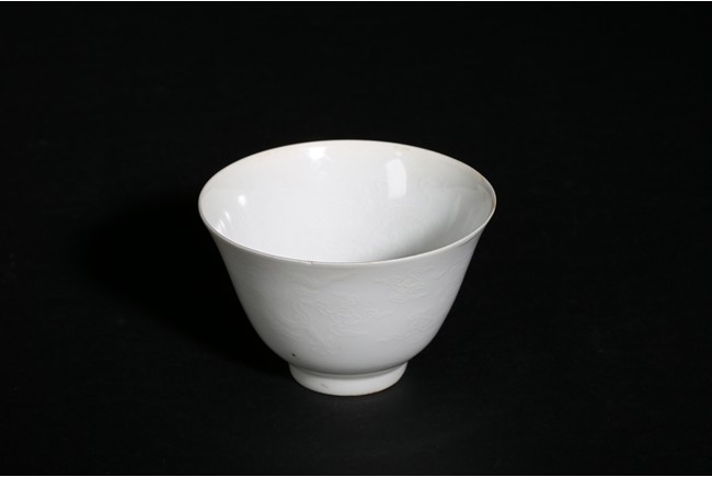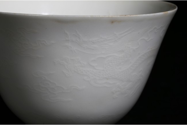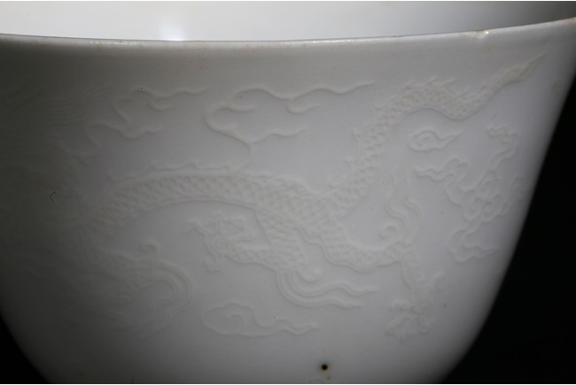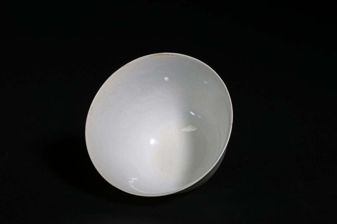 Thinly potted, the bowl resting on a short circular feet,subtly moulded around the exterior walls in anhua with ferocious dragon flying through clouds,the interior similarly inscribed with dragon motif and clouds within a medallion of petal panels,the base painted with six character Chenghua mark. Ming Dynasty period.