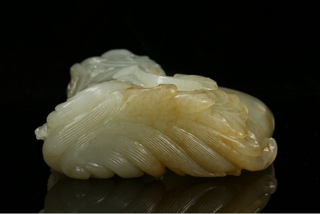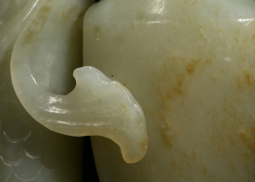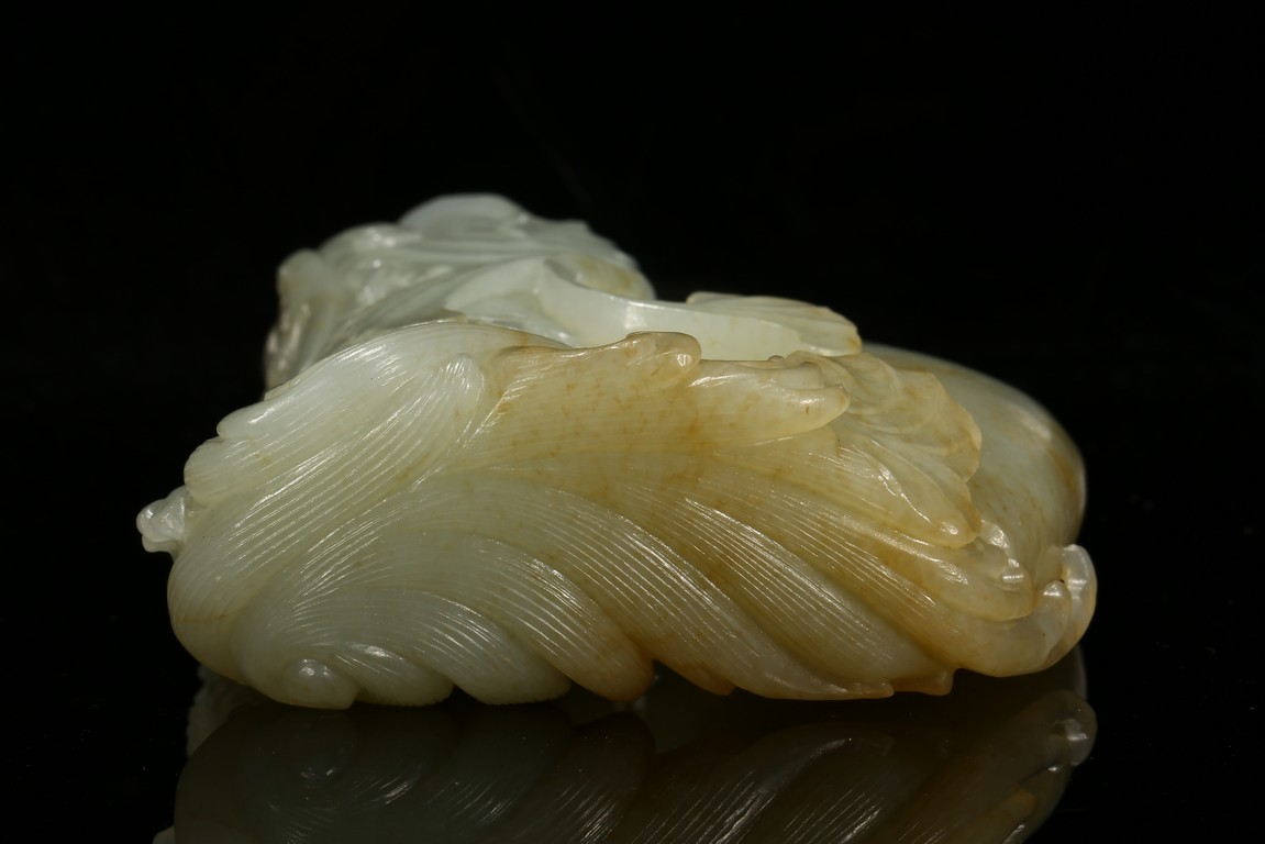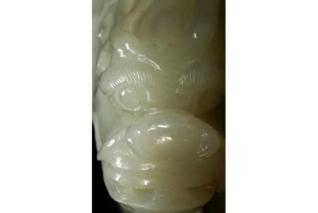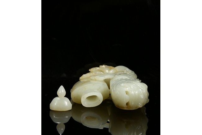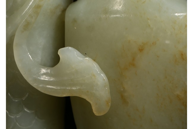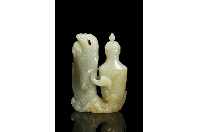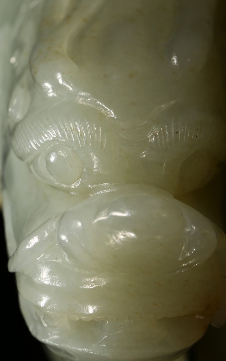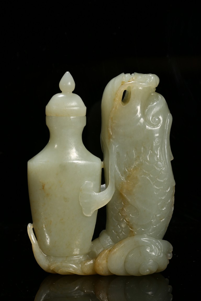 The group formed as a leaping carp and a vase,the carp leaping out of turbulent waves with large gaping mouths open,the fins and scales finely detailed,next to a lidded vase with waisted neck and cover with drop-shape finial,the stone is of white tone with russet inclusions and markings. Qing Dynasty period.