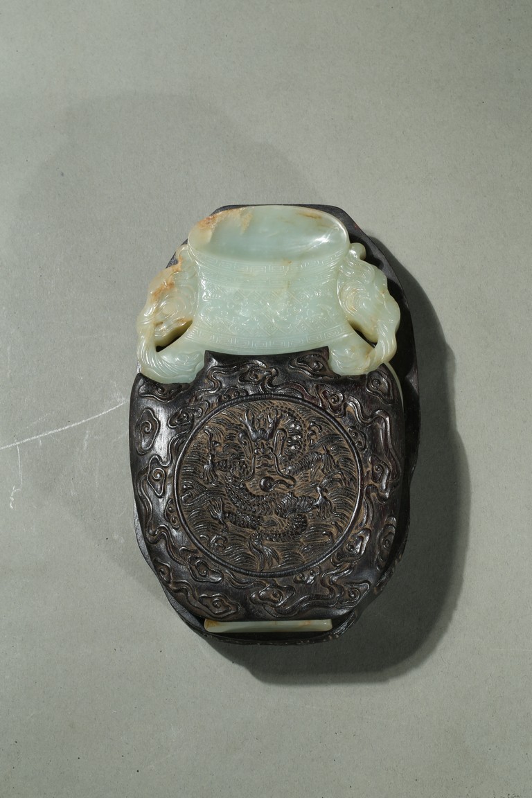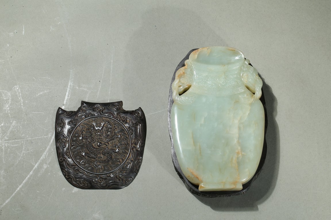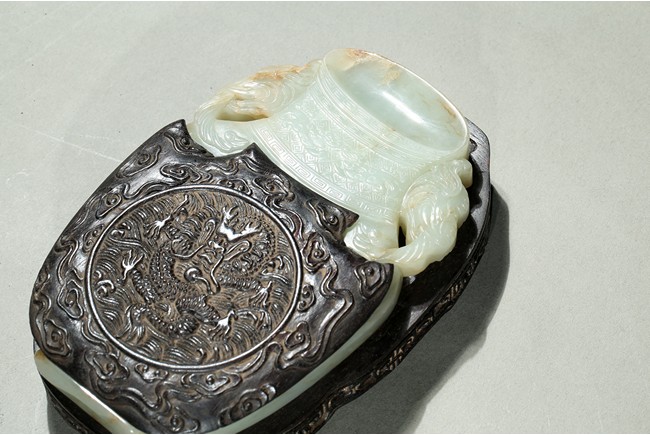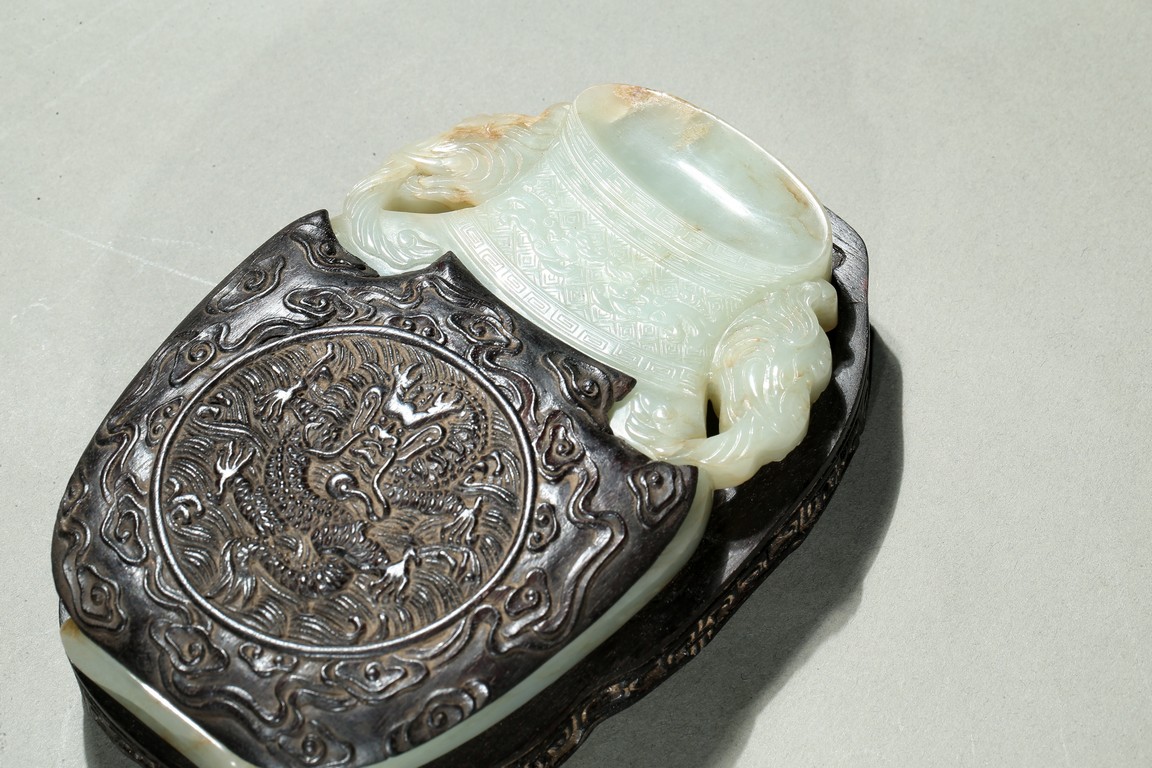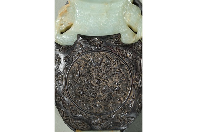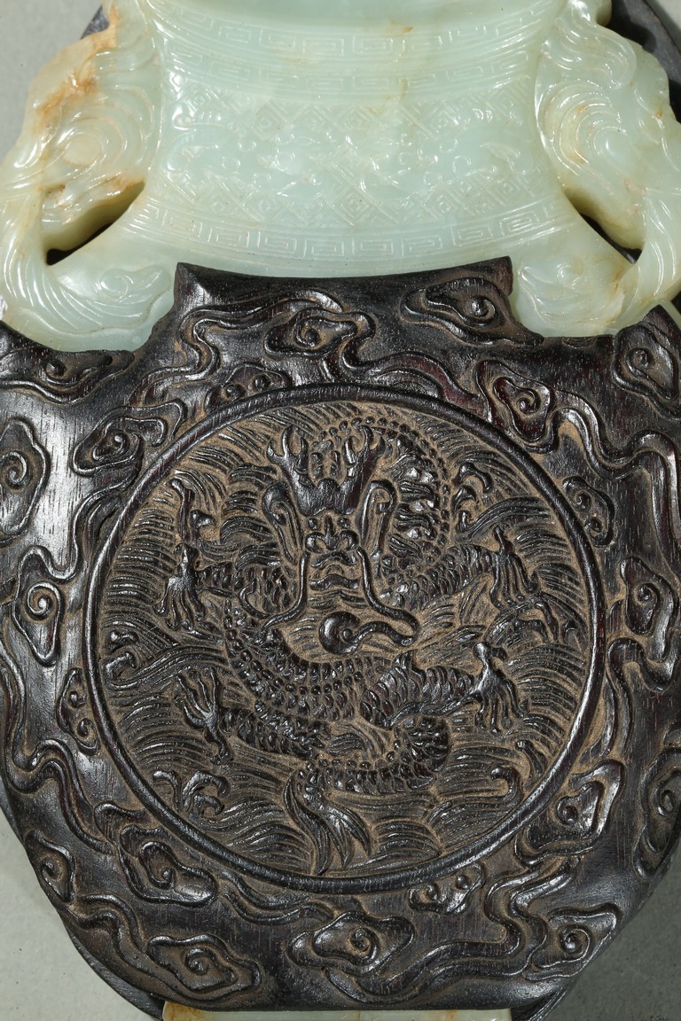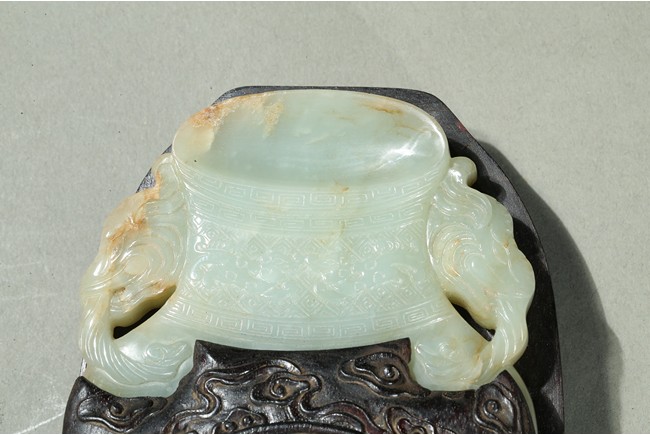 In the form of a flattened vase supported on a short spreading foot,rising to a neck flanked by elephant-shaped handles,with a wood cover decorated with a dragon pattern covered from the neck to the body, the neck encircled with auspicious cloud and key-fret band, carved with elephant on the back of the body. the stone of an even pale white tone with traces of russet inclusions. Qing Dynasty period.