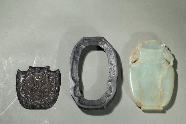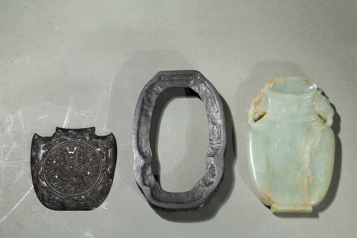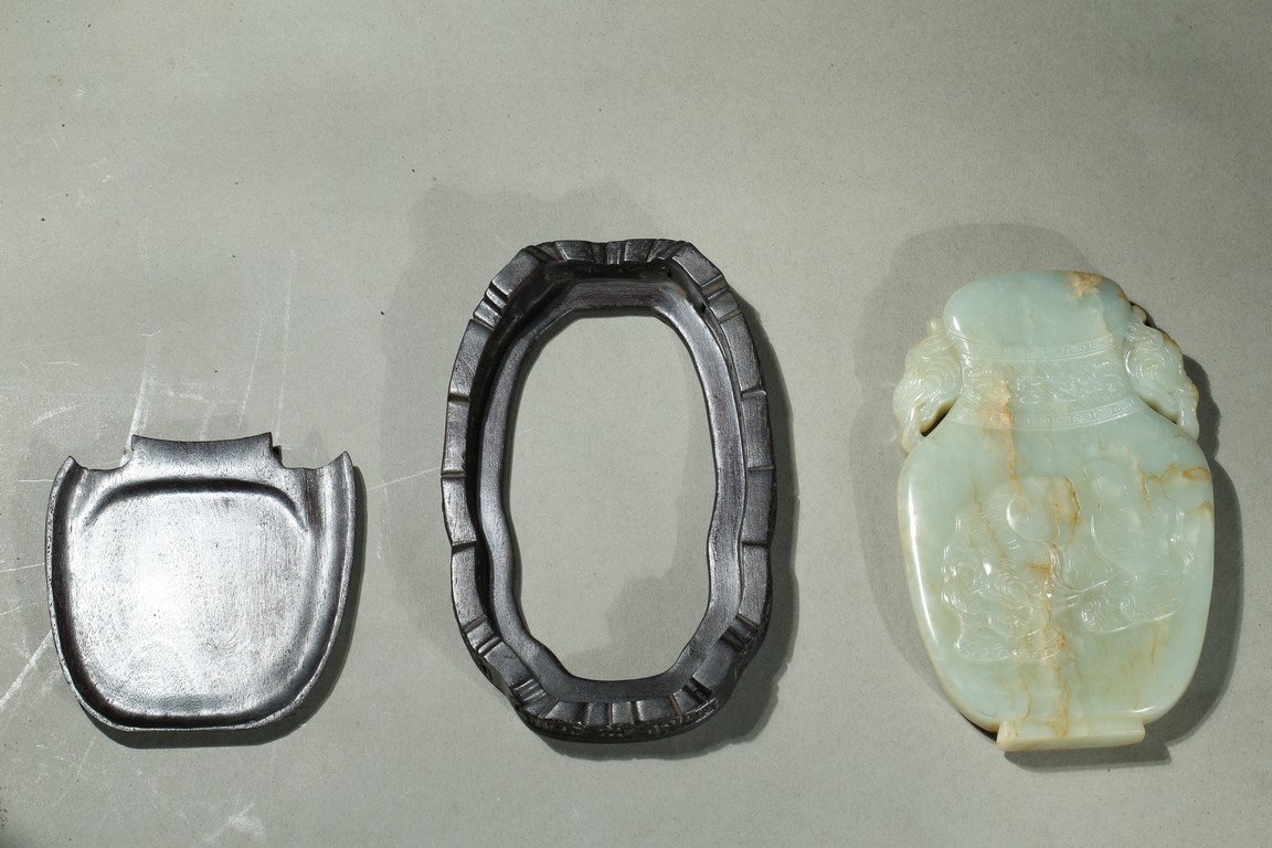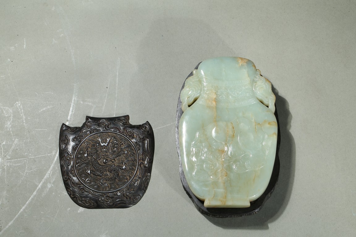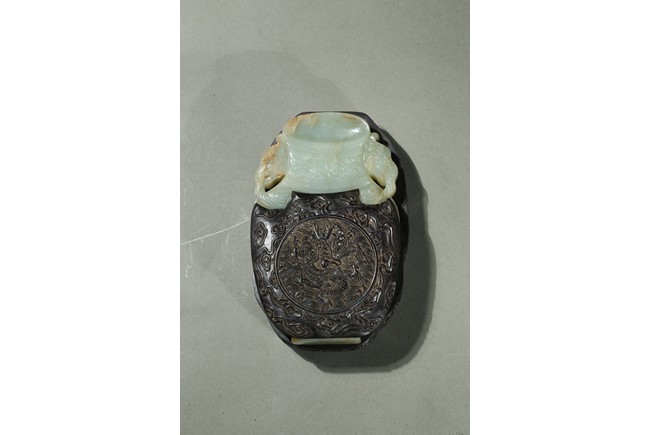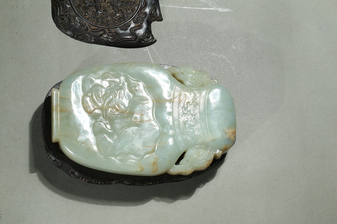 In the form of a flattened vase supported on a short spreading foot,rising to a neck flanked by elephant-shaped handles,with a wood cover decorated with a dragon pattern covered from the neck to the body, the neck encircled with auspicious cloud and key-fret band, carved with elephant on the back of the body. the stone of an even pale white tone with traces of russet inclusions. Qing Dynasty period.