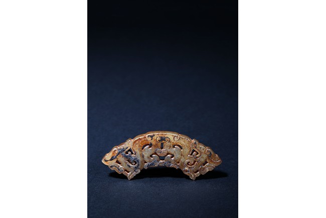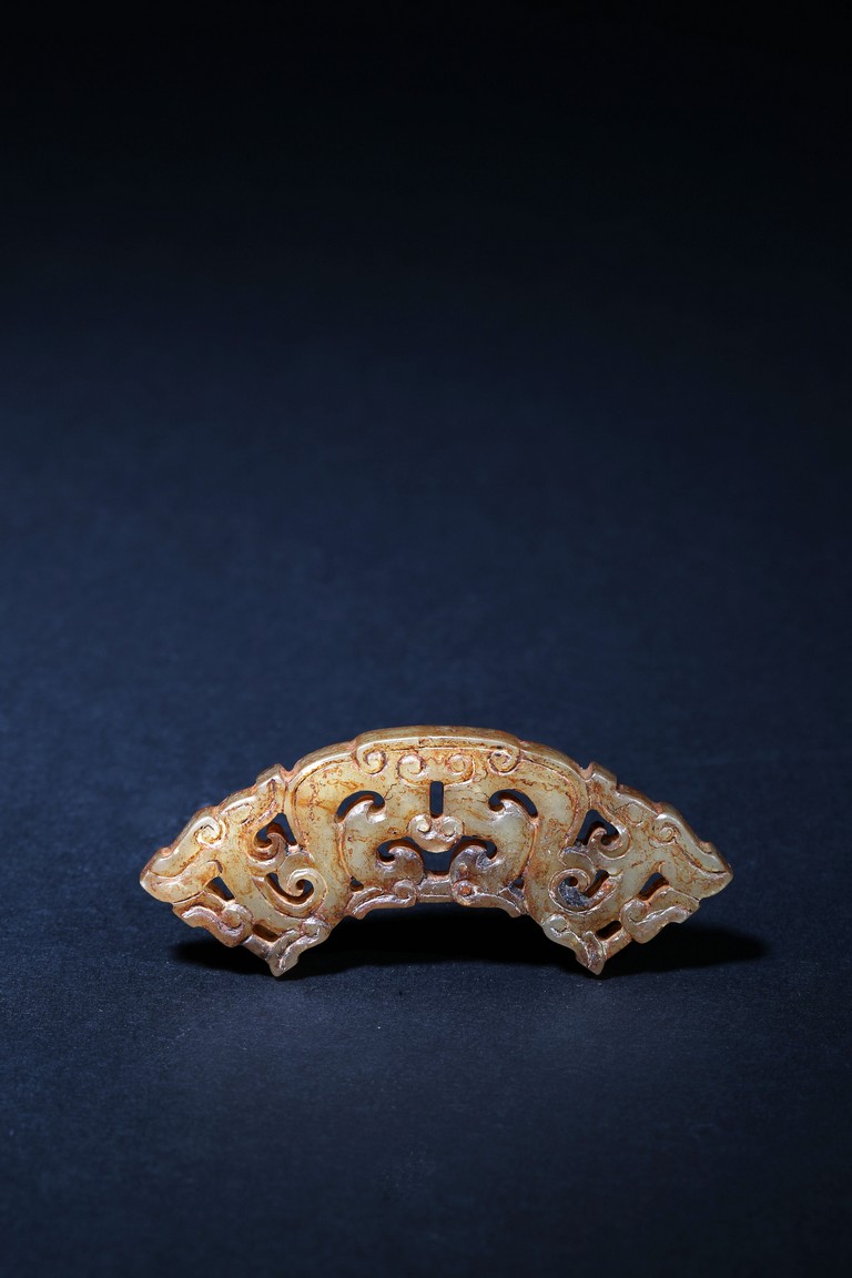 The arc-shaped pendant finely carved on both sides with a central taotie mask flanked by pair of dragon heads,divided by the fluted ribs,the stone of yellowish-green color with areas of dark brown and russet inclusion. Warring State period.