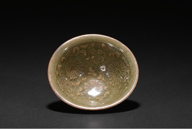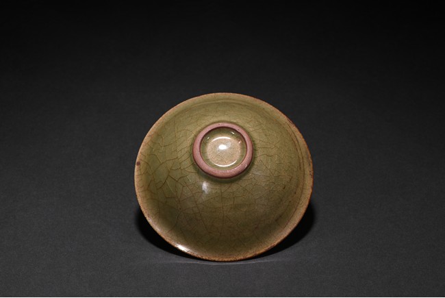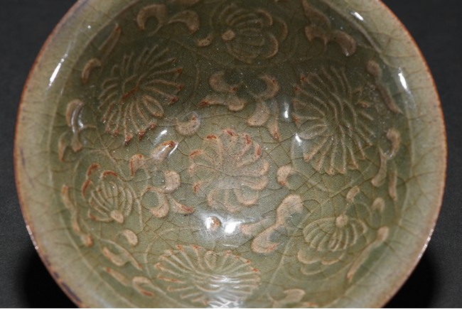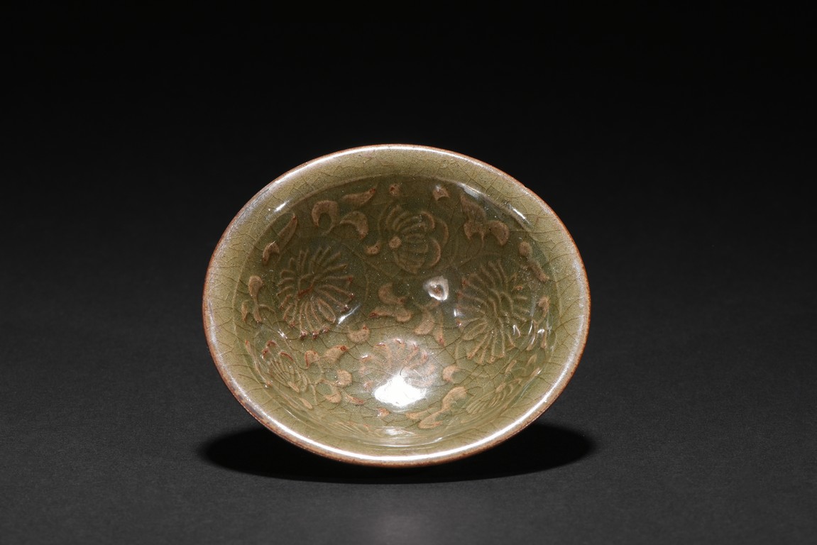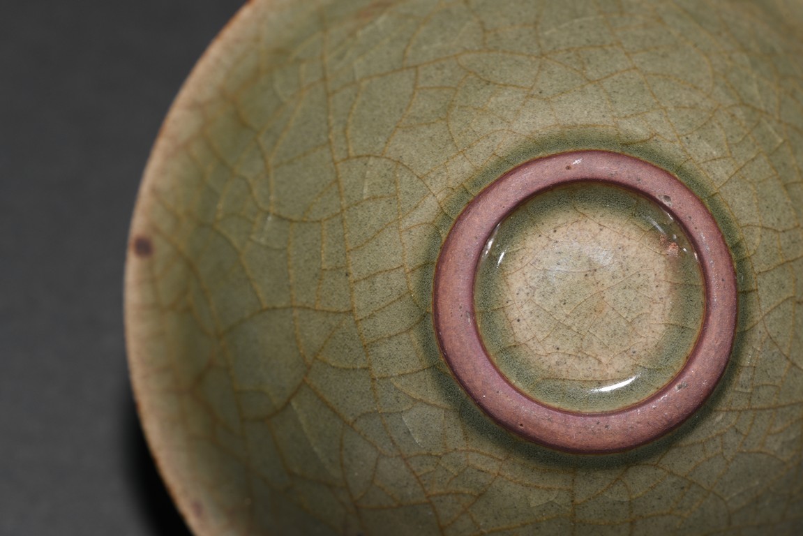 Well potted with shallow conical sides rising from a short foot to a flared rim,covered overall with celadon glaze suffused with a dense network of russet crackles throughout pooling around the outer mouth rim and the extremities on the interior,the interior covered overall of finely floral and scrolled foliate pattern.
