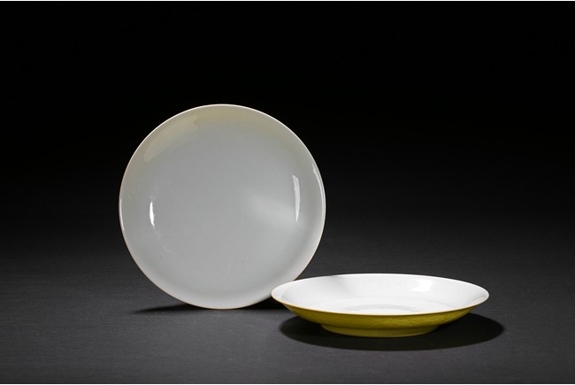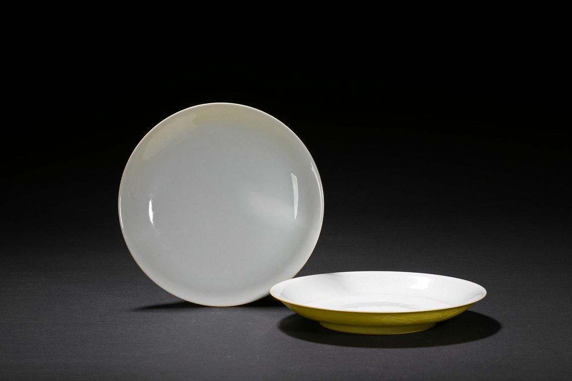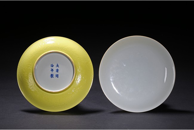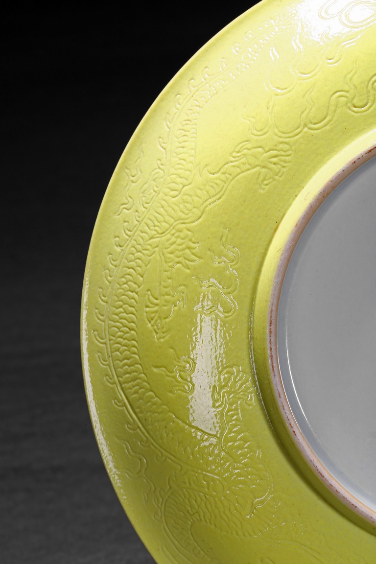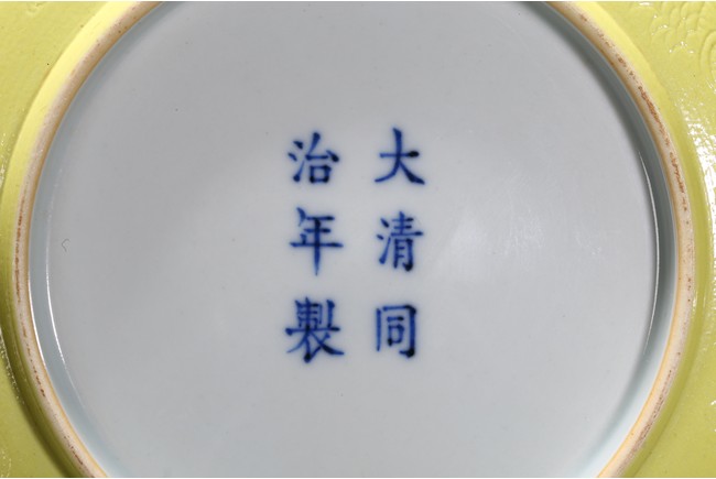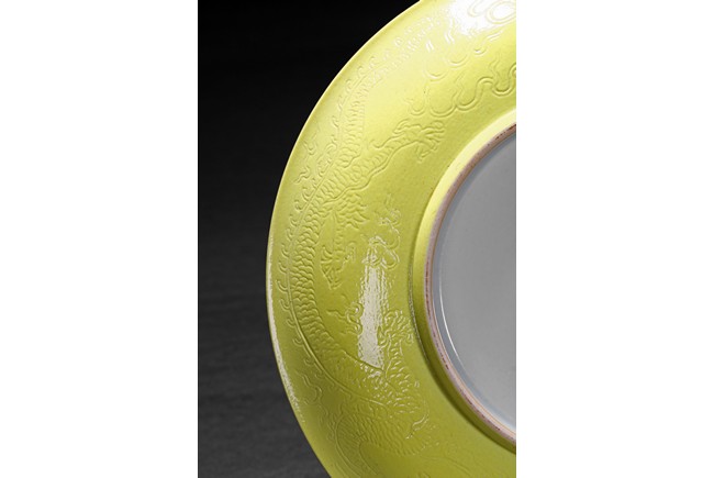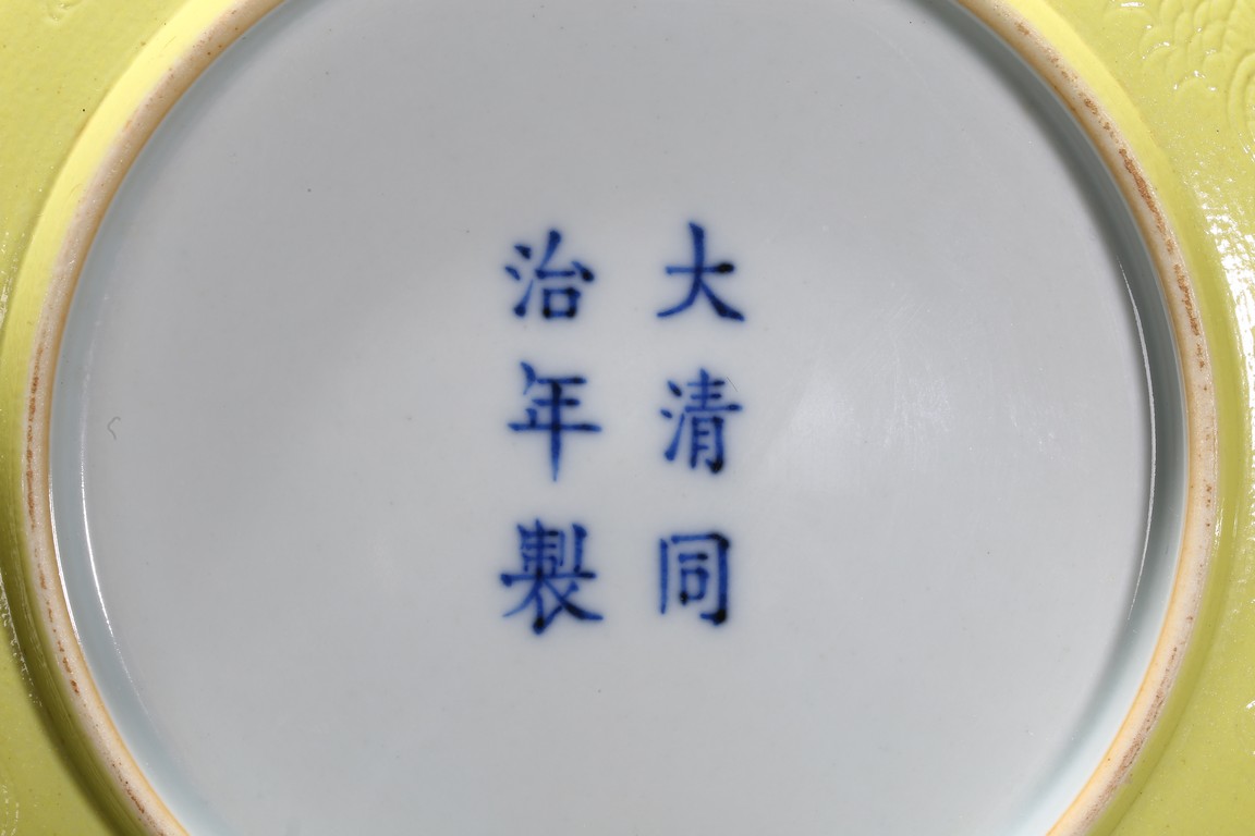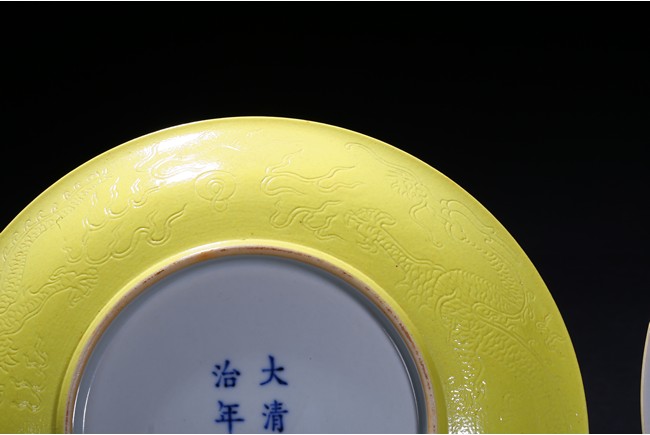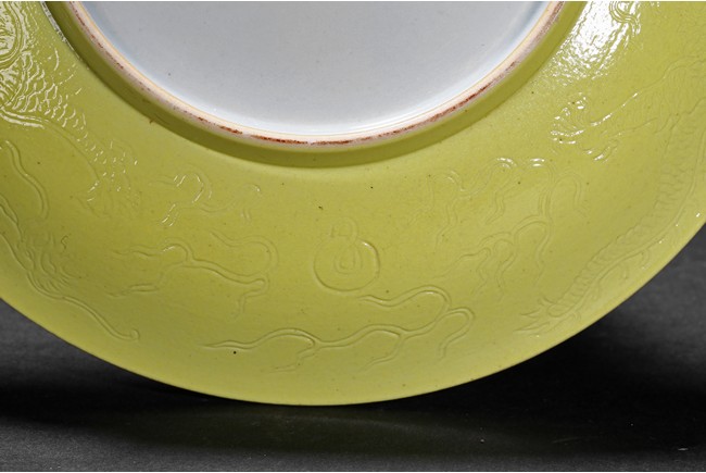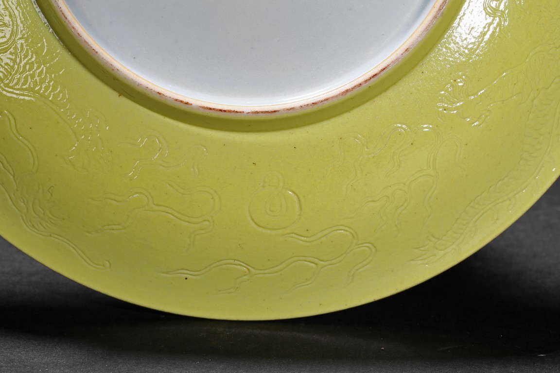 The rounded sides rising from a short foot,the exterior suffused in yellow glaze incised with dragons chasing flaming pearl,the base with six character reign mark. Qing Dynasty period.