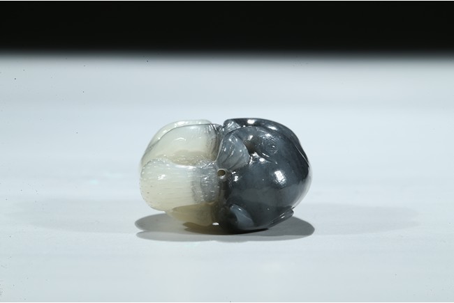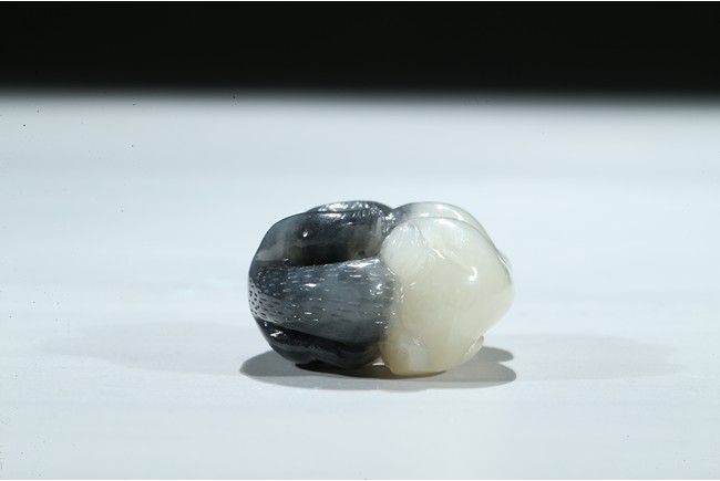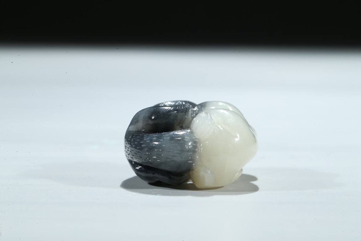The group carved and pierced in the form of two cats, each with the other's back right leg in its mouth, the facial details and tail incised, the stone is of a mottled white and black tone. Qing Dynasty period.