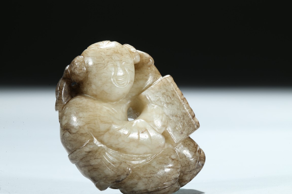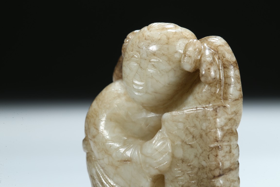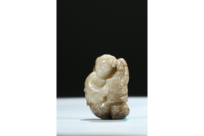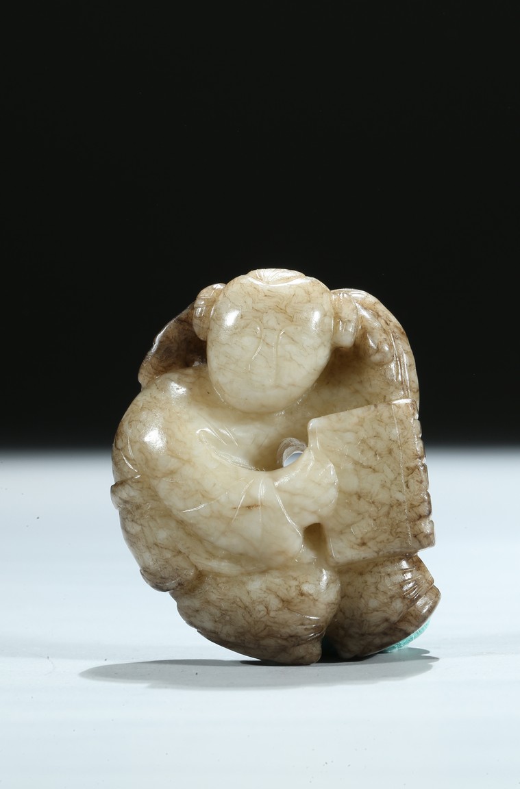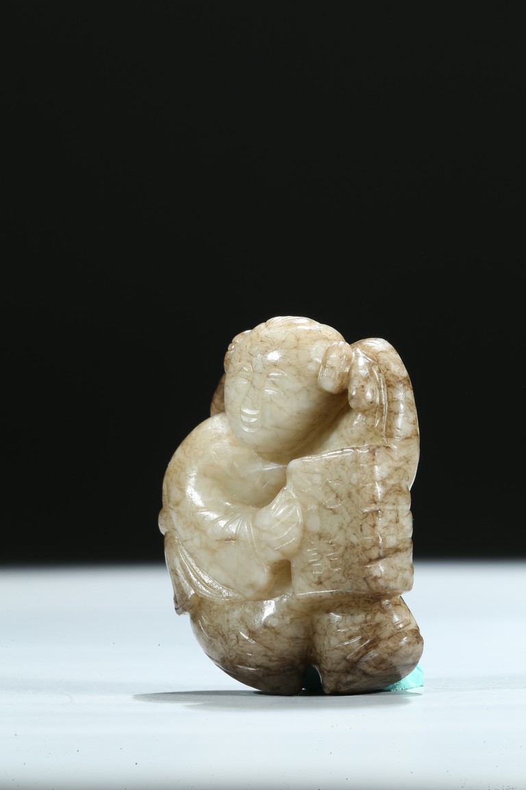 The boy is shown with one hand holding the book the Analects by Confucius, his left hand against his forehead, the face with joyful expression, the stone is of opaque white tone with grey veins and inclusions. Qing Dynasty period.