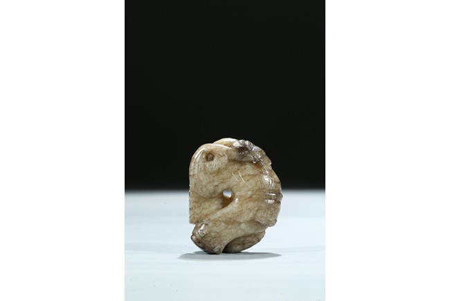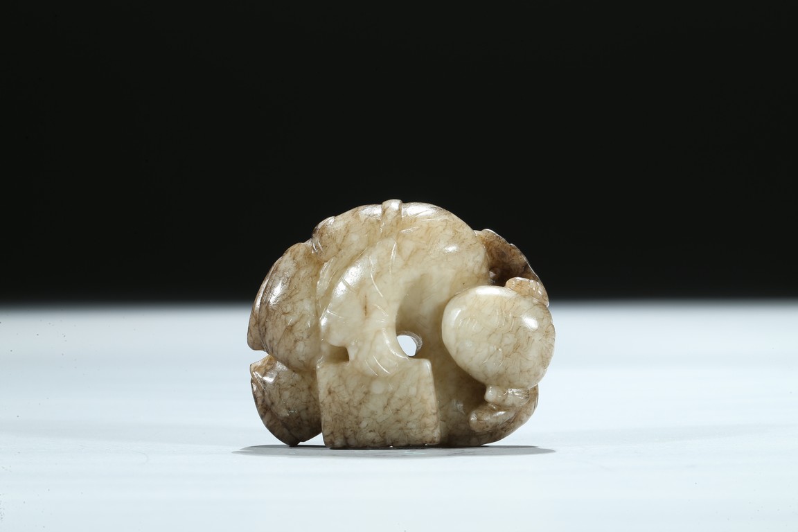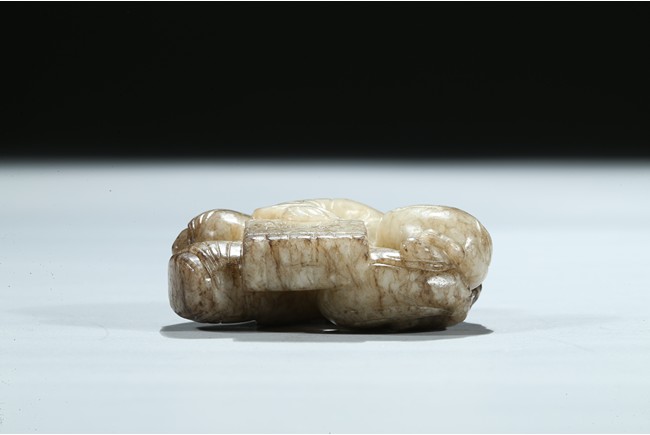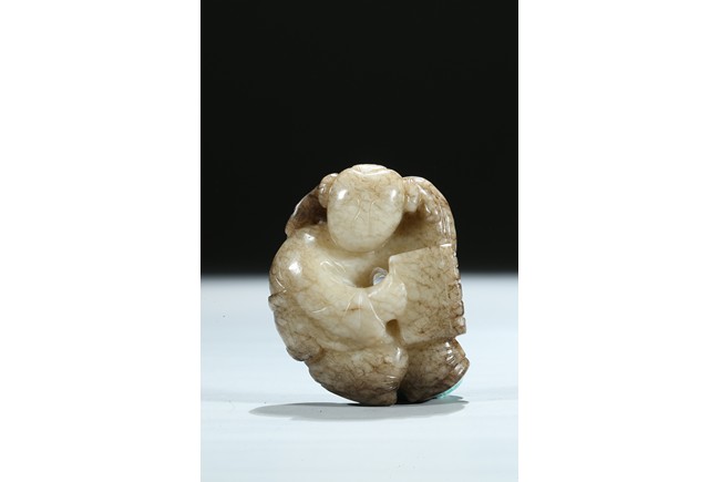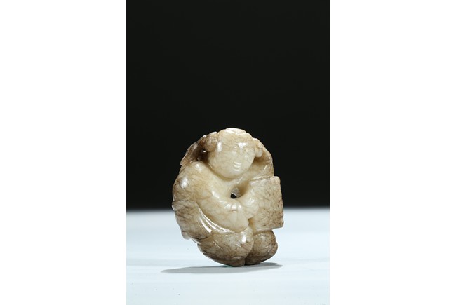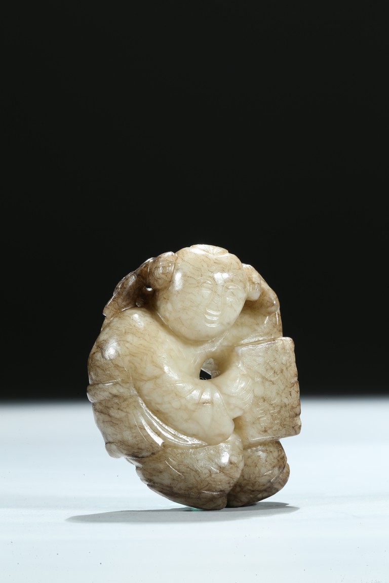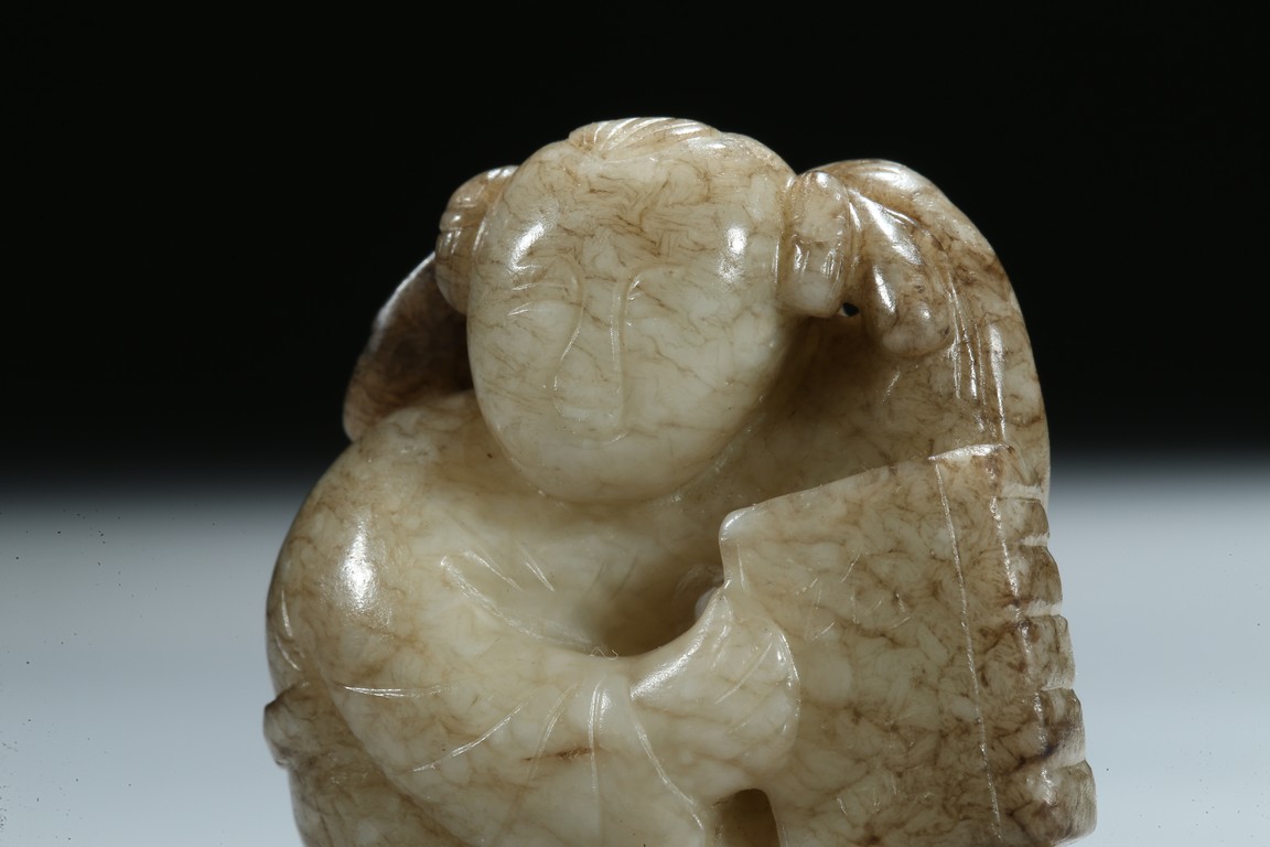 The boy is shown with one hand holding the book the Analects by Confucius, his left hand against his forehead, the face with joyful expression, the stone is of opaque white tone with grey veins and inclusions. Qing Dynasty period.