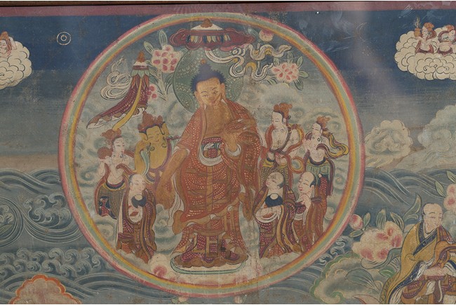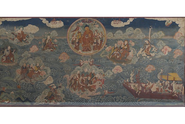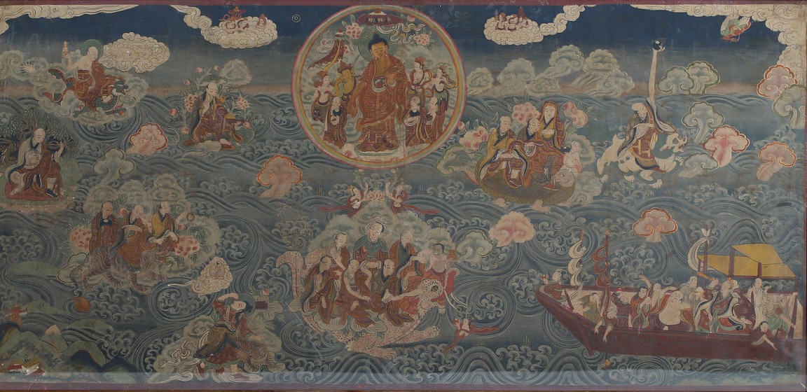 The horizontal thangka depicting luohan figures crossing the turbulent ocean by various means, at the center with a medallion enclosing a standing bodhisattva surrounded by attendants upon the clouds, watching over the luohans down below. Mid-Qing Dynasty period.