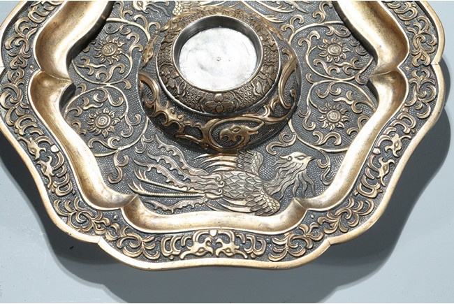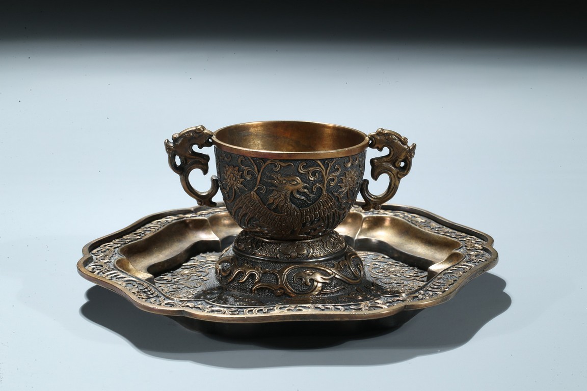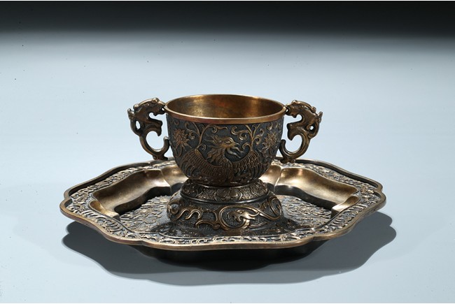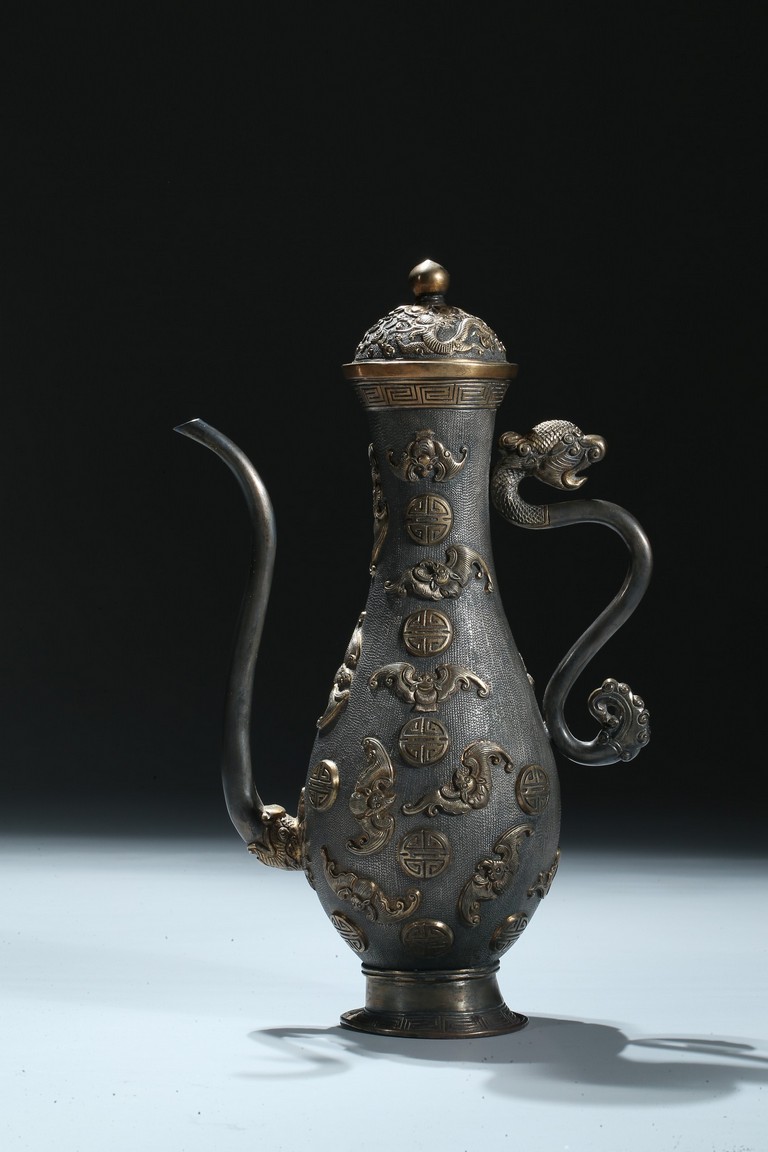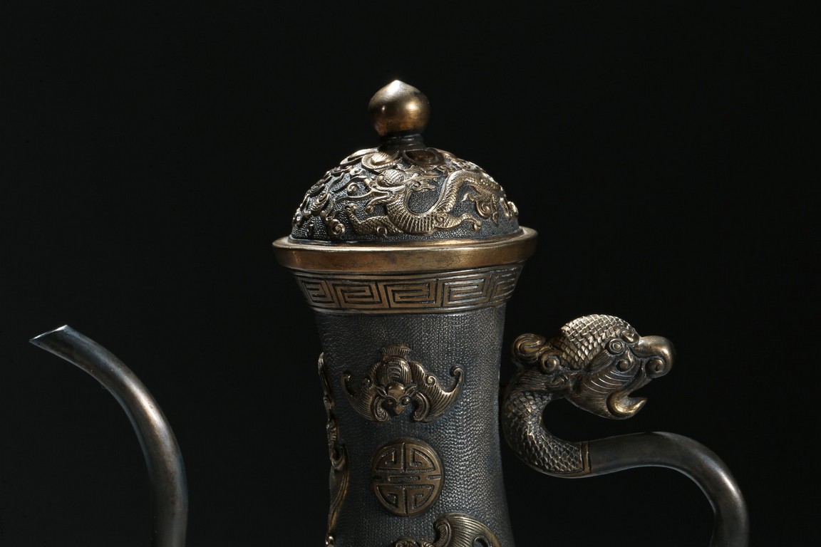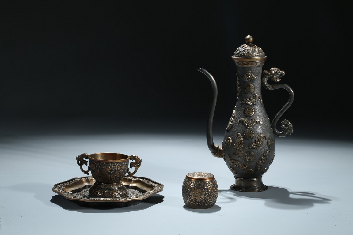 Comprising of a tall and slender teapot, a two beast handled cup, a lobed cup tray, and a barrel-form tea caddy, all gilt decorated on silver ground with various auspicious motif and pattern. Qing Dynasty period.