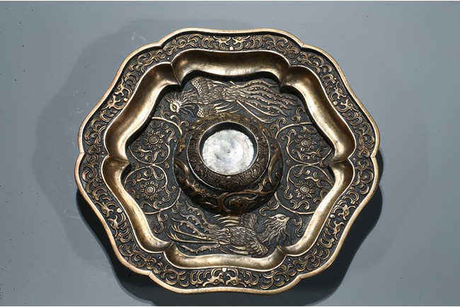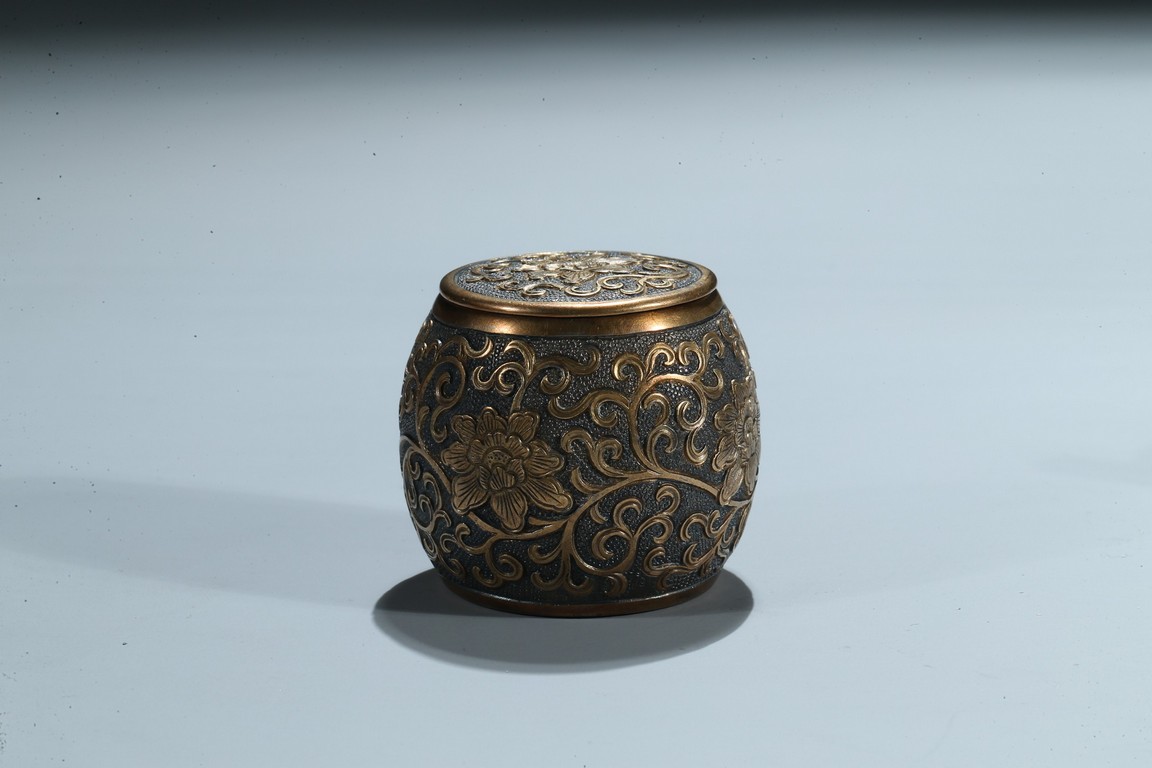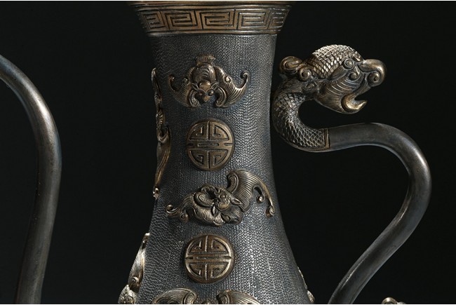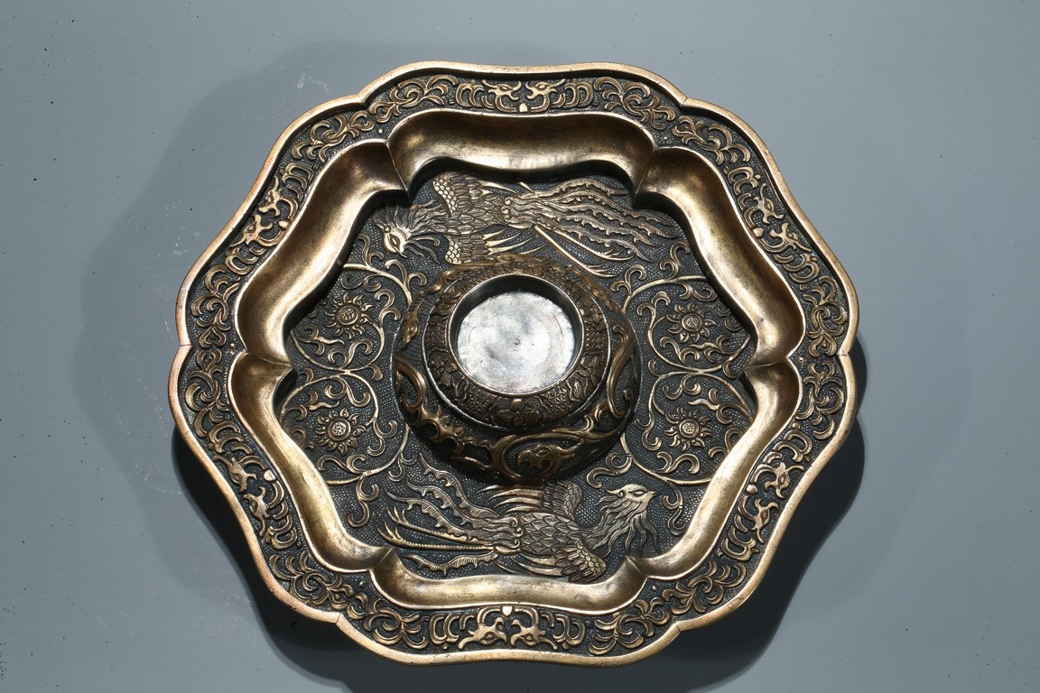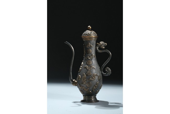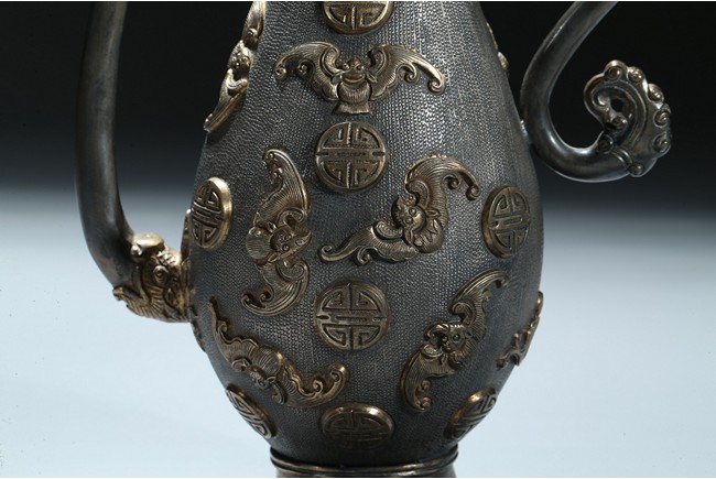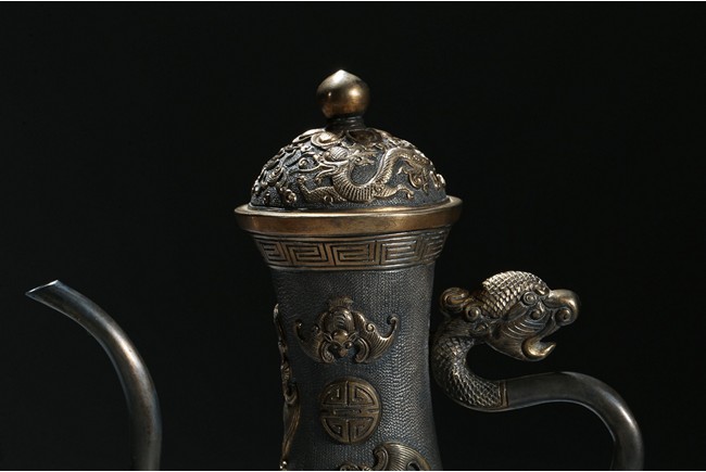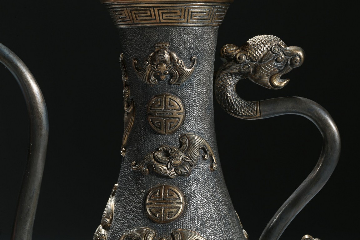 Comprising of a tall and slender teapot, a two beast handled cup, a lobed cup tray, and a barrel-form tea caddy, all gilt decorated on silver ground with various auspicious motif and pattern. Qing Dynasty period.
