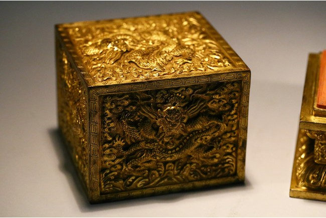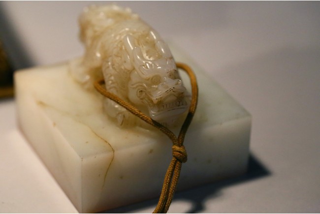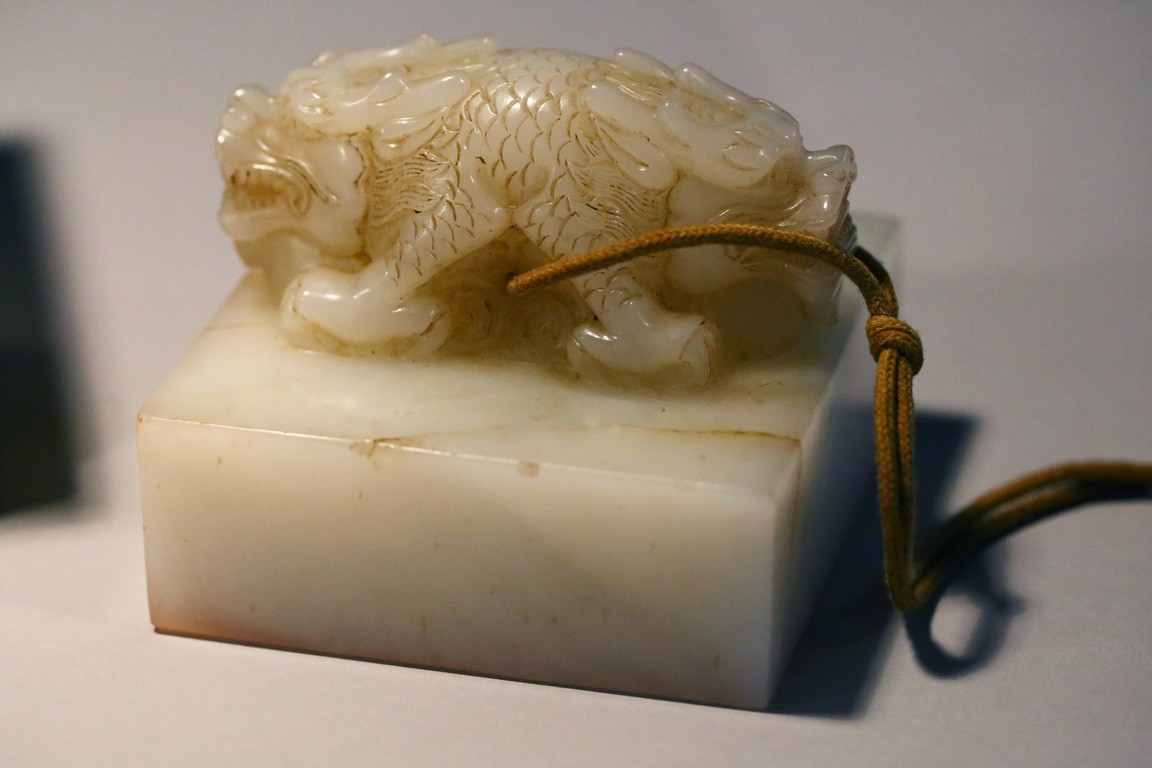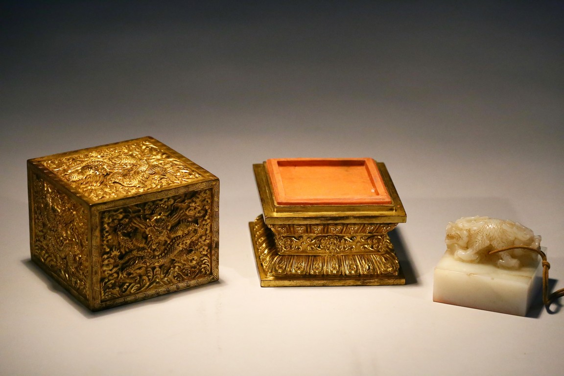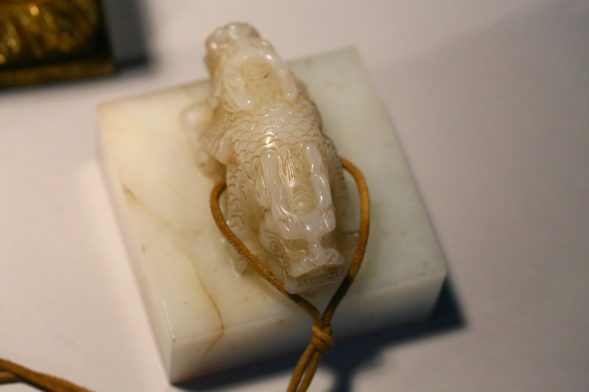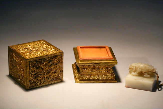 璽,王者印也。皇帝的印章稱之為“璽”,在中國古代,璽是皇權的象徵。中國的“璽制”自秦始皇嬴政始,到明清兩代逐漸趨於系統和完善。清乾隆時期,鑒於乾隆皇帝創新多元的獨特的藝術品位和對璽印的喜愛,其製作寶璽數量之多在歷代帝王中無人能及。璽印的發展史,乃是歷史發展的有力見證。璽印的材質選擇,都是與篆刻密切關聯的,因此璽印的歷史也是一部篆刻藝術史。他的發展在繼承前代的基礎上不斷創新。由於乾隆皇帝經歷了18世紀全過程,在這時是中國玉文化及璽印文化發展的鼎盛時期,大量的新疆和闐玉質材運至皇宮供宮廷造辦處玉作大量創新推出玉質器物及璽印作品。此方“白玉雕交龍鈕玉璽”(鴻書大印)以新疆和闐白玉為質,碩大,質細膩溫潤潔白屬優質材,以刀代筆洗練流暢雕兩條交龍為鈕,形象生動有威狀。印文漢書體遒勁有力,品鑒後質材是和闐白玉,印文字體相符精細,交龍鈕刀工流暢,十分難得,為清代玉璽之精品。另配銅鎏金龍紋印璽蓋盒。來源:紐約資深藏家提供 Provenance: Private collection, New York