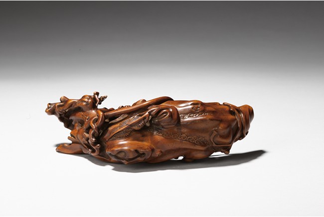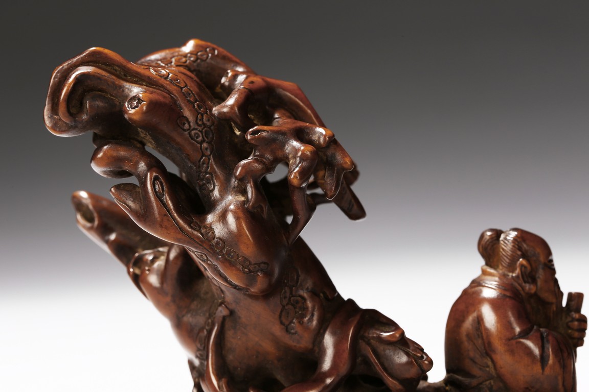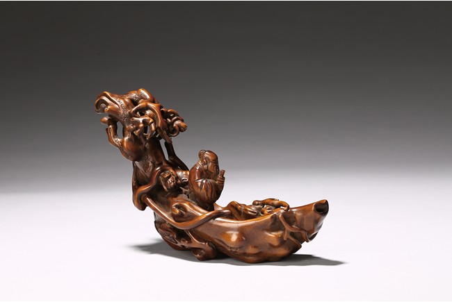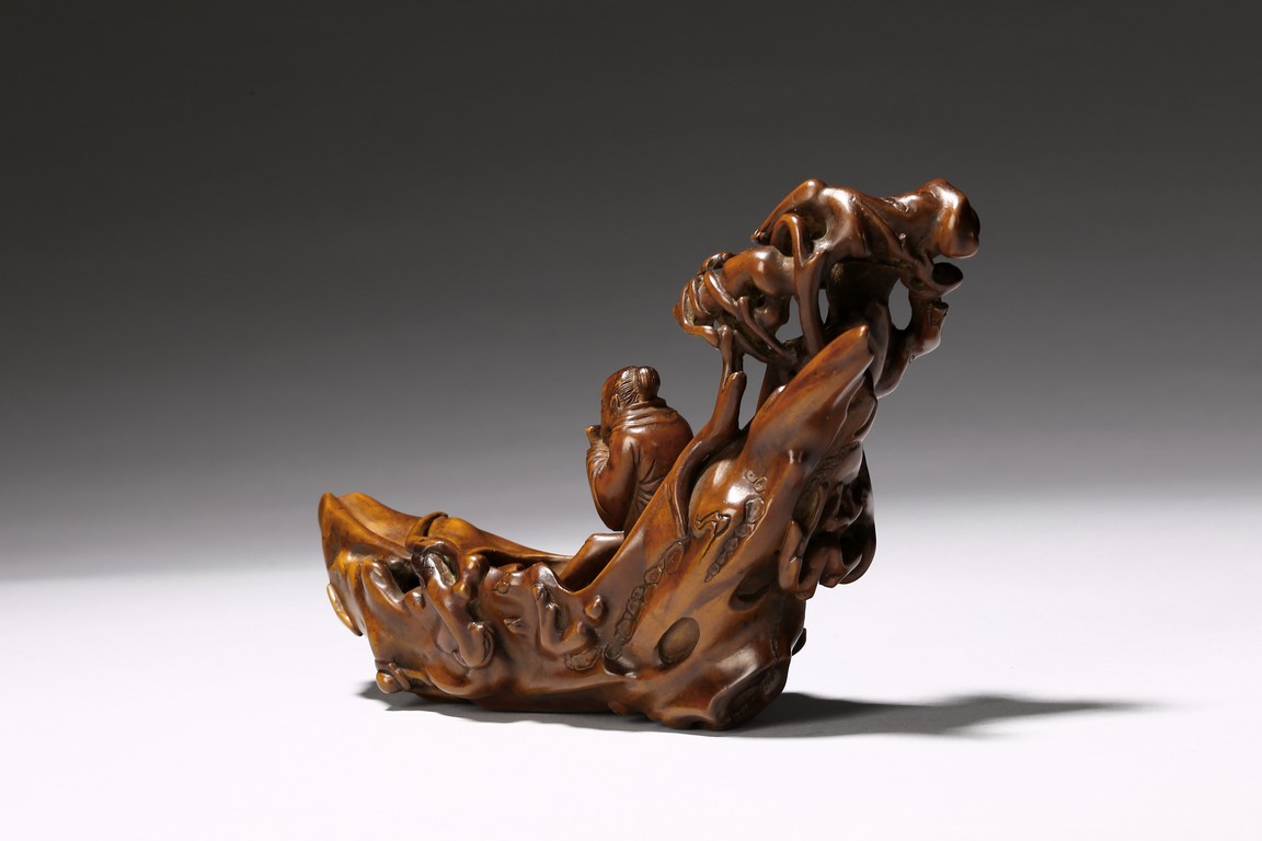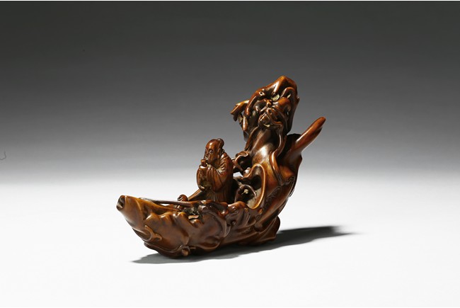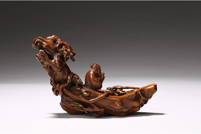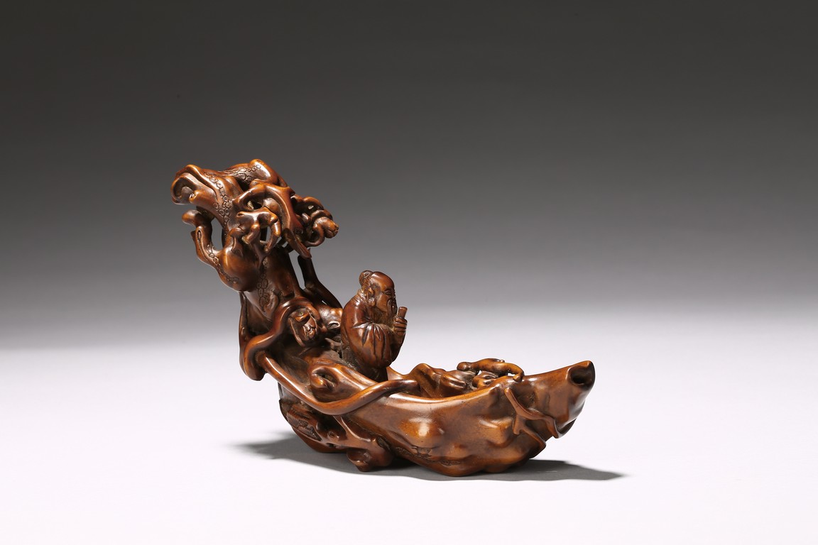 Finely carved to show an elderly figure standing in a crescent formed boat, elaborately adorned with intertwining pine branches. Qing Dynasty period.