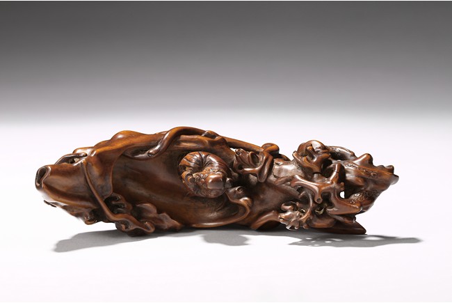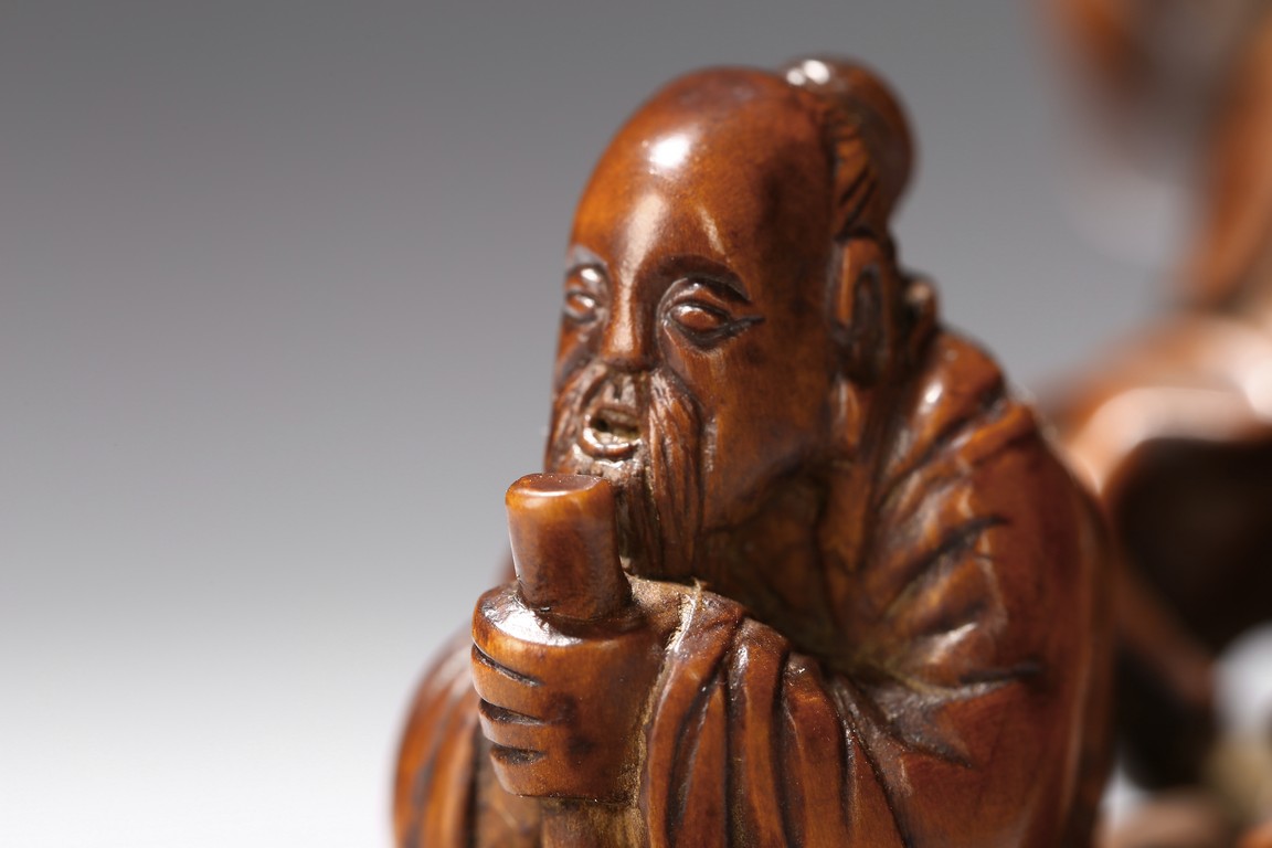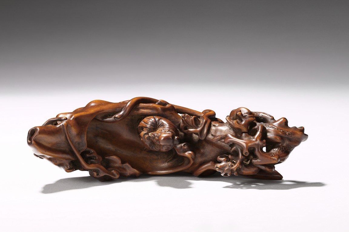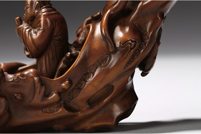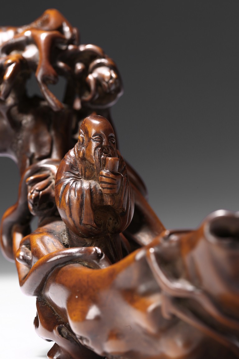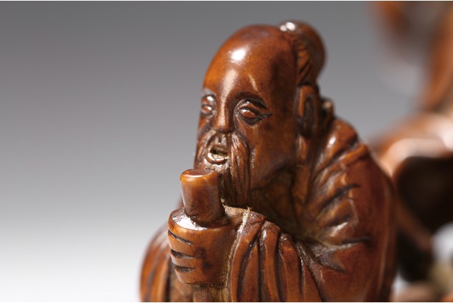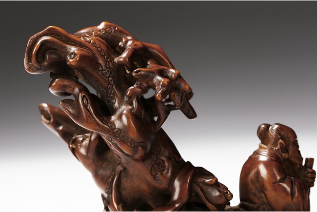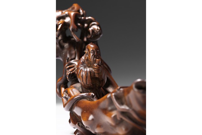 Finely carved to show an elderly figure standing in a crescent formed boat, elaborately adorned with intertwining pine branches. Qing Dynasty period.