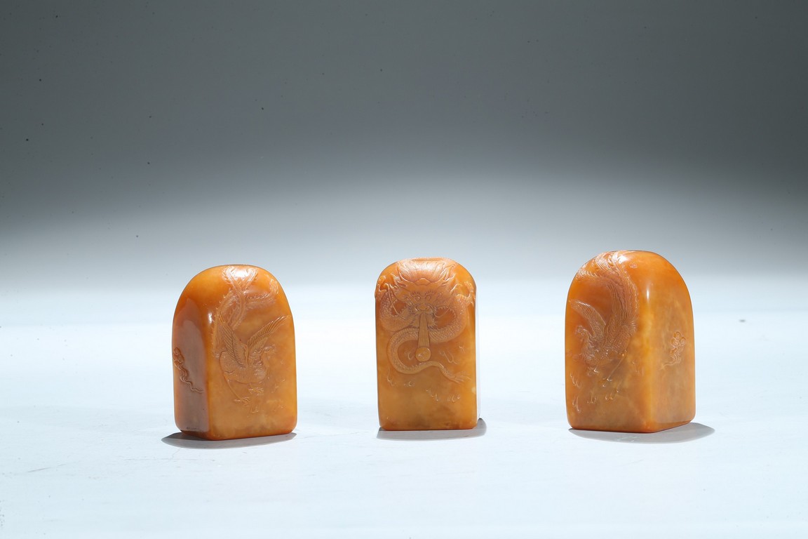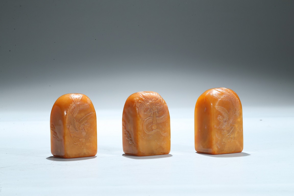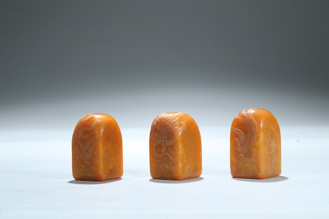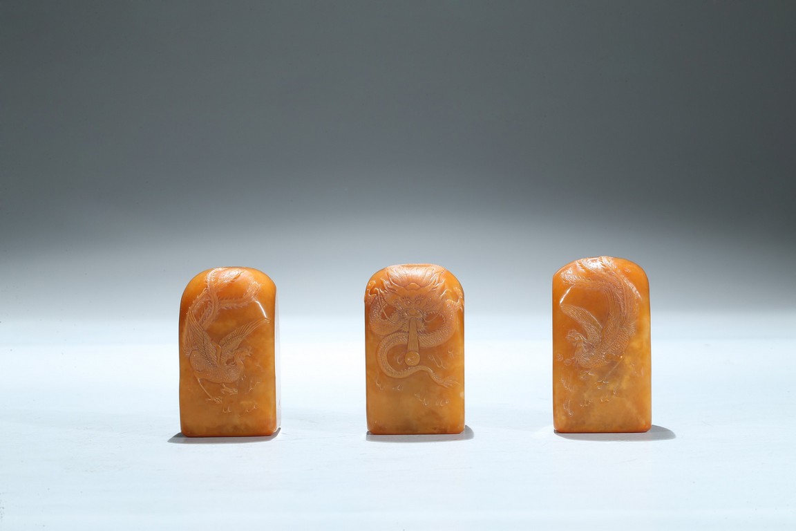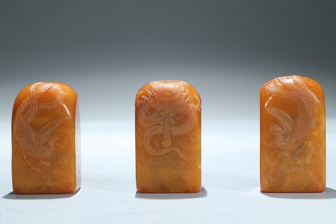 Consisting of three delicately carved rectangular seals, one carved with dragon, the other two carved with phoenix in shallow relief. All three seals face carved with characters.