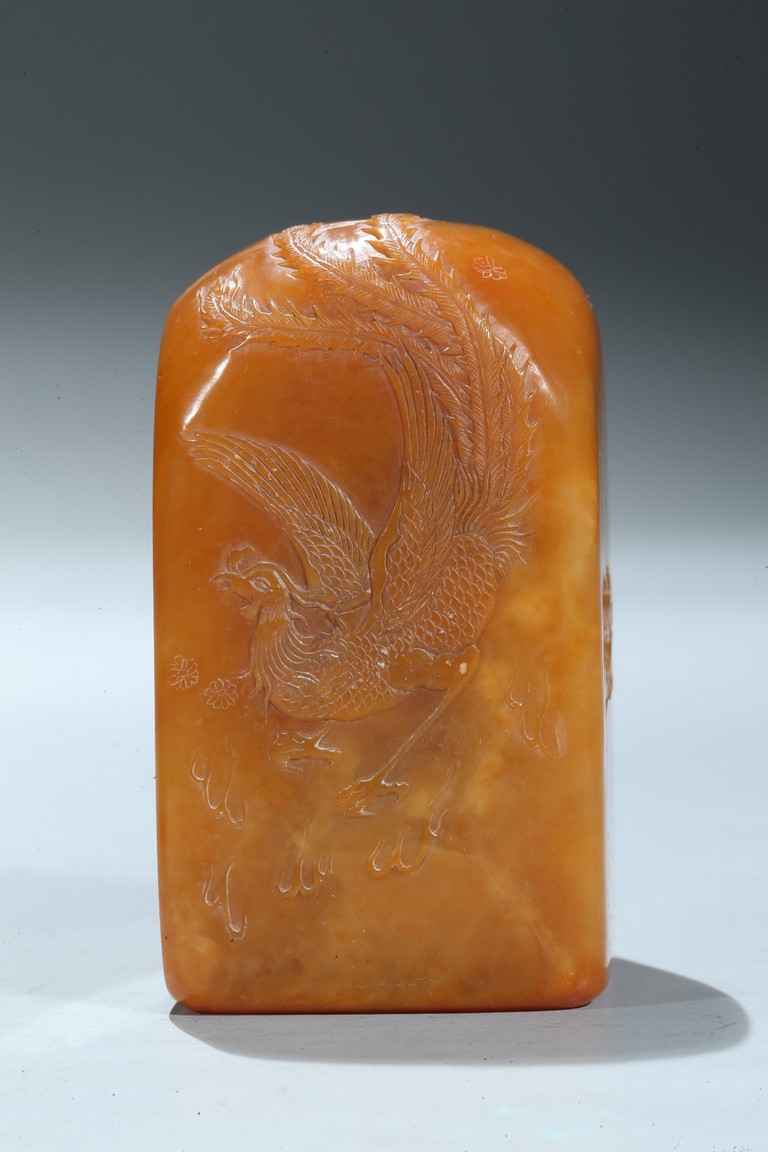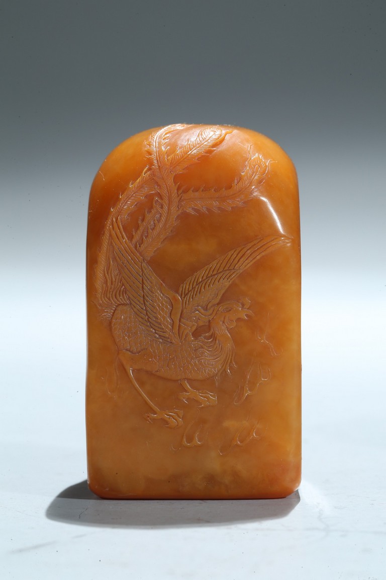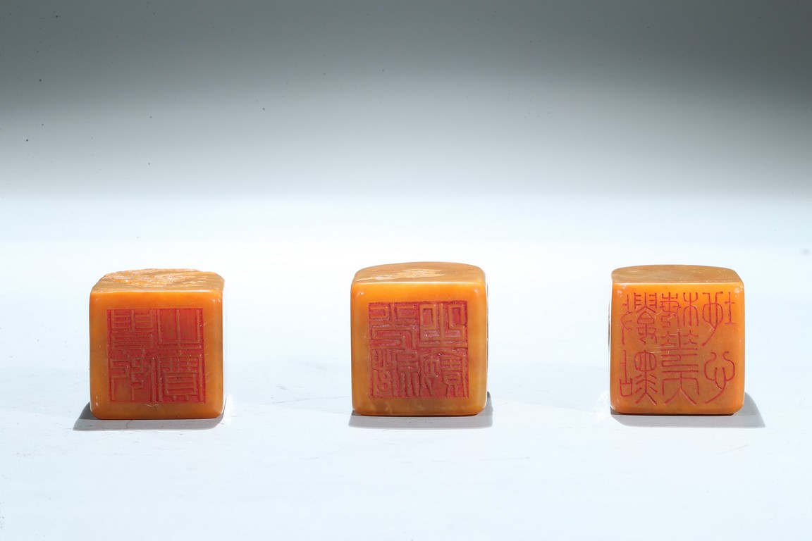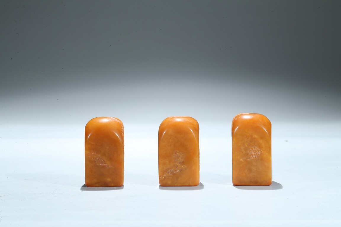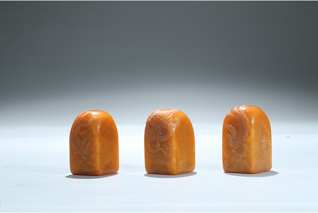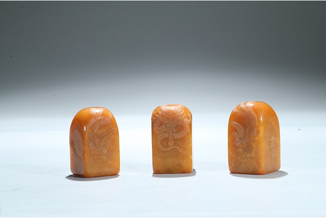 Consisting of three delicately carved rectangular seals, one carved with dragon, the other two carved with phoenix in shallow relief. All three seals face carved with characters.
