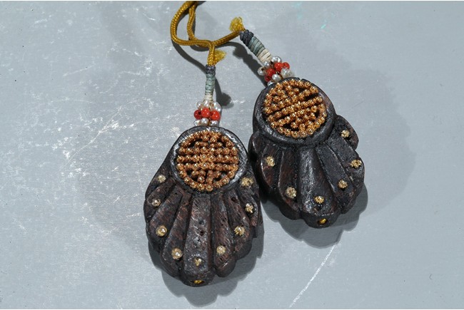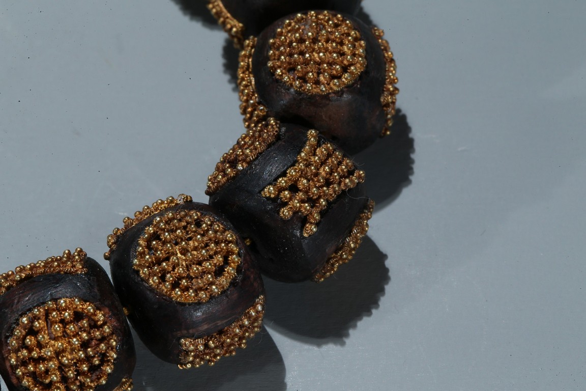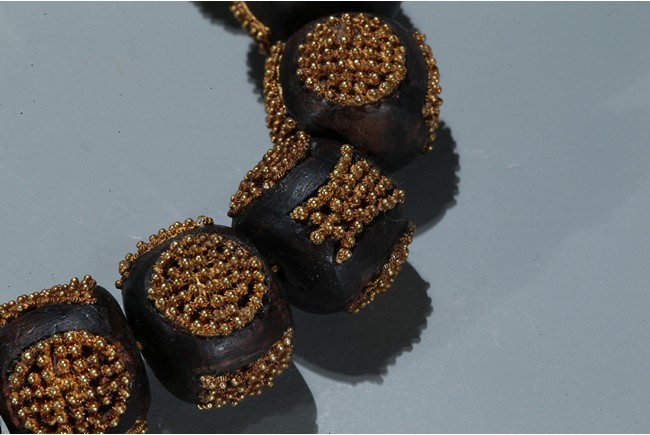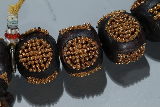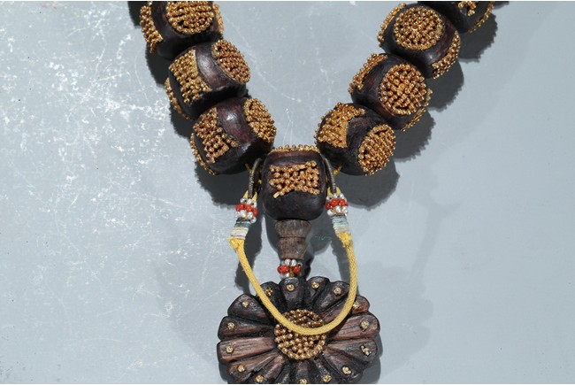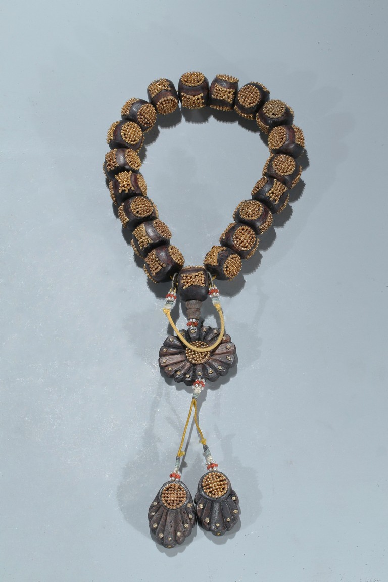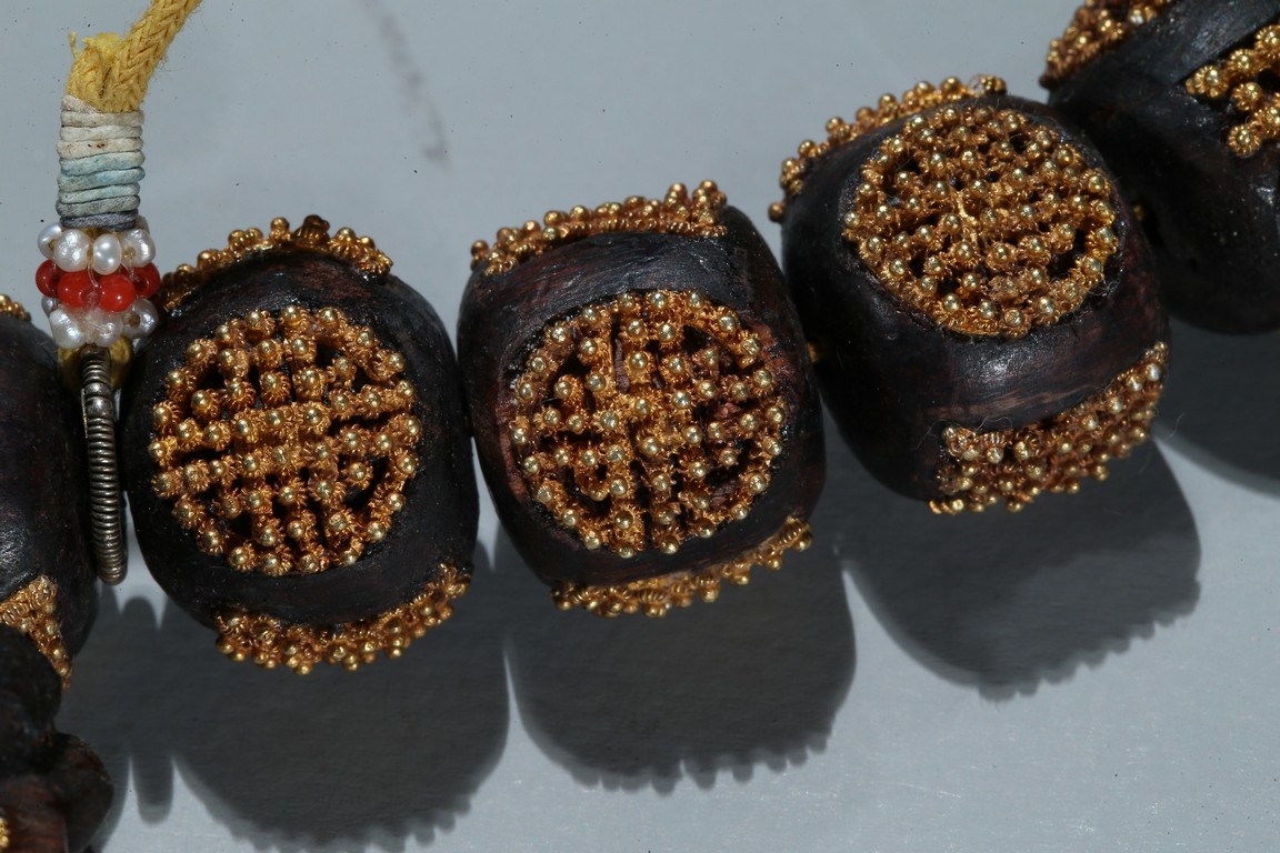 此手串由迦楠打磨成形後,雕出“壽”字圖樣,再鑲以用炸珠法製成的小金珠,沉香質地堅硬,金珠小如粟米,製作起來十分費工。手串做工精細,珠粒渾圓飽滿,大小均勻無差,佛頭塔和墜子上亦嵌金珠,用料上乘,非宮廷製器而不可為,珍罕非常。