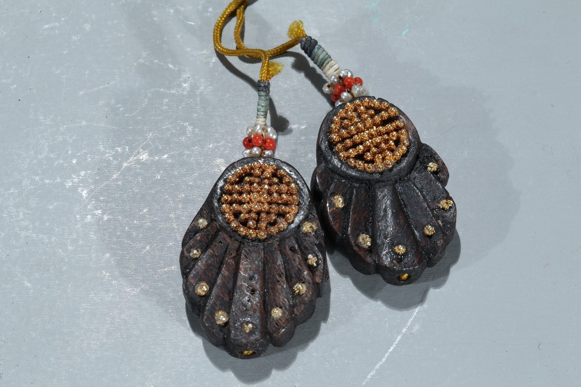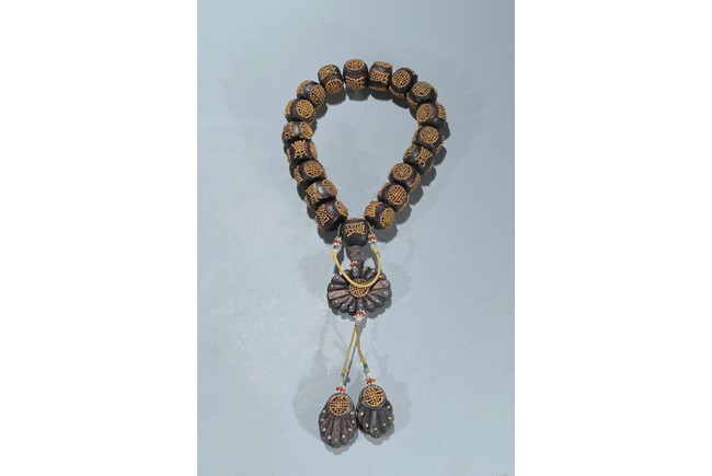 Composed of twenty well-polished rounded agarwood beads, each finely inlaid with tiny gold beads with stylized Shou character and roundels, one of them joined by a decorated strand composed of a agarwood shou character roundel, further suspended with two smaller drop-shaped agarwood, all inlaid with tiny gold beads. Qing Dynasty Qianlong period.