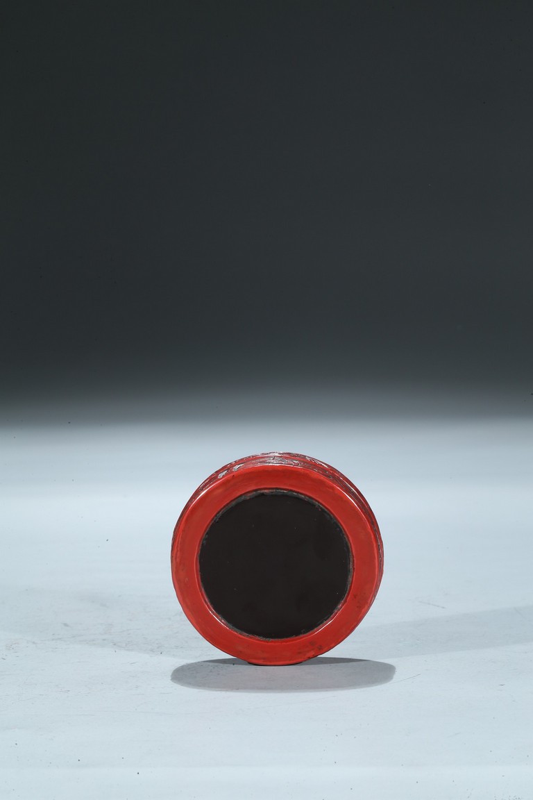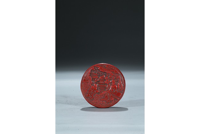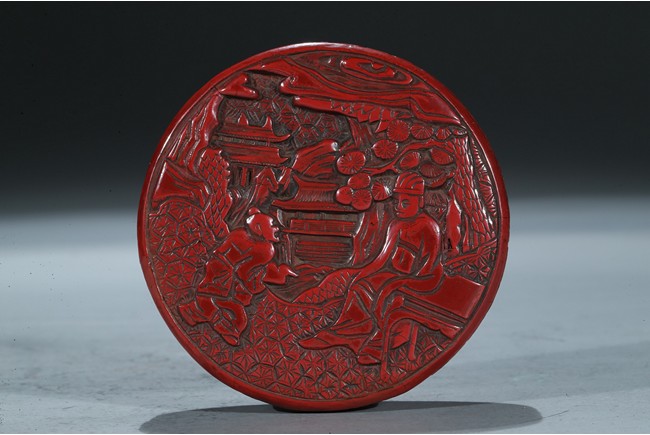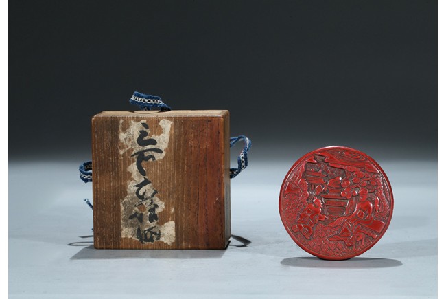 Of circular form, the box cover is finely carved well carved through the thick cinnabar lacquer to depict a literati figure sitting on a chair listening to his young attendant , with pine tree and pavilions in the background. the sides carved with stylized leaf scroll. Accompanied with a Japanese wood box. Ming Dynasty period.