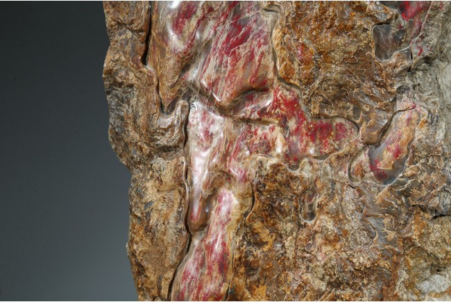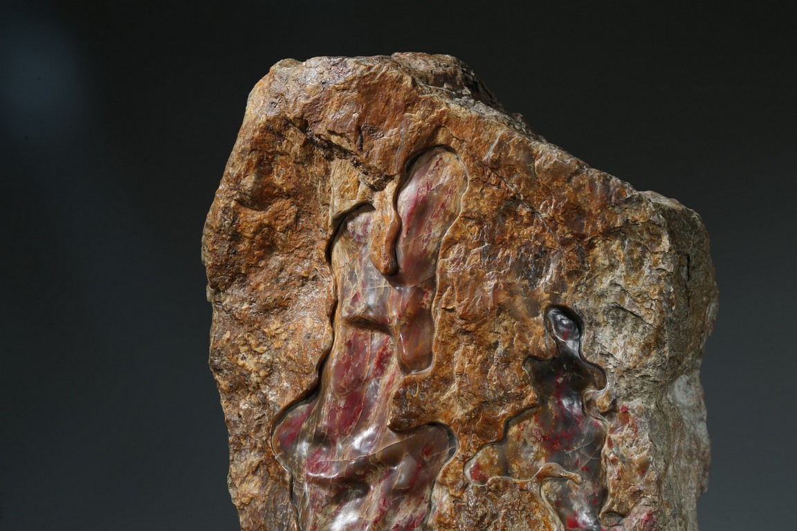 Of naturalistic irregular form, this rare large upright boulder with ochre tone skin exposed to reveal the inside bright red 'chicken-blood' inclusions. 'chicken-blood' is one of the most valued material in Chinese culture, and red is traditionally considered symbolic of good luck, soapstone of this color was gifted on occasions of marriage, birthdays, promotions and success.