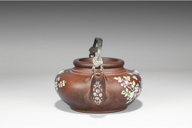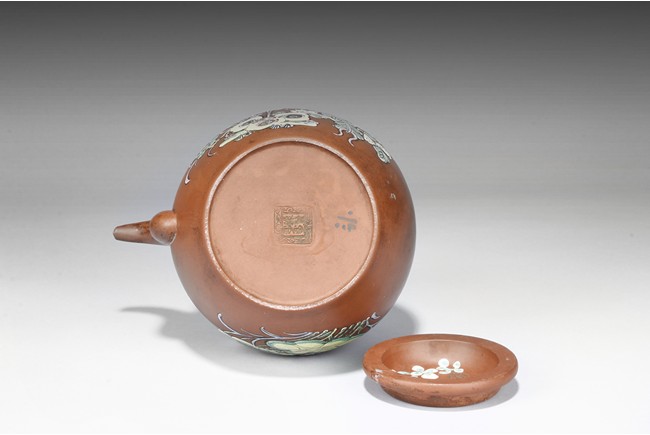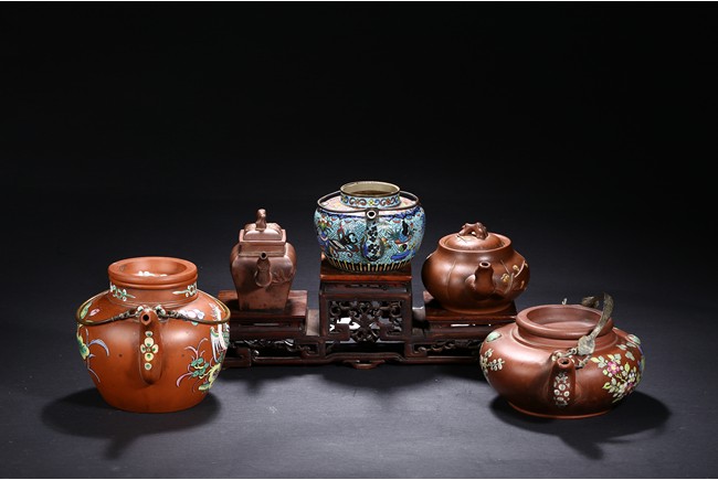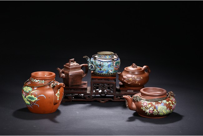 Consisting of five Yixing zisha teapots of various shape and decorations. Qing/Republic period.