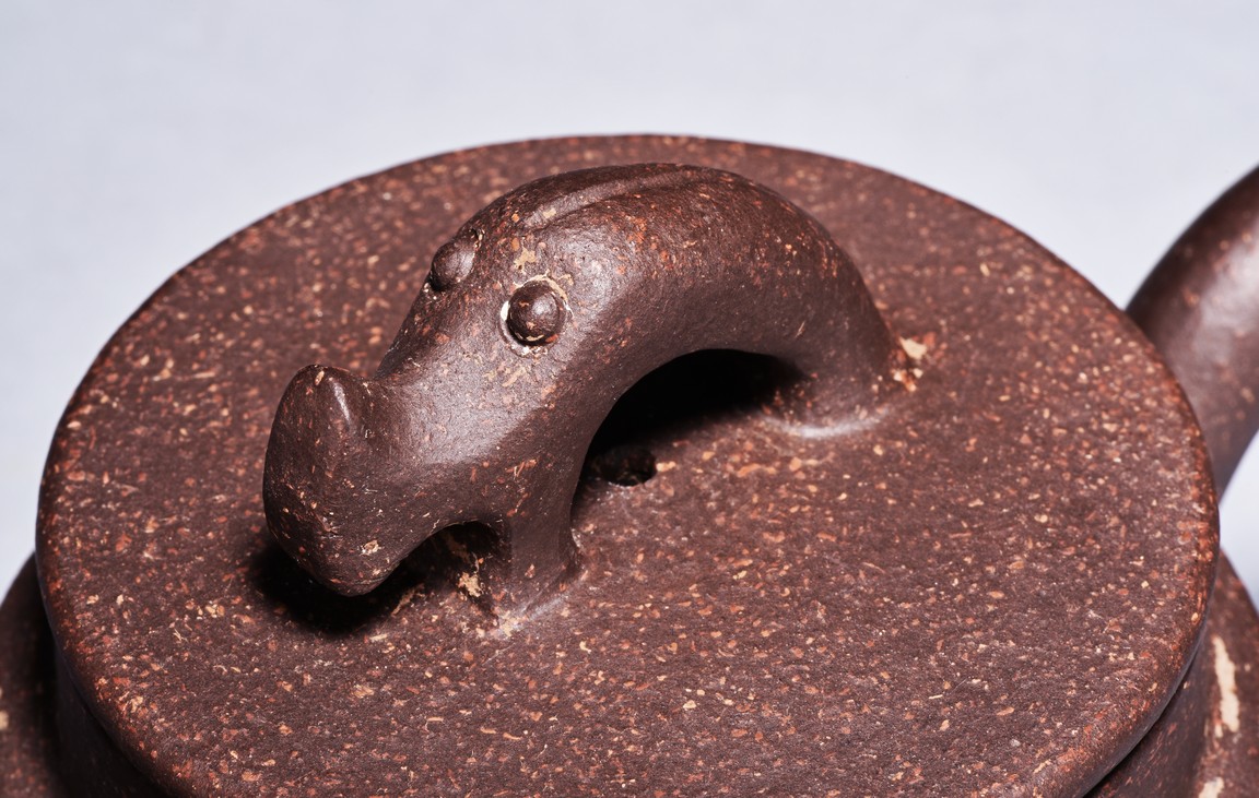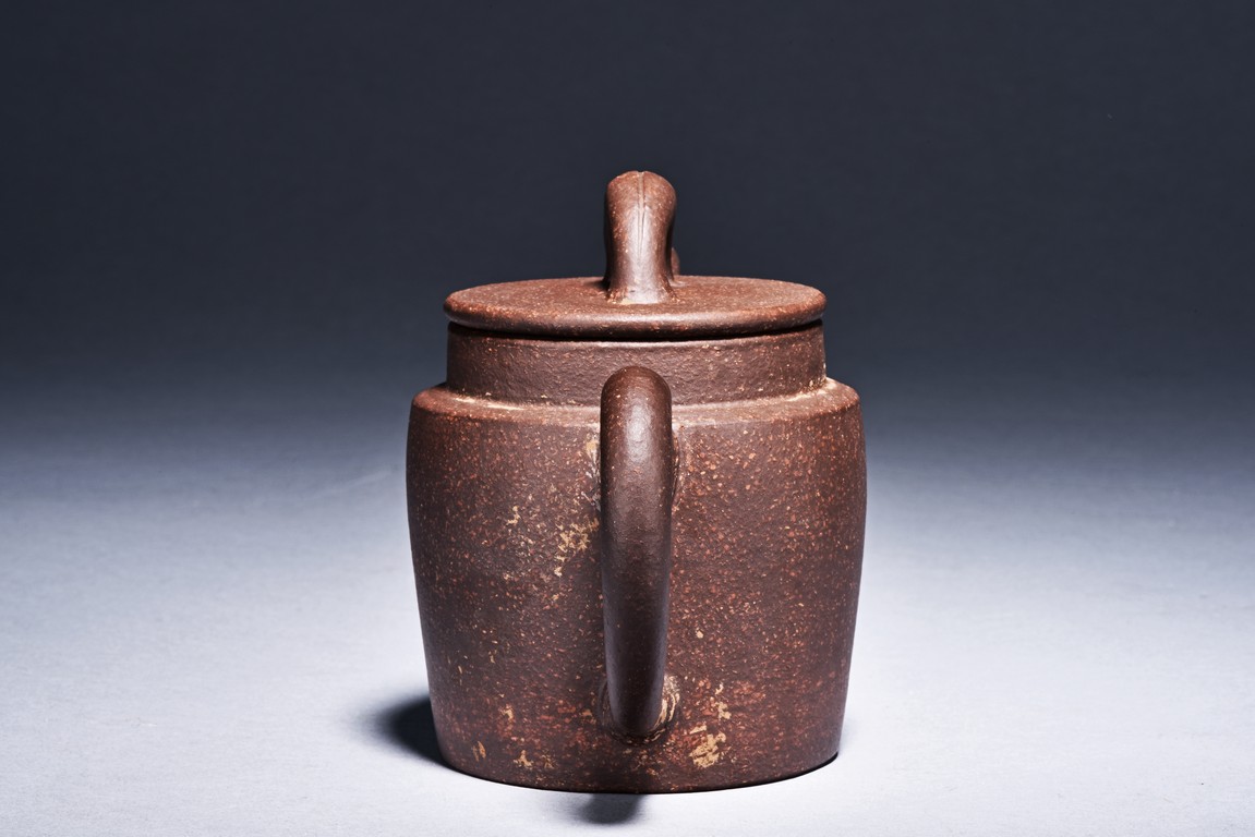 Of cylindrical and rounded section,with looped handle,curved spout,and cover topped with looped handle. Bottom incised with four character Yao Hua Cang Qi. Qing Dynasty period.
