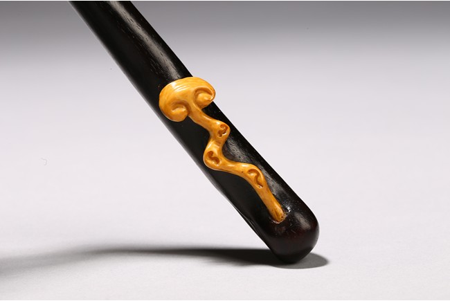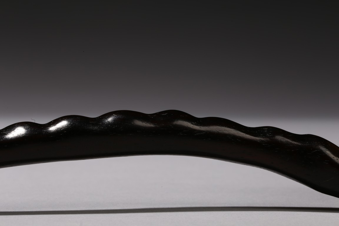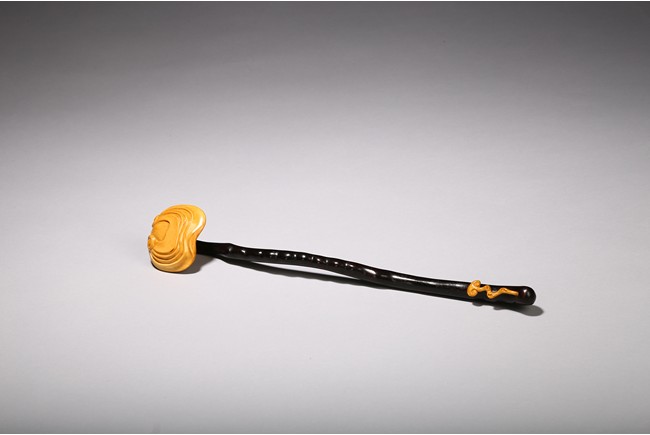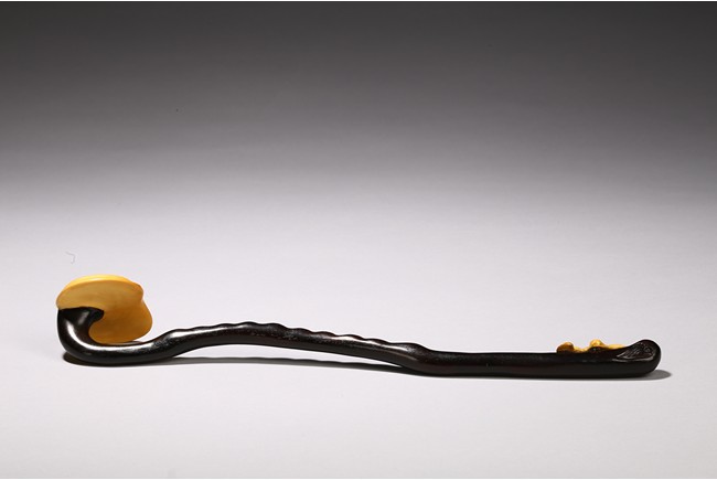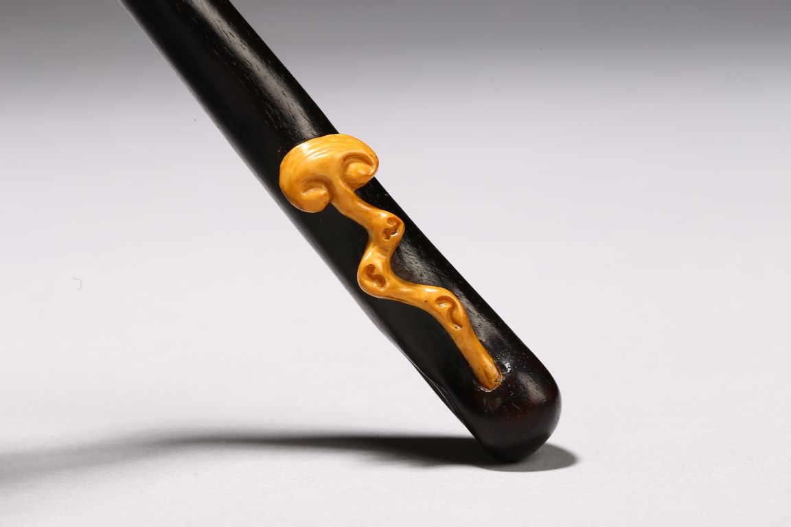 The ruyi head is carved out of bone to depict a lingzhi head, with zitan carved lingzhi stem forming the handle, the lower end further carved with a small bone carved lingzhi branch. Mid-Qing Dynasty period.