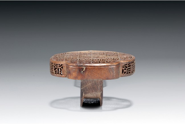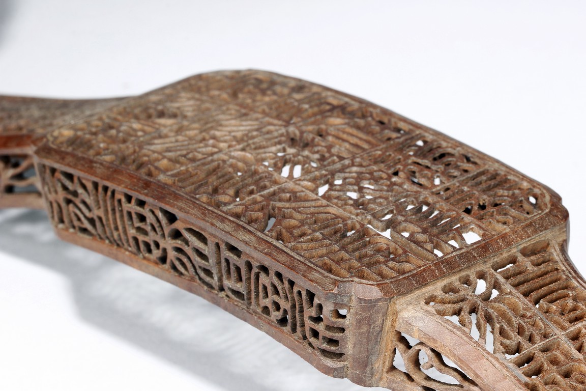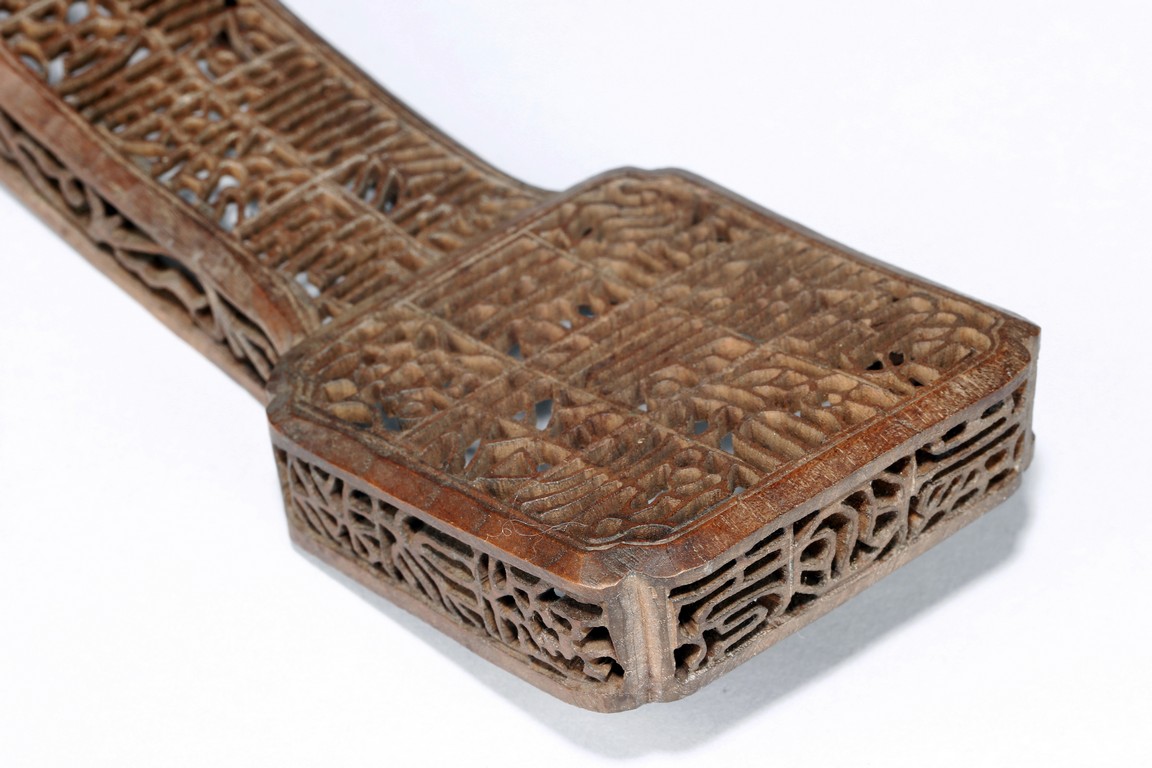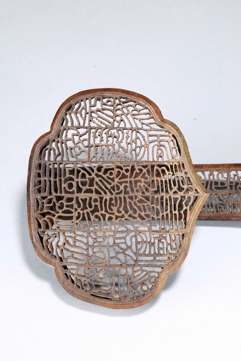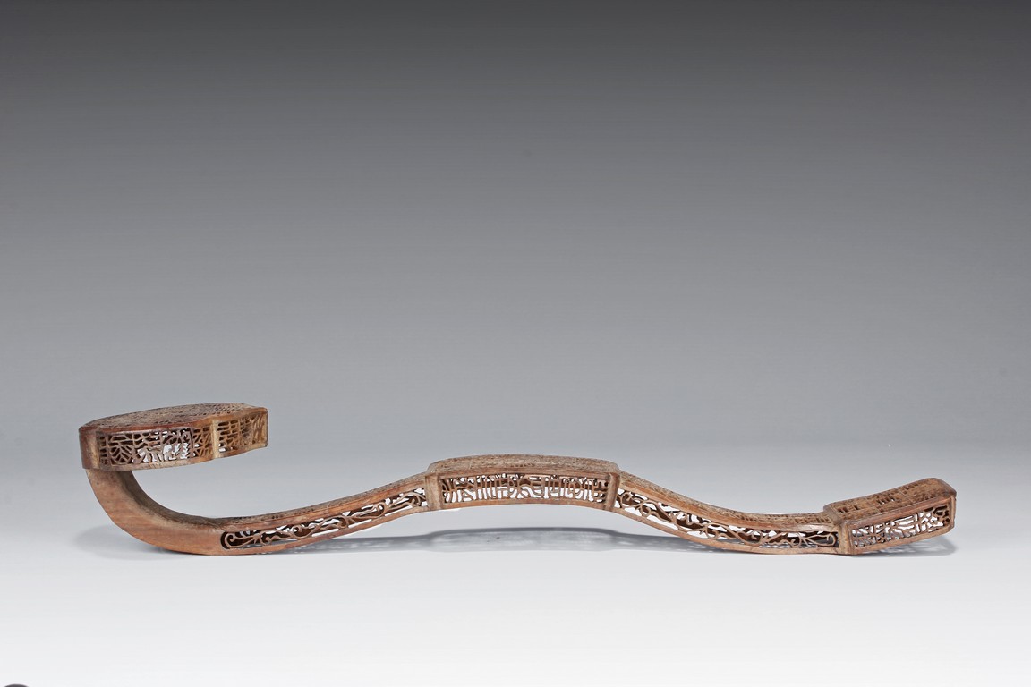 The ruyi-shaped head and the sides are carved and pierced in open work with intricate design in square sections. The arched handle,shaft,and tail are delicately carved with similar designs within the wood frames. Qing Dynasty period.