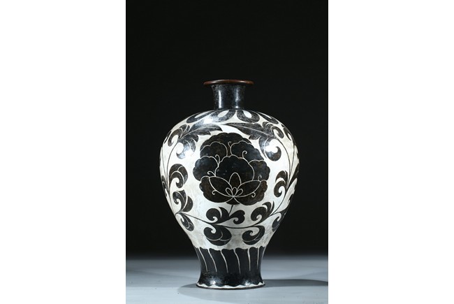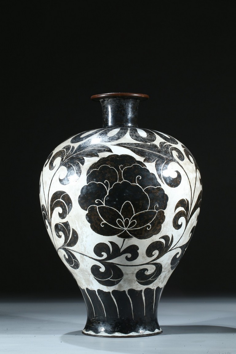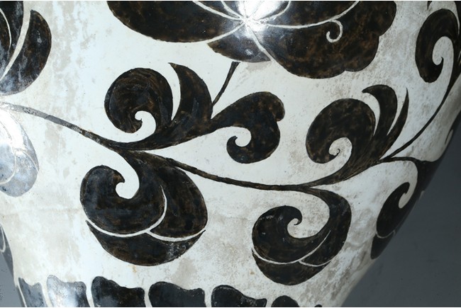 此銅胎白地黑花仿磁州窯梅瓶小口,短頸,豐肩,長腹下斂,通體繪仿磁州窯白地黑花花卉紋,畫工生動,用筆流暢,具有強烈的黑白對比效果,令人影響深刻。以銅胎仿磁州窯風格器物頗為少見,十分難得。
