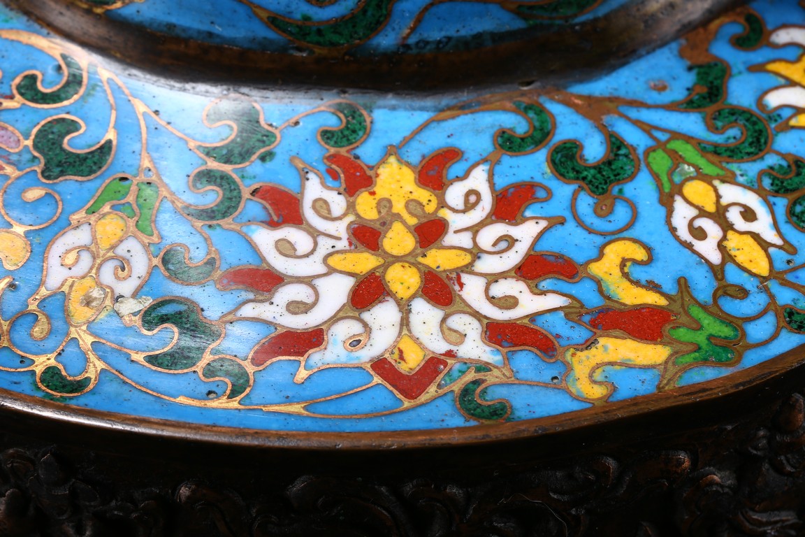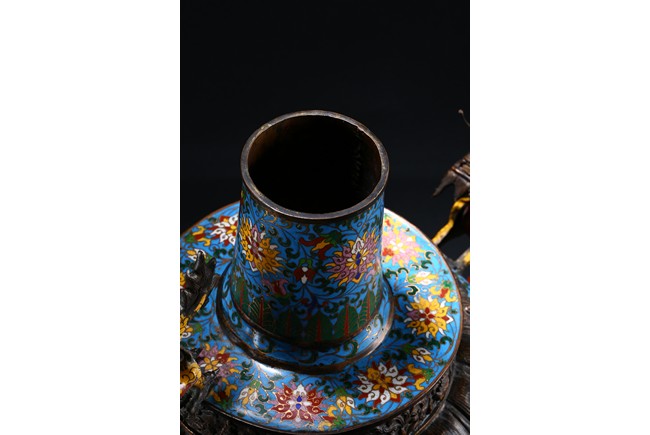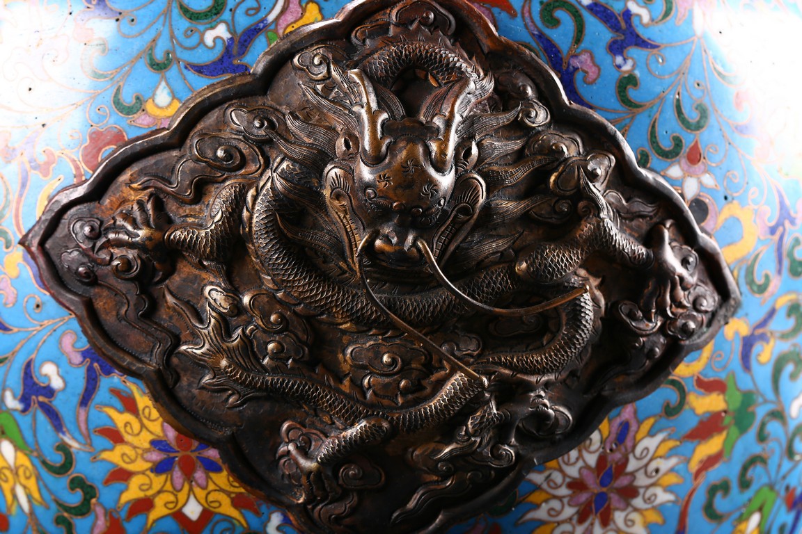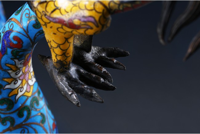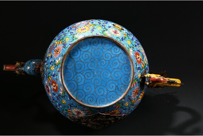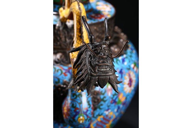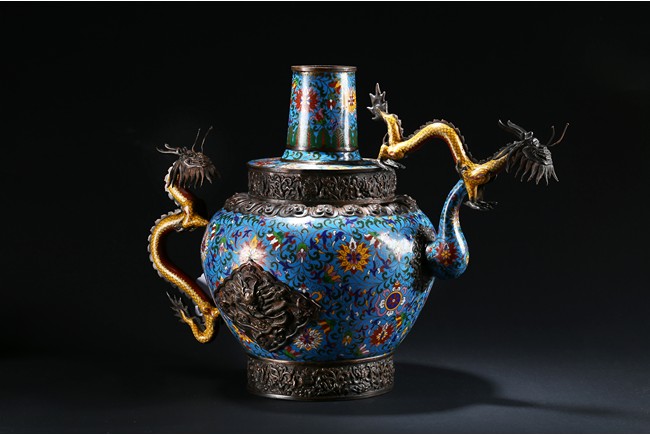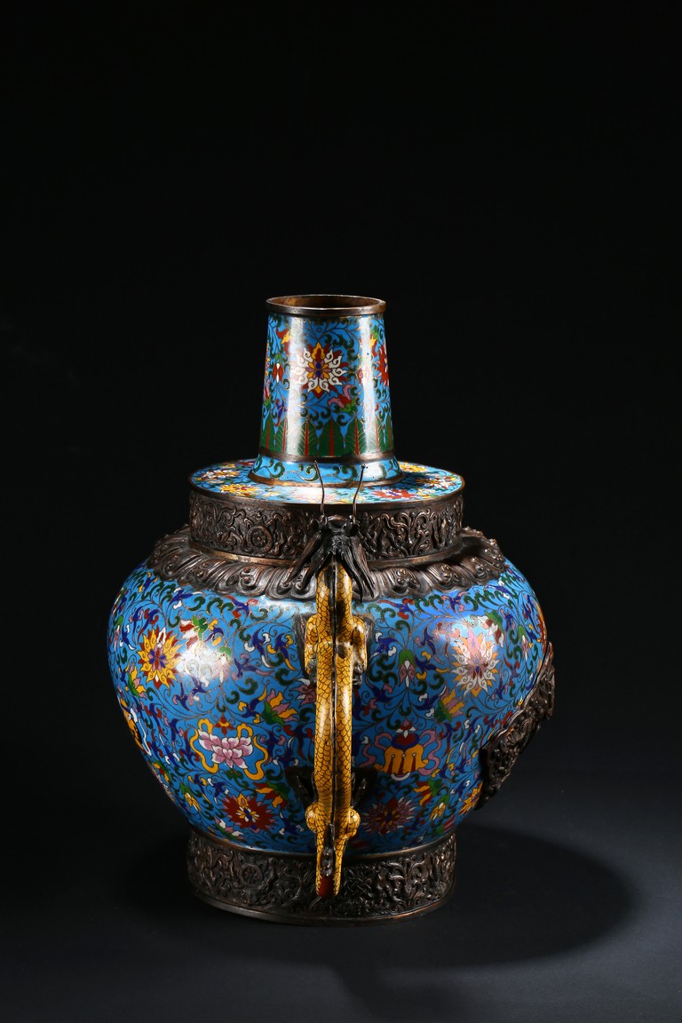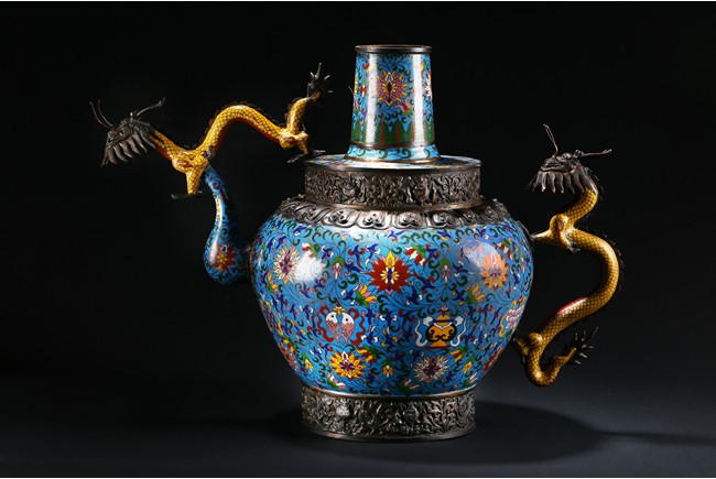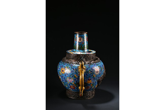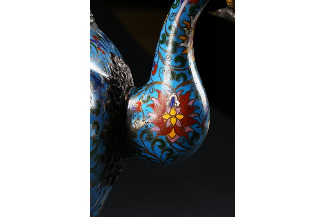 Of bulbous form, the body raises to a straight shoulder and long cylindrical neck, the body finely enamelled with lotus scrolls all against a bright turquoise ground, the front and reserve with raised dragon repousse panel, all below a raised lotus band encircling the shoulder, flanked by a pair of yellow enamelled curled dragon handle to one side, the other one covering the spout with detachable head. Late Qing Dynasty period.