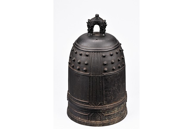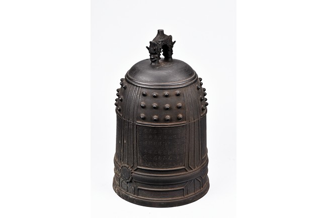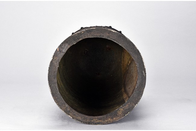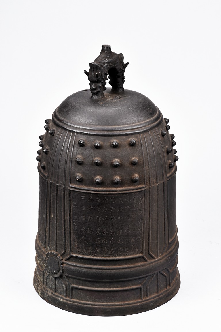Cast with an double mythical beast loop handle,the deep sides slightly flaring,the body decorated with raised stubs and incised with names of donors for establishment of an Buddhist temple. Republic period.