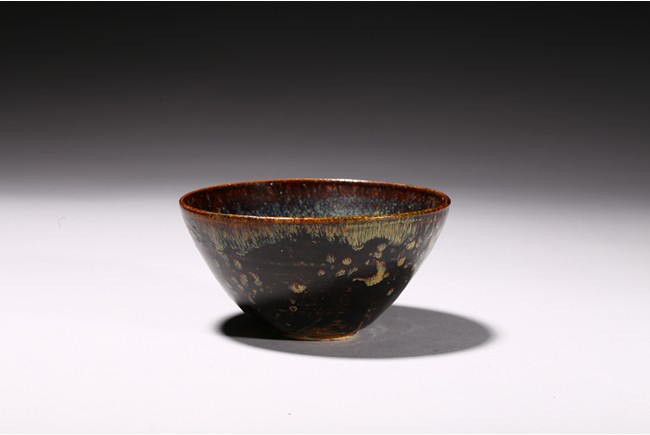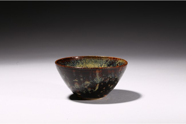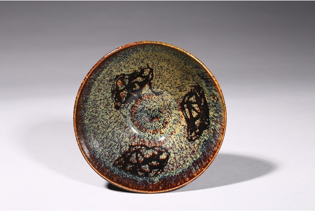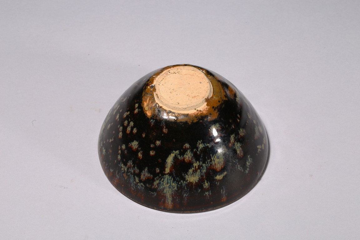 The deep rounded sides decorated to the interior with three papercut floral sprays,reserved against a mottled black ground suffused with milky-russet streaks,the exterior covered in a black glaze with yellowish russet splashes,stopping short of the foot to reveal the buff-colored body. Southern Song Dynasty period.
