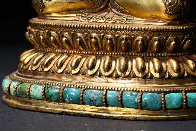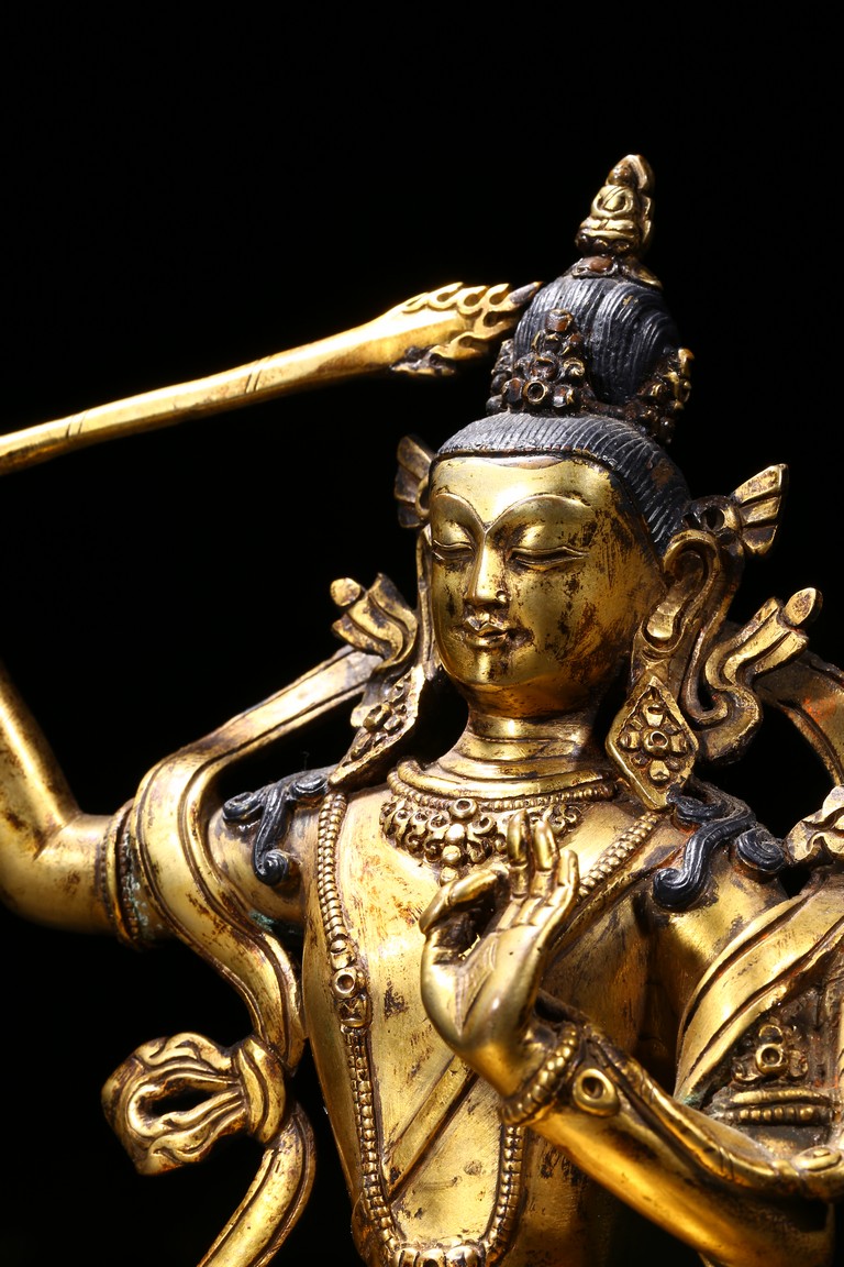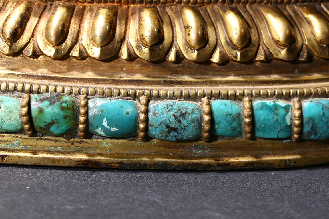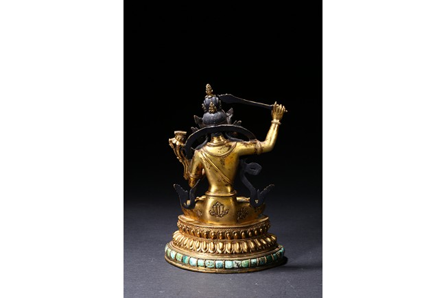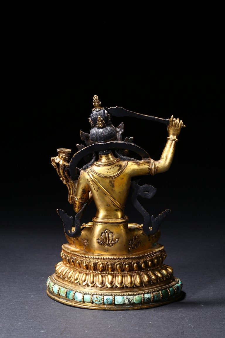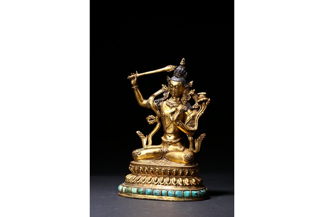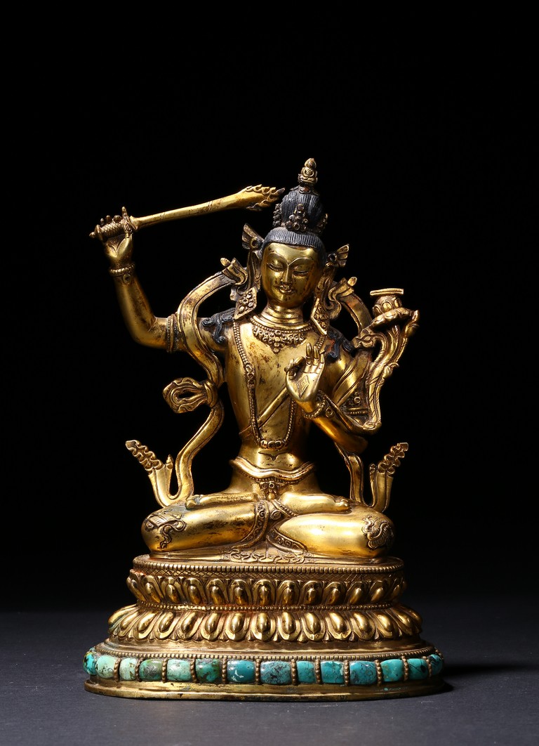 The manjusri seated in dhyanasana on a double lotus throne upon a further turquoise bead inlaid base,his right hand raised holding a sword,his left in karana mudra,his face with a serene expression and framed with pendant earrings,the hair tied up in a chignon surmounted with an ushnisha,wearing a dhoti and a number of necklaces and bracelets,his ankles and hip decorated with auspicious motif in repoussé. Qing Dynasty period.