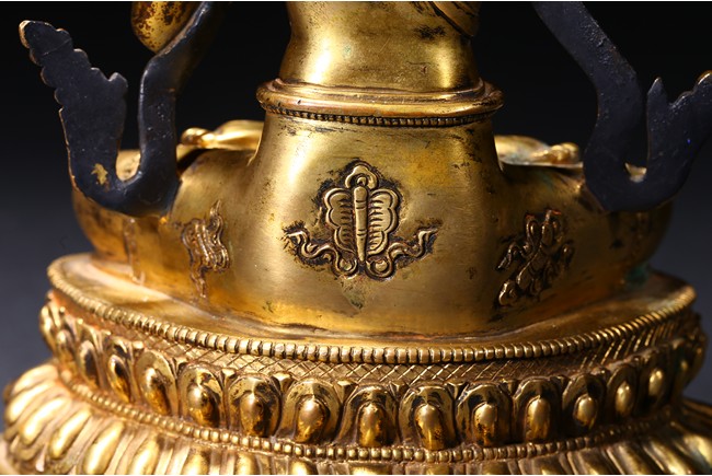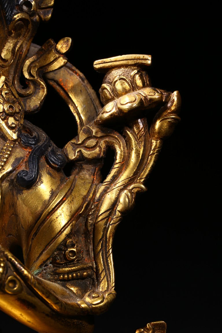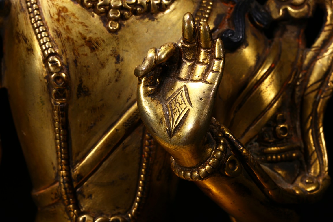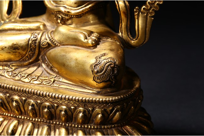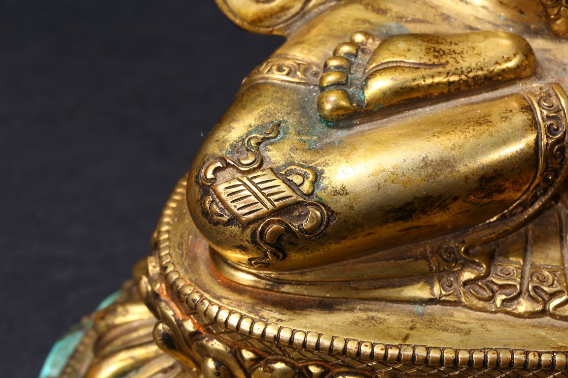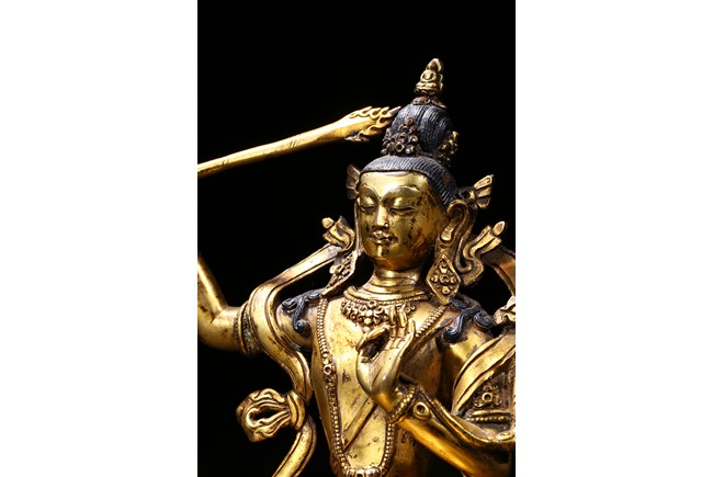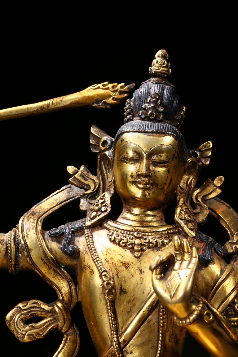 The manjusri seated in dhyanasana on a double lotus throne upon a further turquoise bead inlaid base,his right hand raised holding a sword,his left in karana mudra,his face with a serene expression and framed with pendant earrings,the hair tied up in a chignon surmounted with an ushnisha,wearing a dhoti and a number of necklaces and bracelets,his ankles and hip decorated with auspicious motif in repoussé. Qing Dynasty period.
